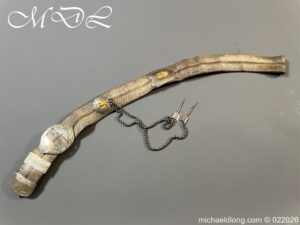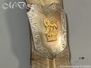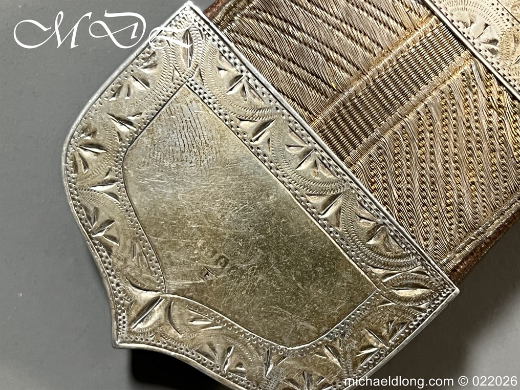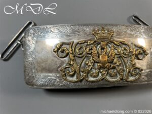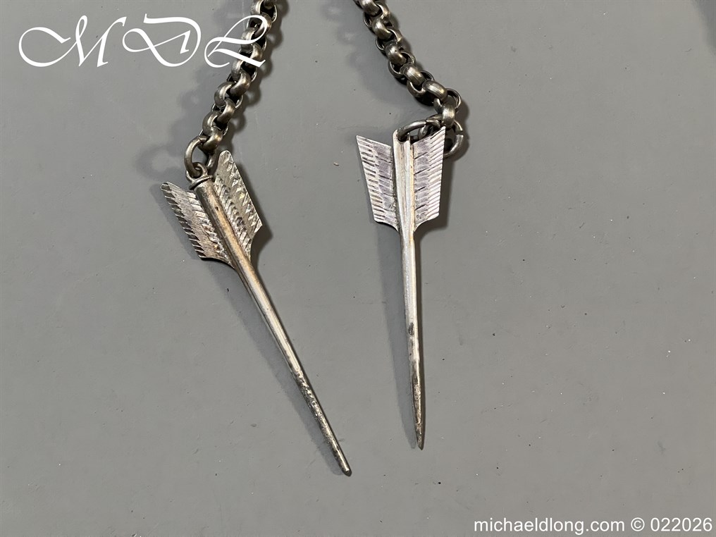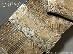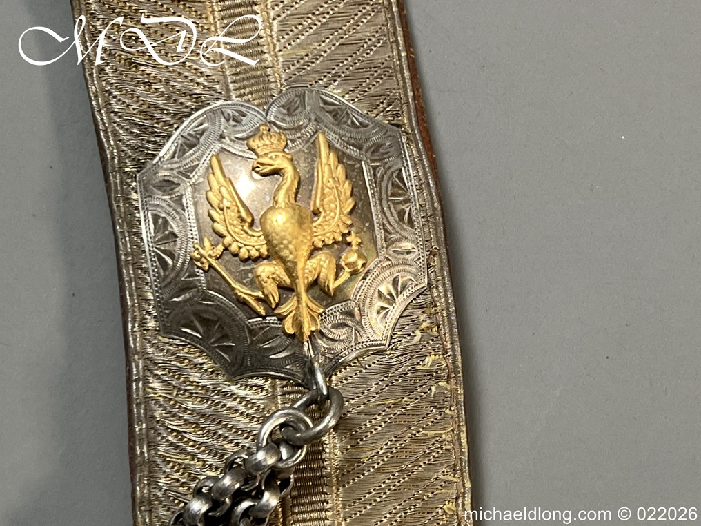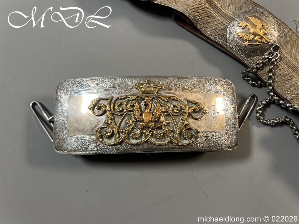 The silver pouch mounted with Royal Cypher, reversed and intertwined, superimposed with the regimental eagle. The gold lace belt with matching hallmarked silver buckle, tip and slide. The boss with gilt eagle, the chains terminating in arrow prickers and the guard with lion over Victorian Crown, all in very nice condition some age discolour to lace.