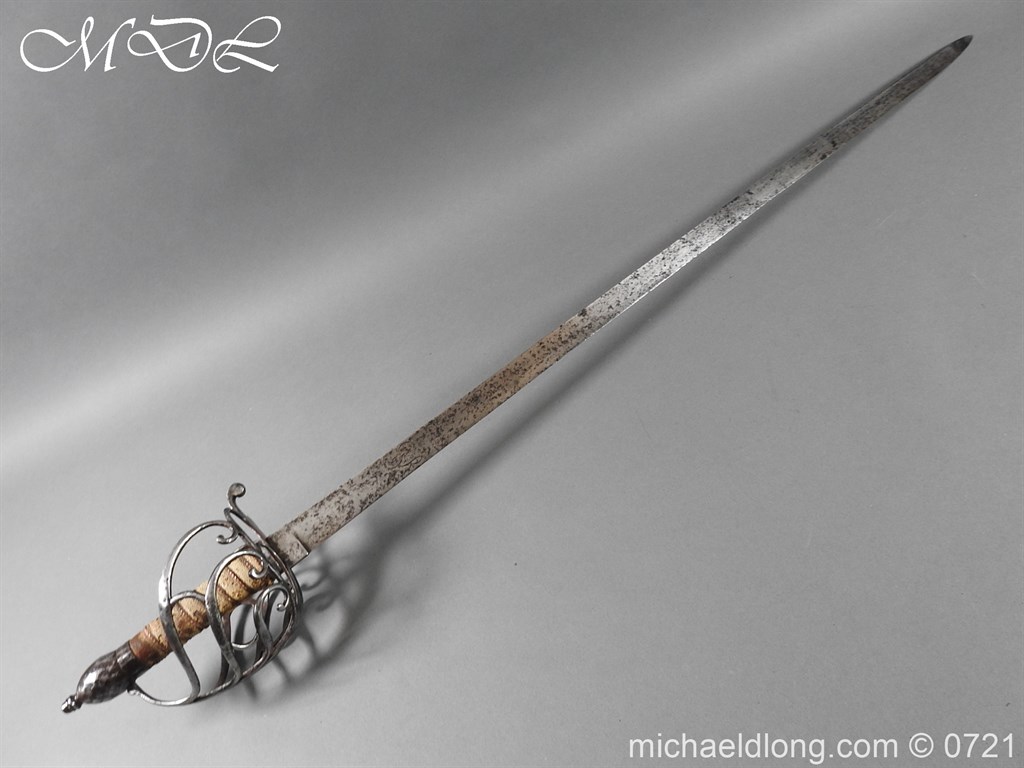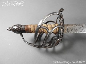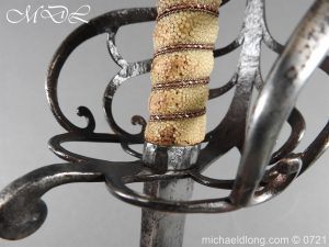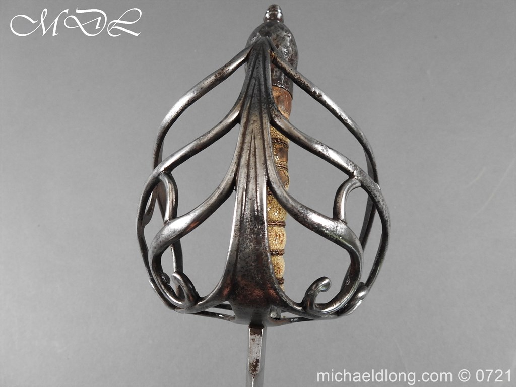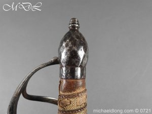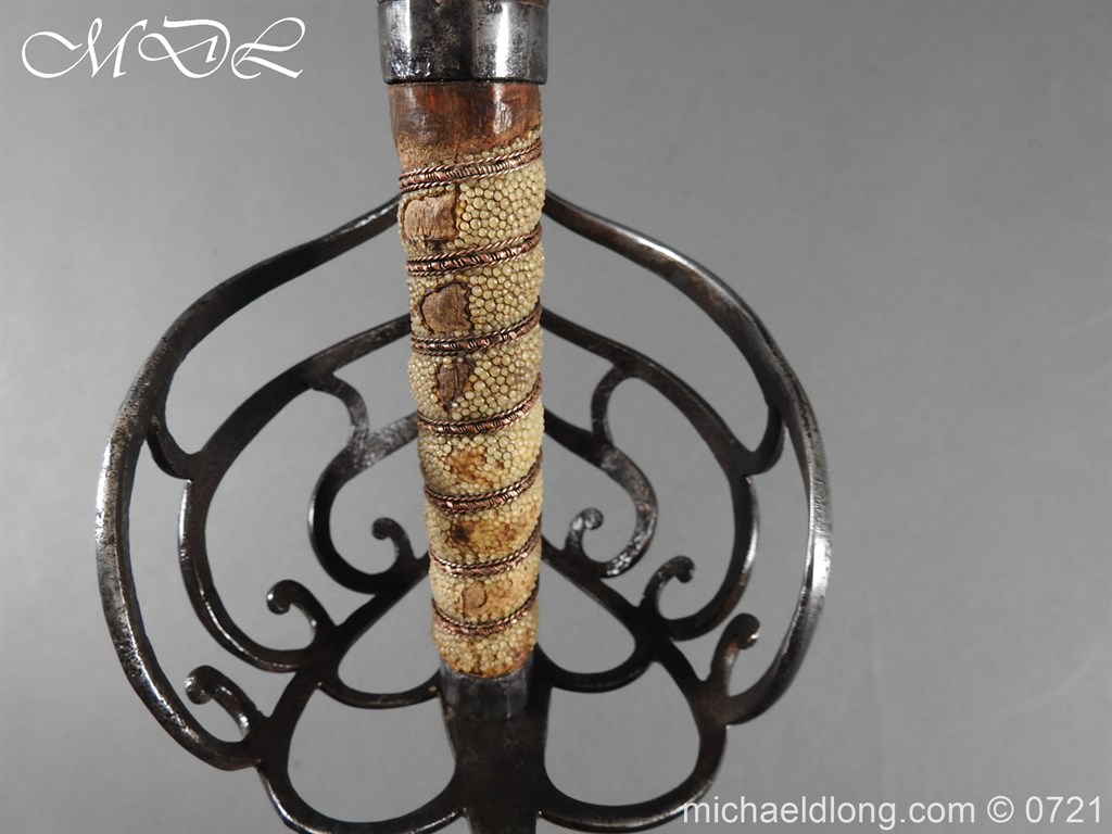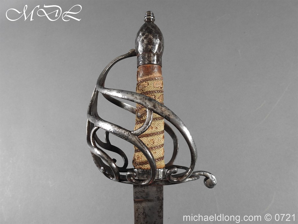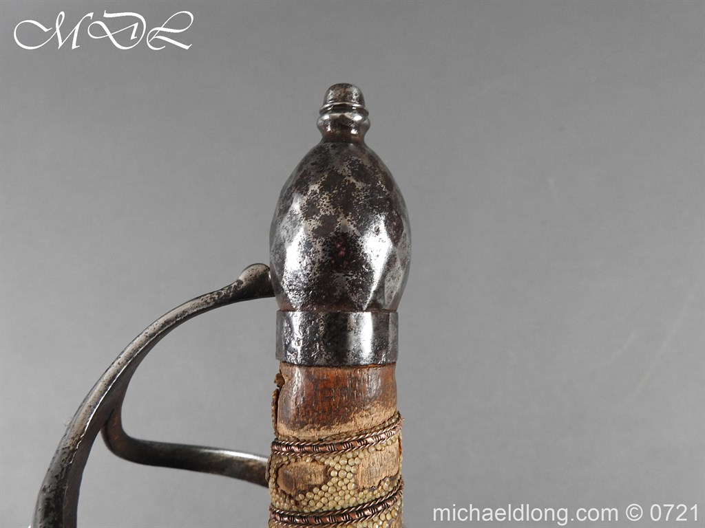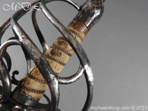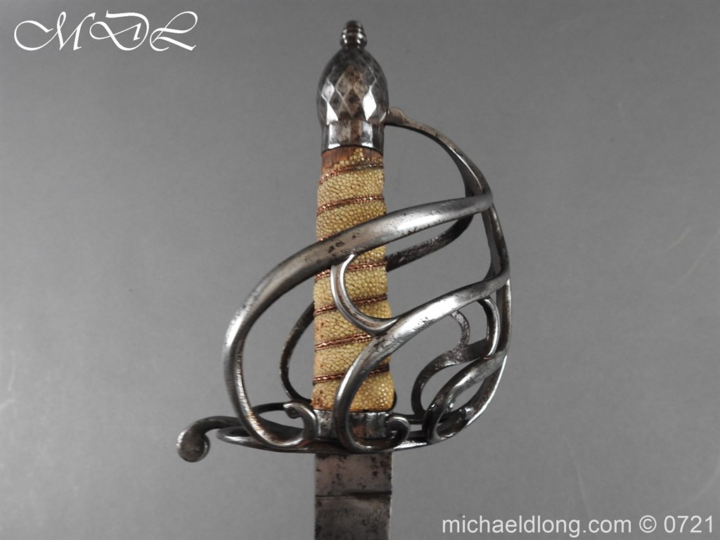 British 1788 Heavy Cavalry Officer’s Sword by Woolley full basket hilt of regulation pattern with ovoid faceted pommel and extended tang button, the fish skin grip secured by twisted copper wire shows age wear. Flat sided blade single edged becoming double towards the point and engraved with Woolley and Co Birmingham plus crowned GR monogram to each side.
