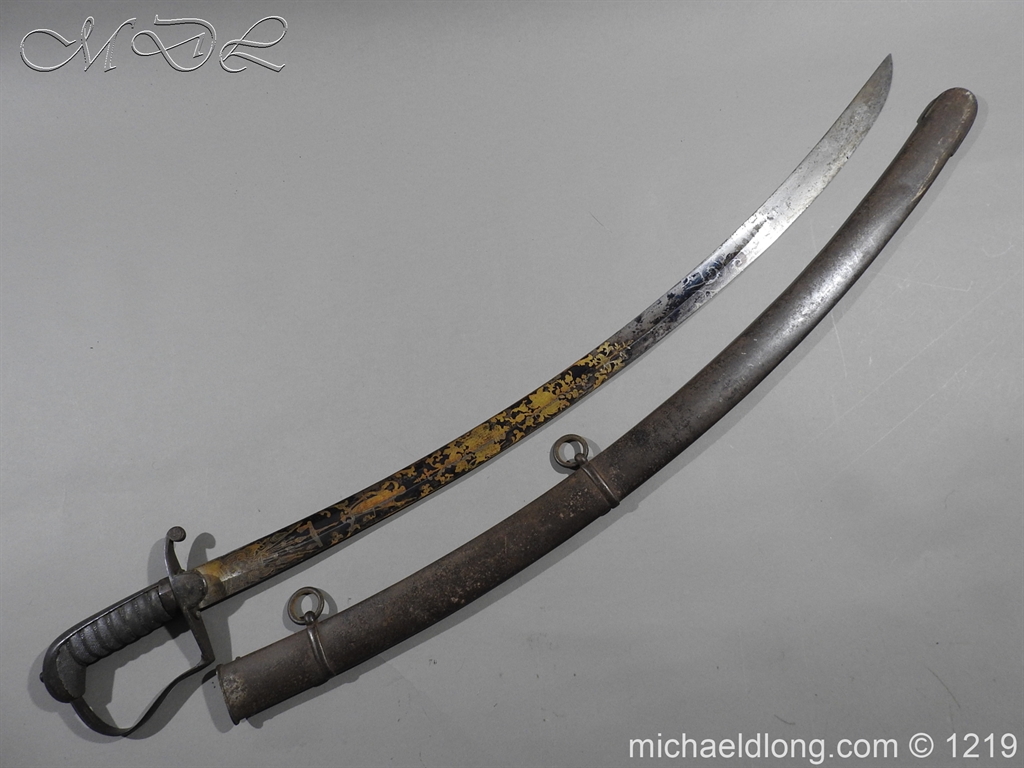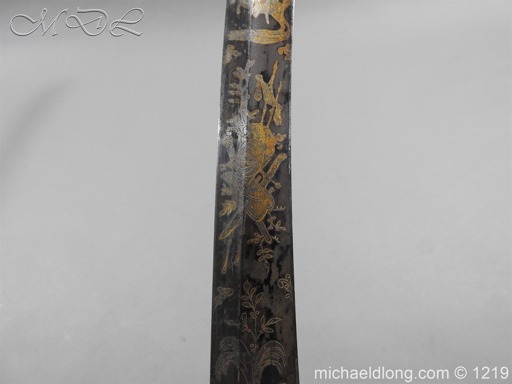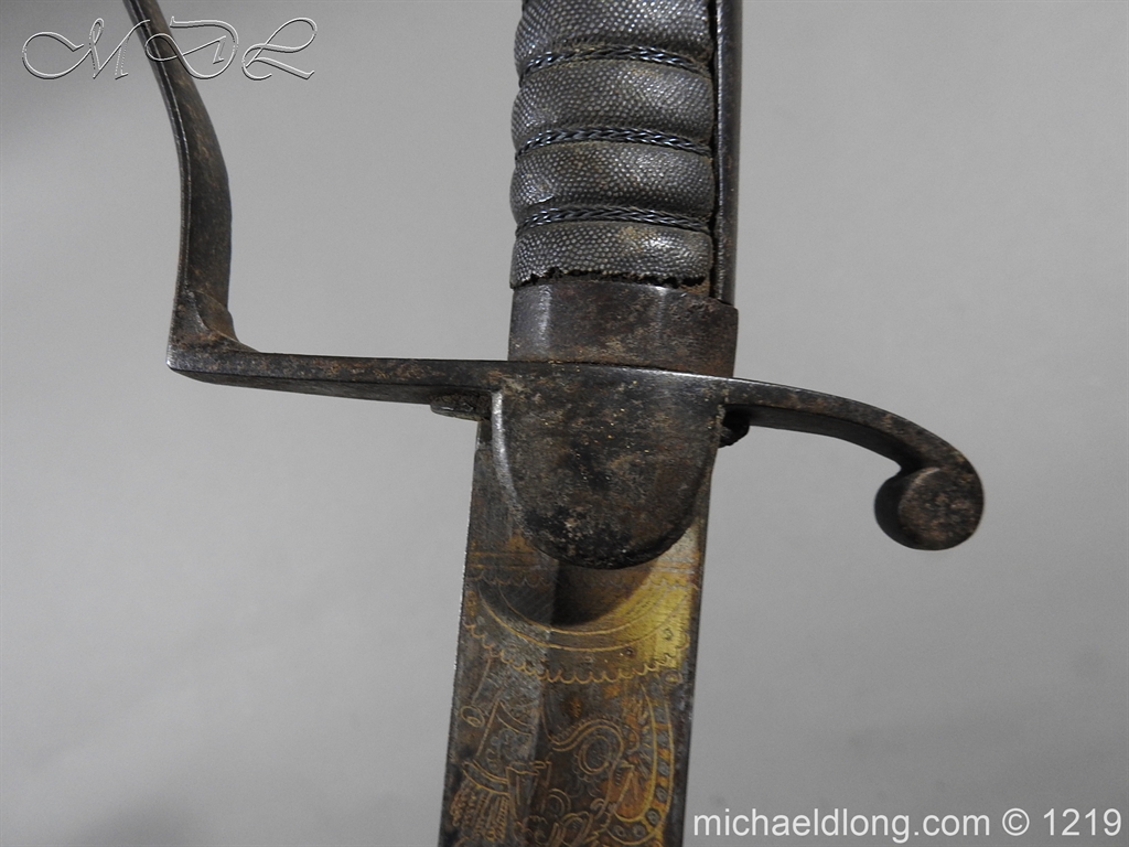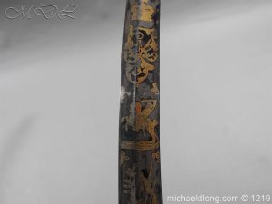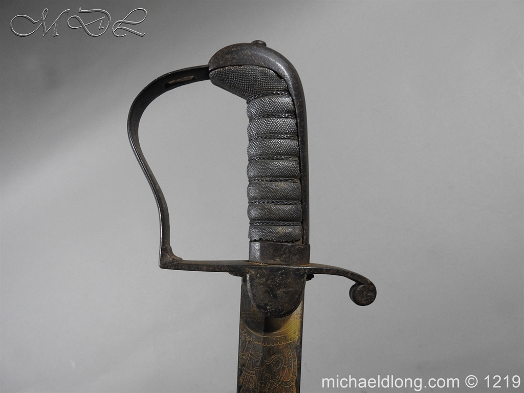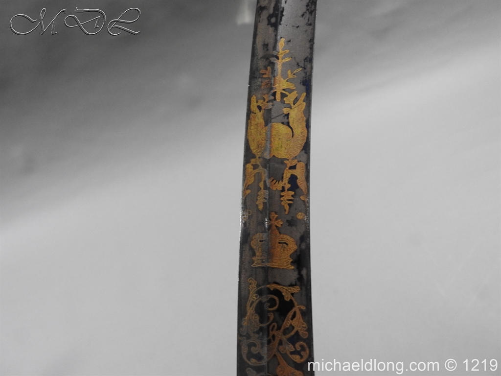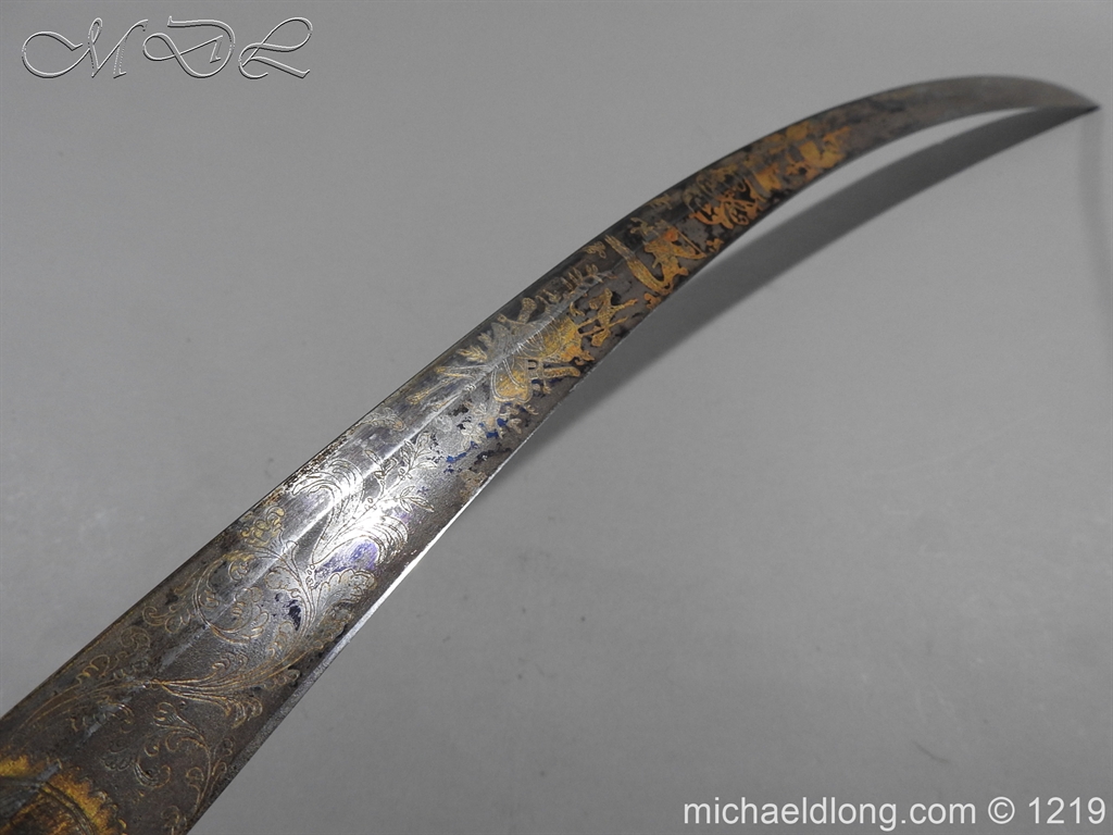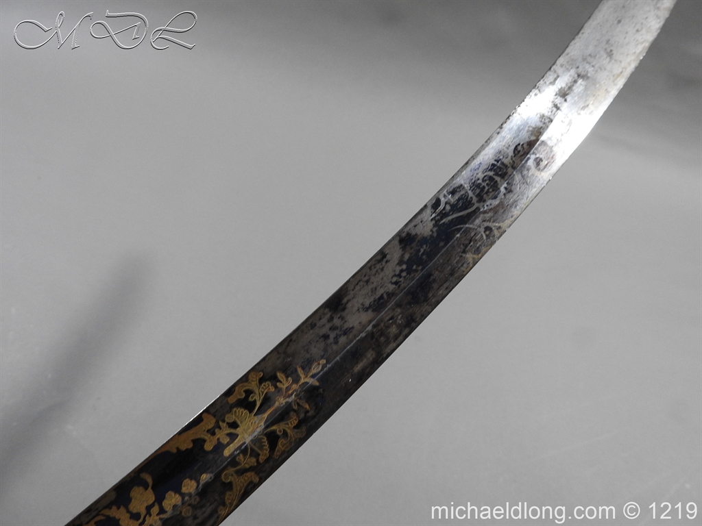 Georgian 1796 Blue and Gilt Officer’s Sword regulation hilt with fish skin grip secured by silver wire. The curved blade with blue and gilt decoration including Cavalry man on horse back GR crown royal coat of arms plus trophies of arms all surrounded with floral decoration. Complete with steel scabbard with 2 loose rings. Overall length 95cm blade 82cm note sword has not been cleaned as found