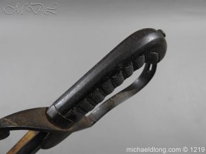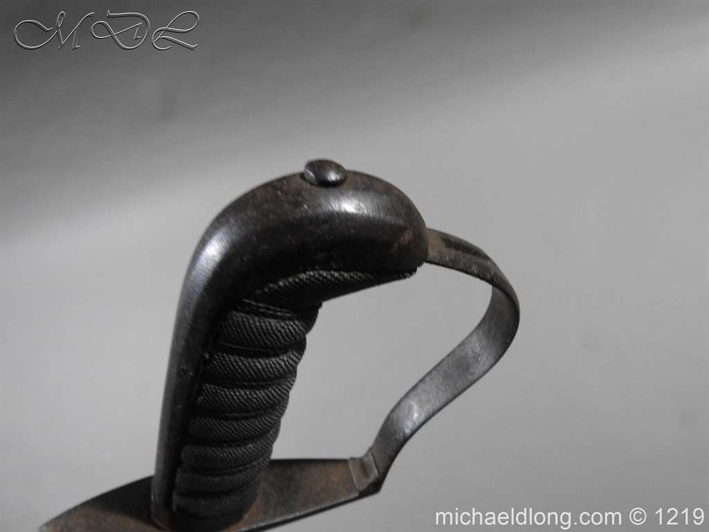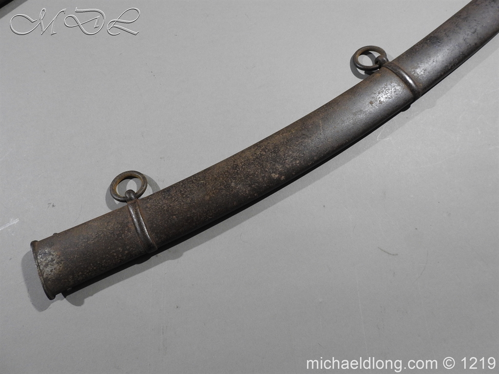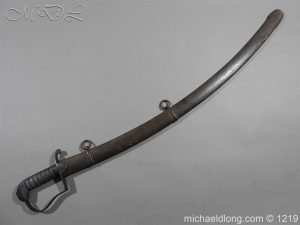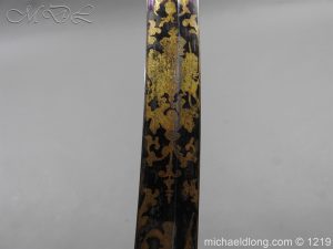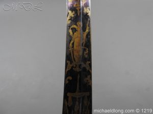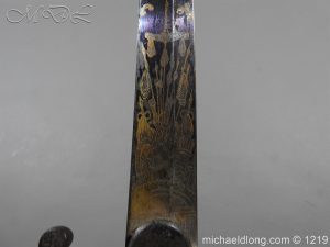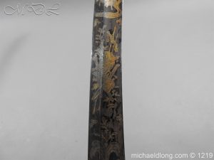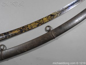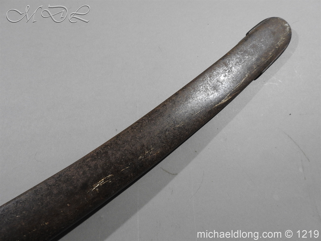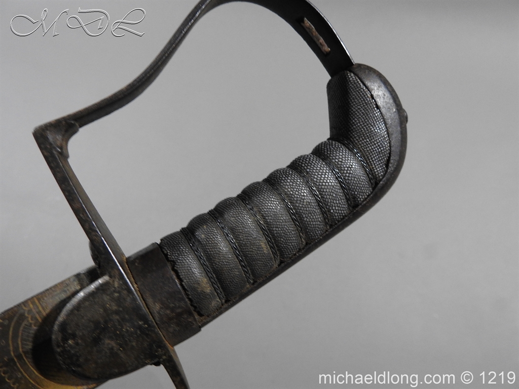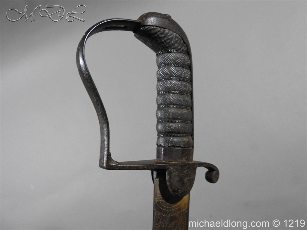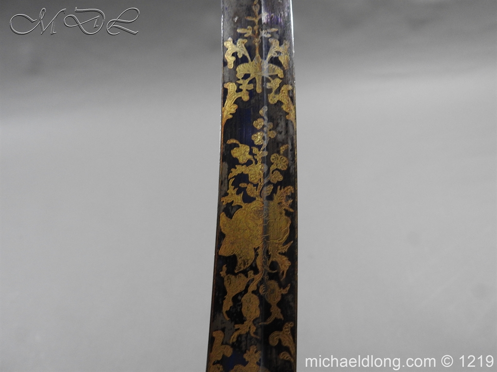 Georgian 1796 Blue and Gilt Officer’s Sword regulation hilt with fish skin grip secured by silver wire. The curved blade with blue and gilt decoration including Cavalry man on horse back GR crown royal coat of arms plus trophies of arms all surrounded with floral decoration. Complete with steel scabbard with 2 loose rings. Overall length 95cm blade 82cm note sword has not been cleaned as found