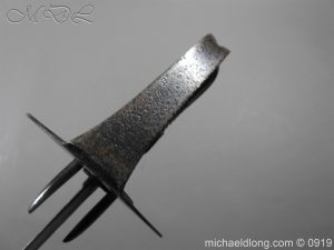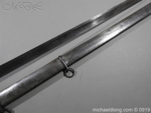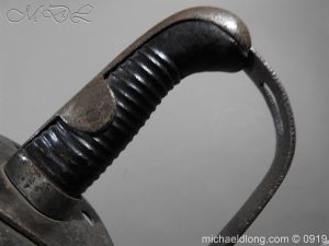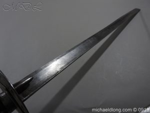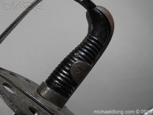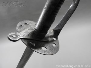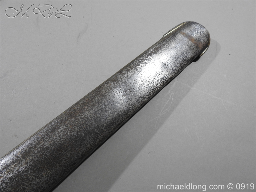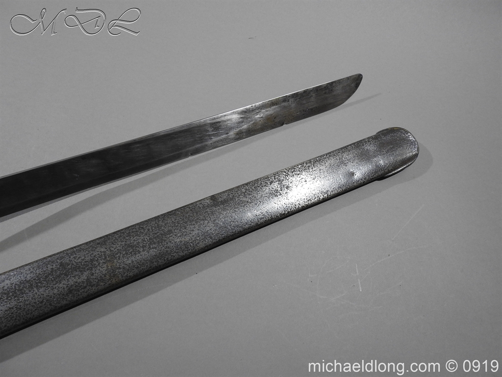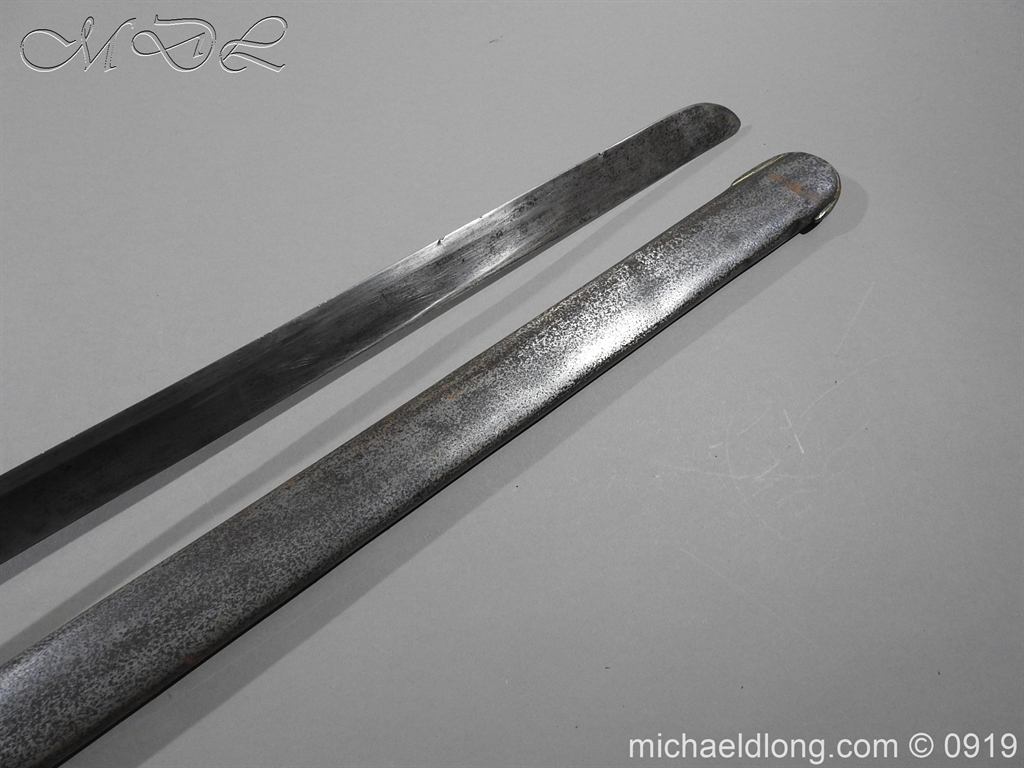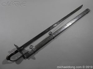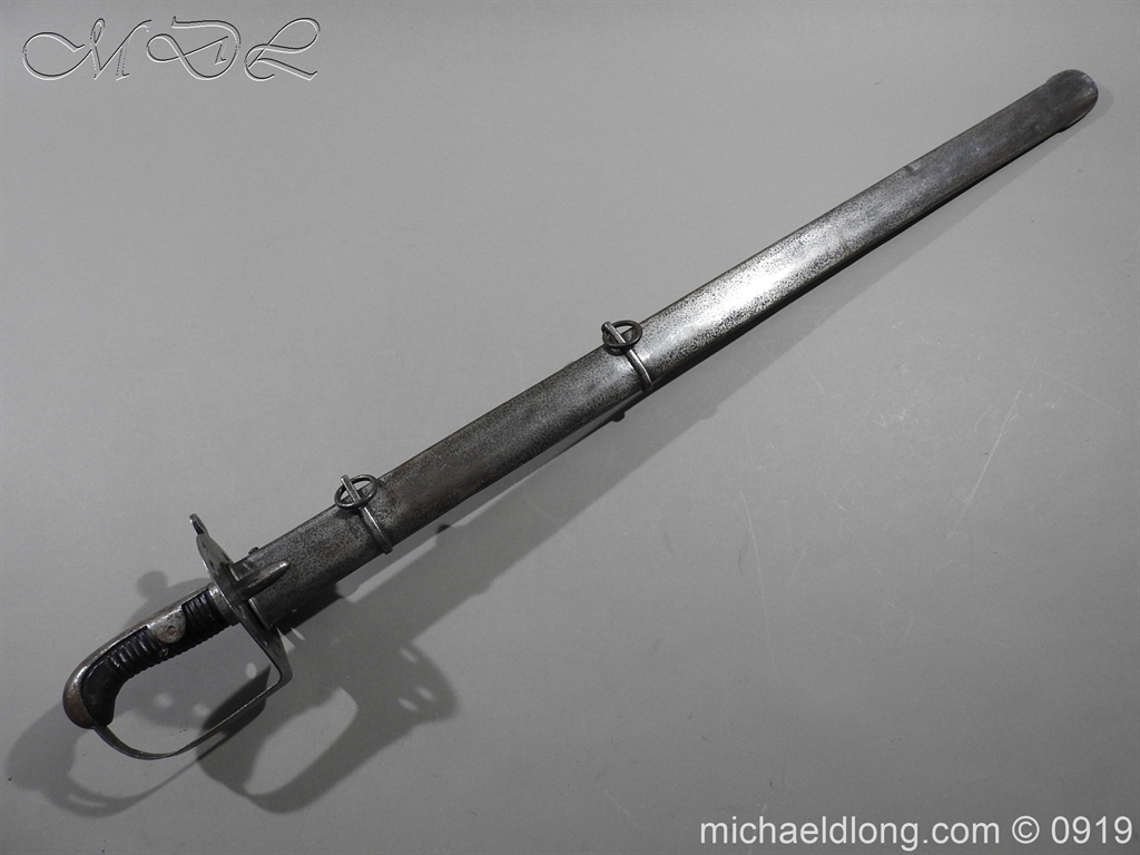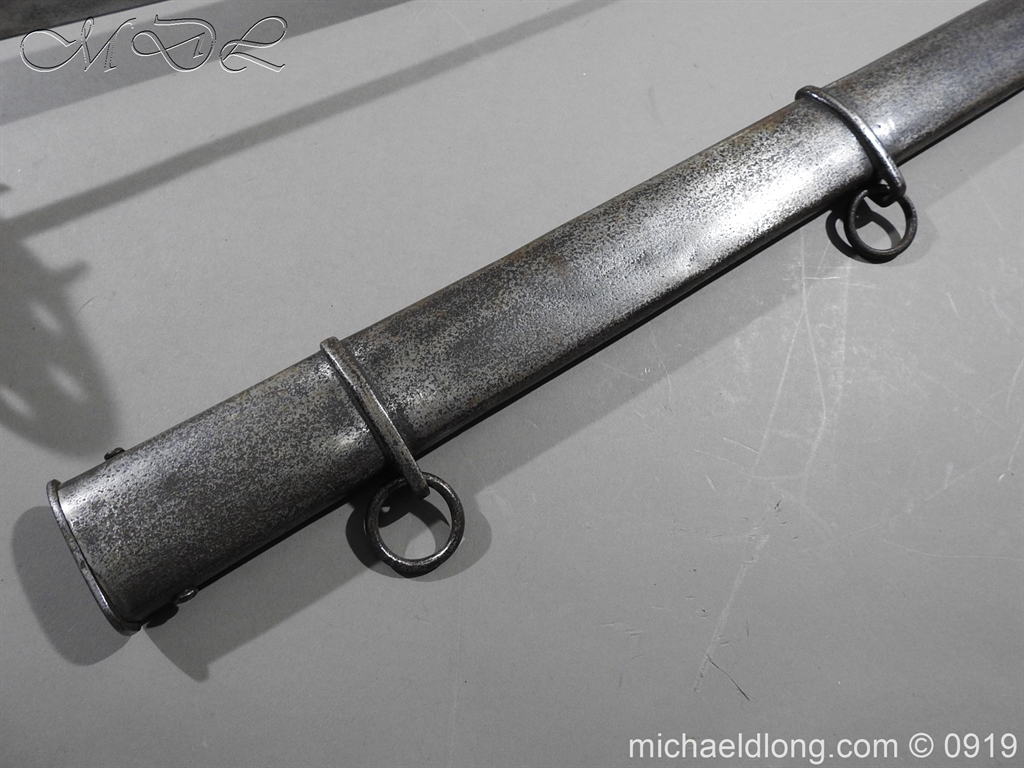 Georgian trooper’s sword, it has a steel hilt with a pierced disk guard retaining both langets, an eared back-strap with a ribbed leather covered grip and knuckle guard, straight blade with inspection mark and the spine maker marked Dawes Birmingham is 90cm in length complete with its steel scabbard with two loose rings.