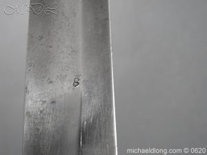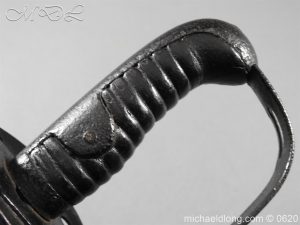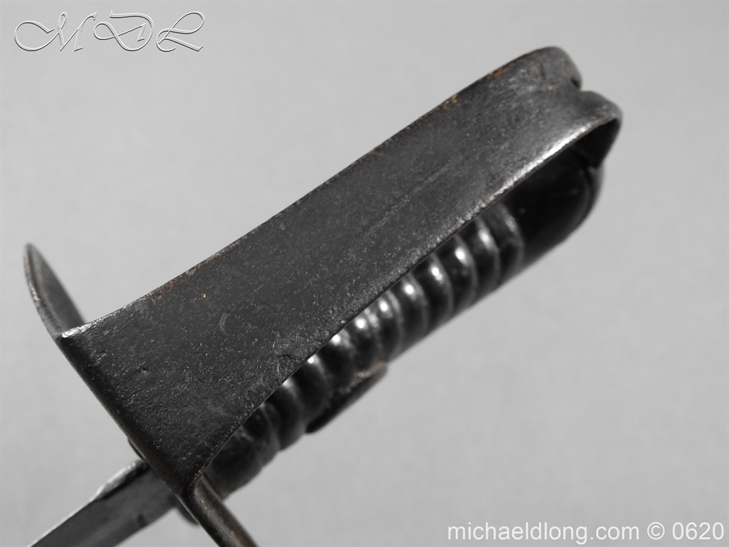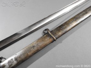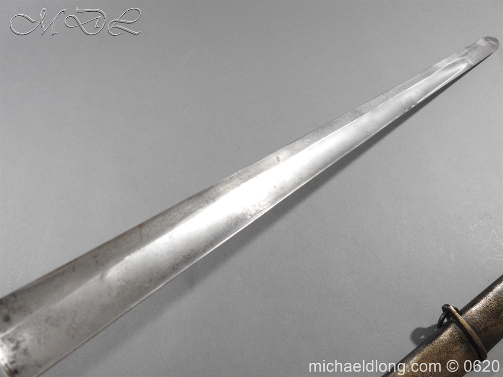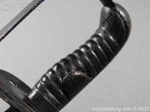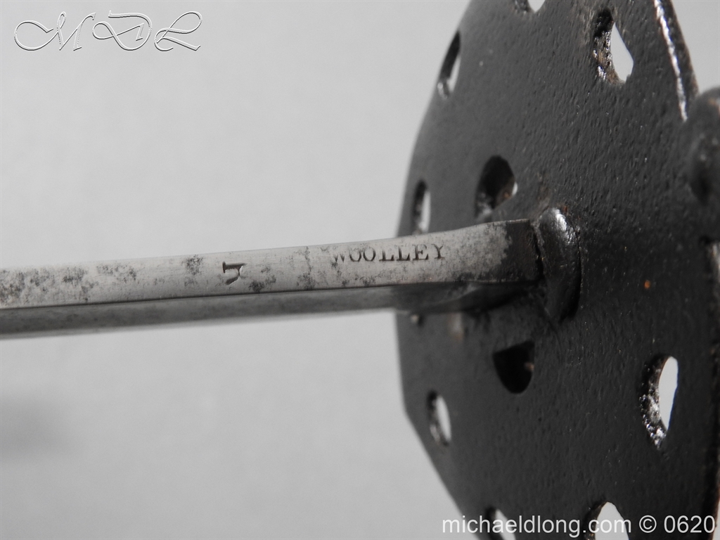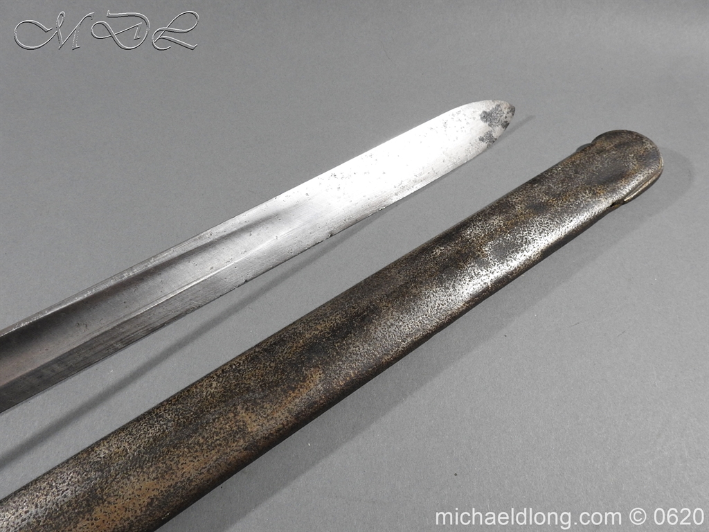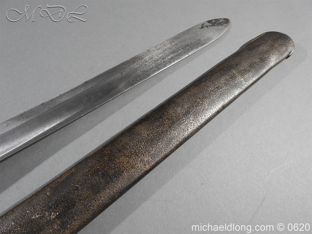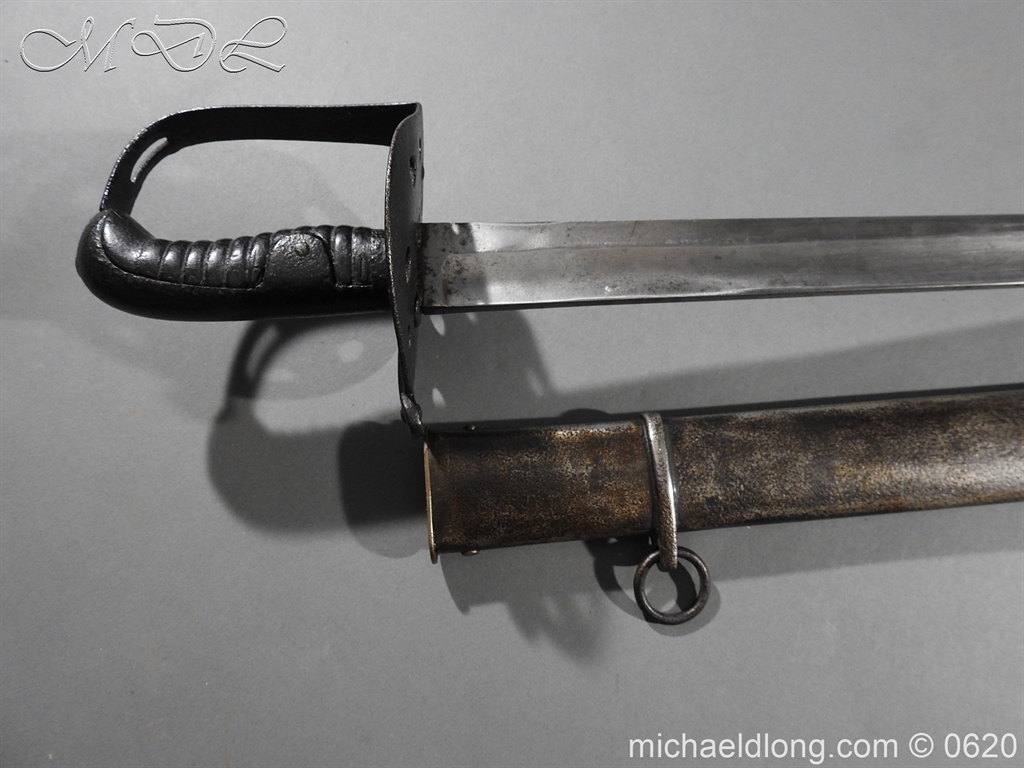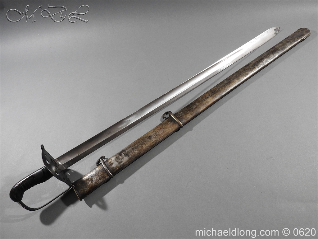 Georgian trooper’s sword, it has a steel hilt with a pierced disk guard, eared back-strap with a ribbed leather covered grip and knuckle guard, straight blade with inspection mark and the spine maker marked Woolley, 87.5 cm – 34.5 inches in length complete with its steel scabbard with two loose rings.