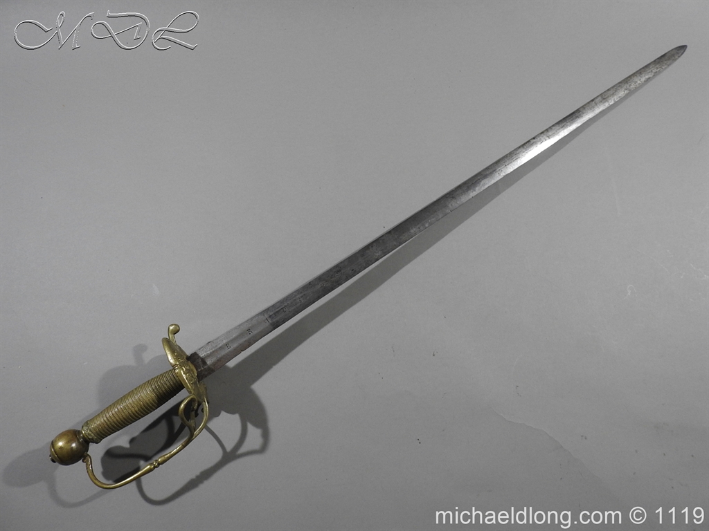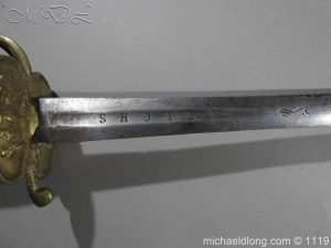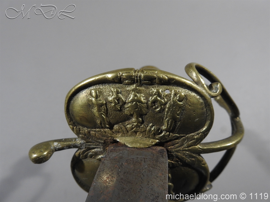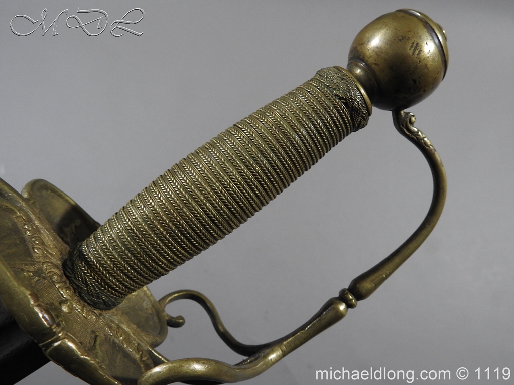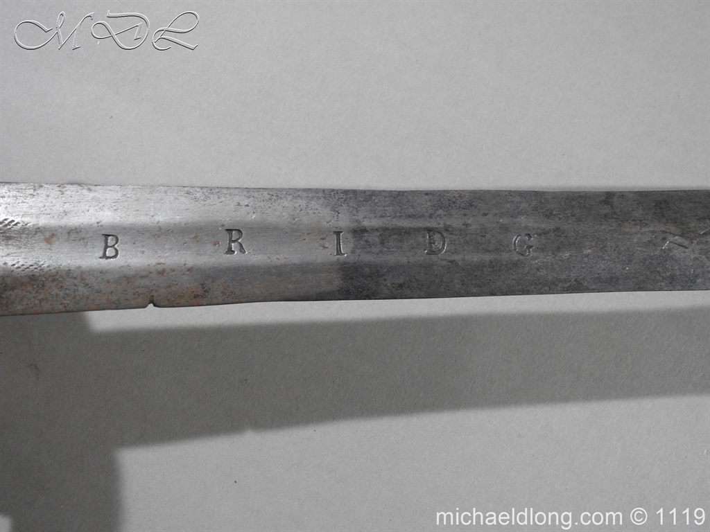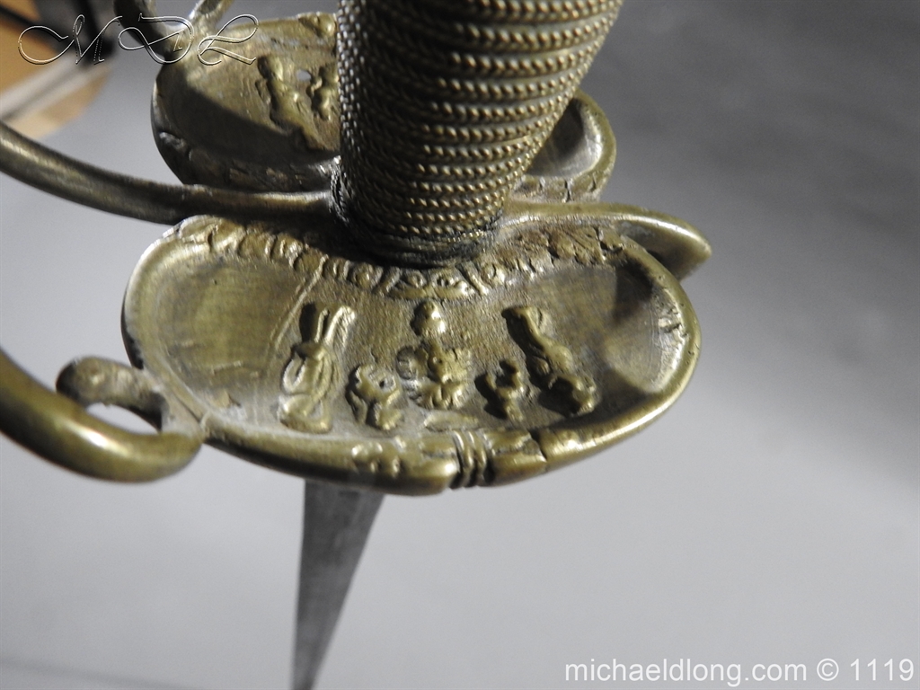 A late 17th Century English household cavalry officer’s sword possibly attributable to the 2nd Troop of Life Guards: double edged blade 77cm broad short fuller SHOTLEY and running wolf to one side and BRIDG and wolf to reverse ‘Walloon’ type cast brass hilt with double shell guards, knuckle bow with 2 supporting bars to the guards large spherical pommel, brass wire bound grip with turks head knots at the top and bottom; both sides of each guard and the pommel adorned in relief with a crowned leaf mask or ‘Green Man’ composed of oak leaves and with pendant acorn, flanked by a lion and a unicorn and supported by winged and robed figure