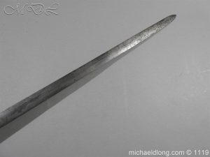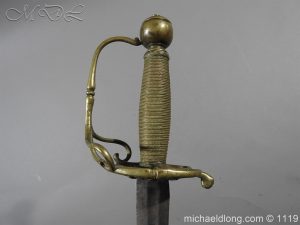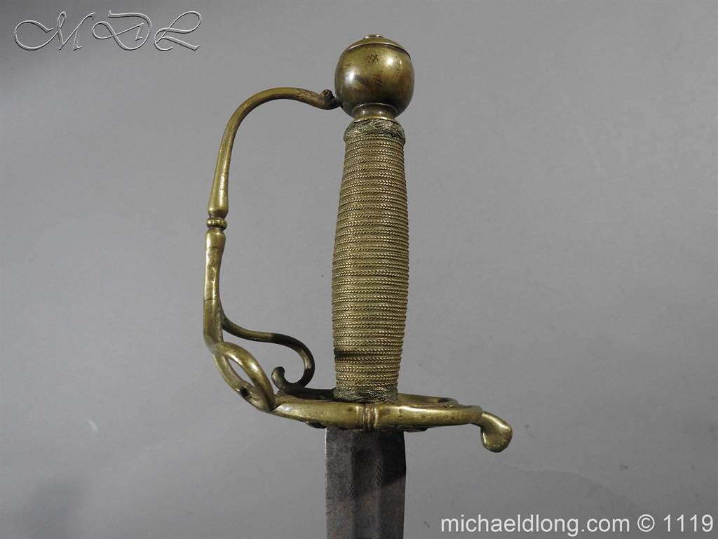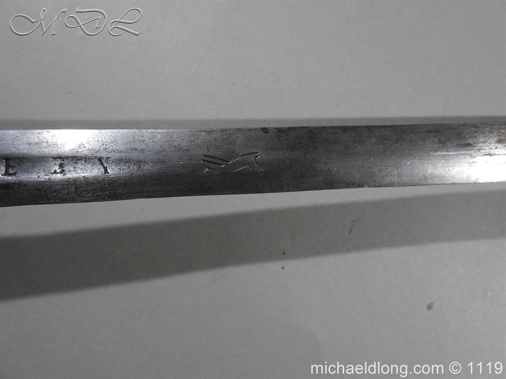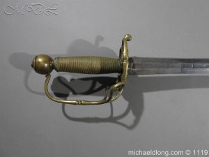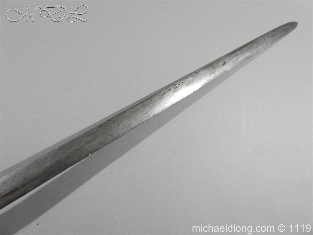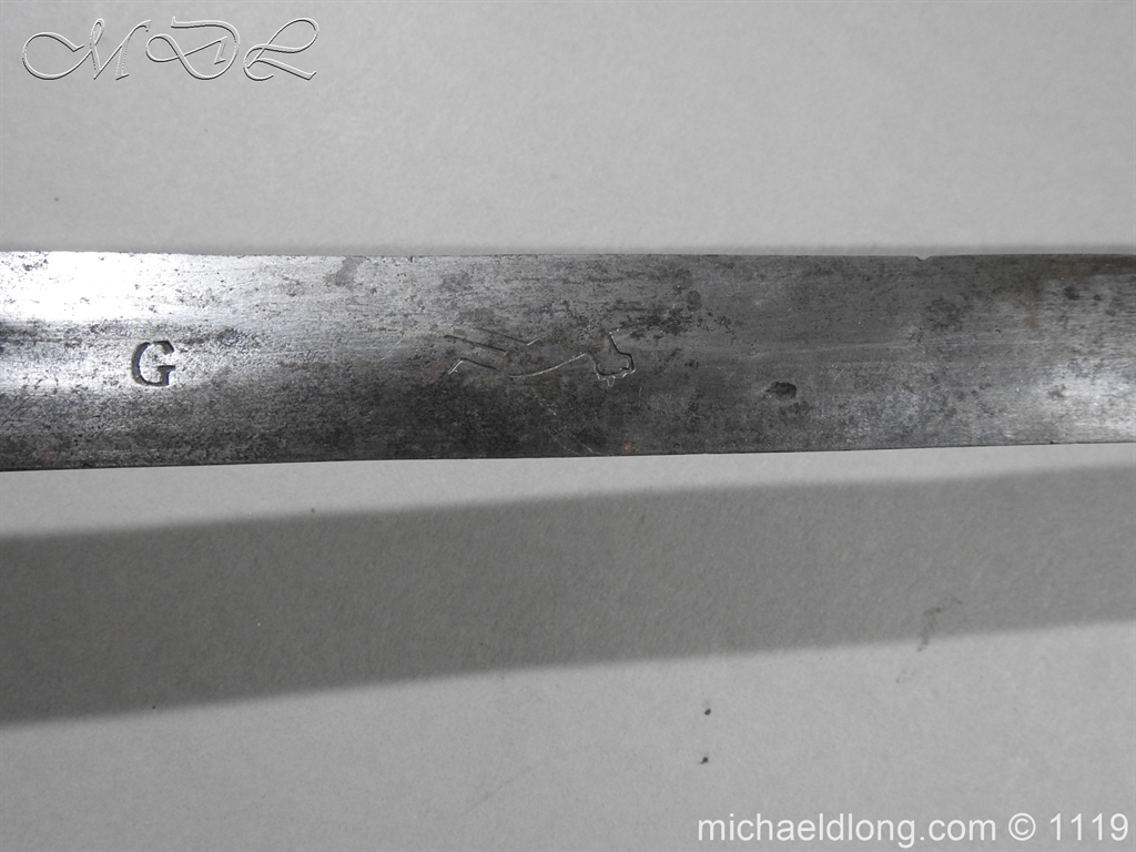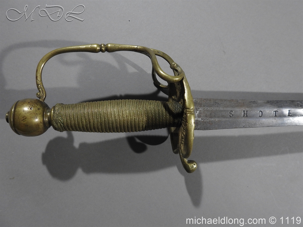 A late 17th Century English household cavalry officer’s sword possibly attributable to the 2nd Troop of Life Guards: double edged blade 77cm broad short fuller SHOTLEY and running wolf to one side and BRIDG and wolf to reverse ‘Walloon’ type cast brass hilt with double shell guards, knuckle bow with 2 supporting bars to the guards large spherical pommel, brass wire bound grip with turks head knots at the top and bottom; both sides of each guard and the pommel adorned in relief with a crowned leaf mask or ‘Green Man’ composed of oak leaves and with pendant acorn, flanked by a lion and a unicorn and supported by winged and robed figure