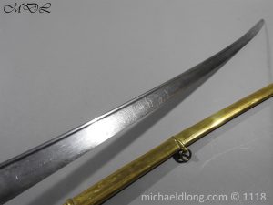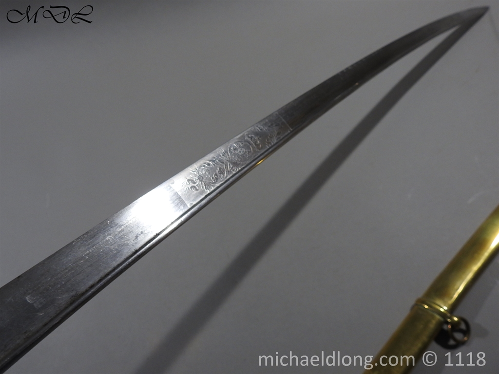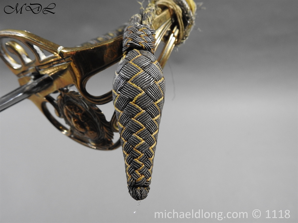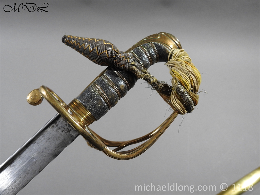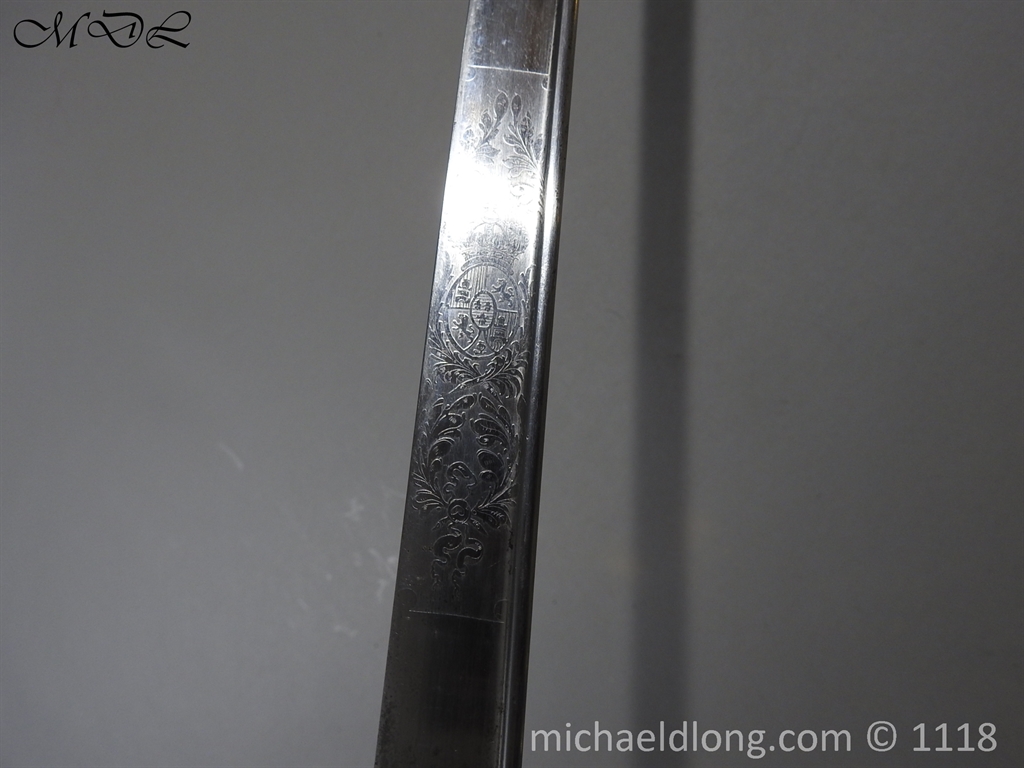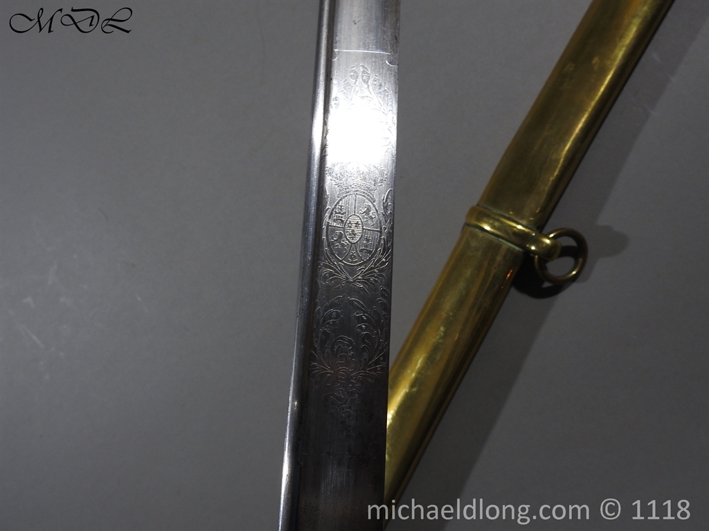 Early 1822 British pattern sword with pipe back blade and regulation brass hilt but with the Spanish House of Bourbon Royal Coat of Arms for Queen Isabella II / Regent Maria Cristina of Bourbon to center of the hilt. Fish skin grip with stepped pommel and yellow and gold dress knot which does show age wear. The blade again British regulation with engraved panals to each side again with The Spanish House of Bourbon Royal Coat of Arms. Complete with folding side guard in working order and brass scabbard, the sword overall is is super condition