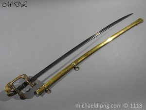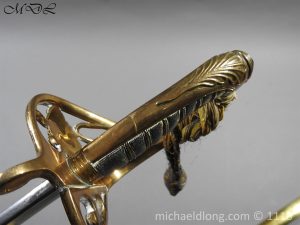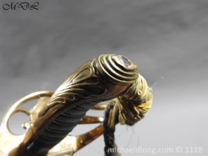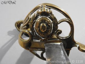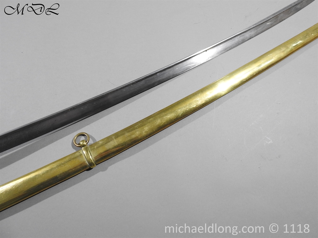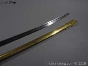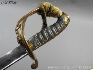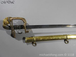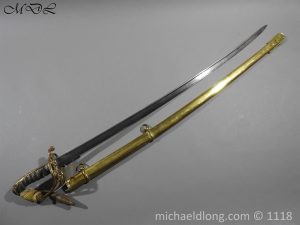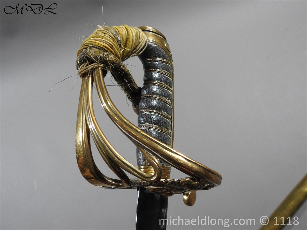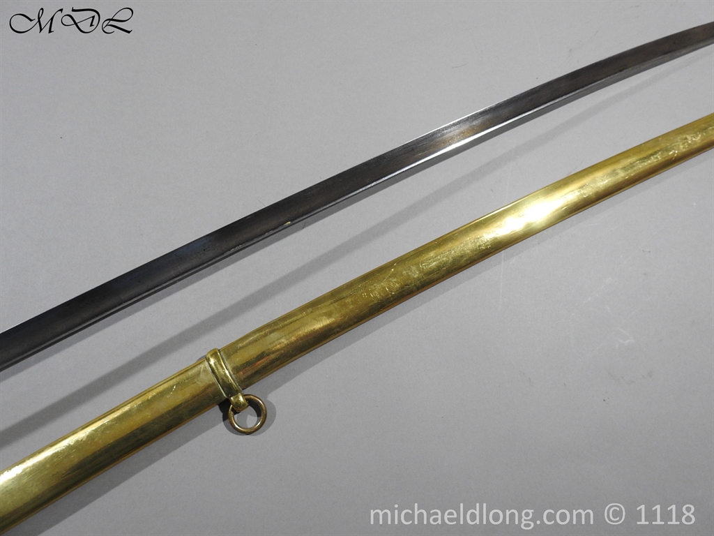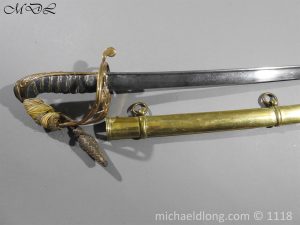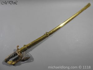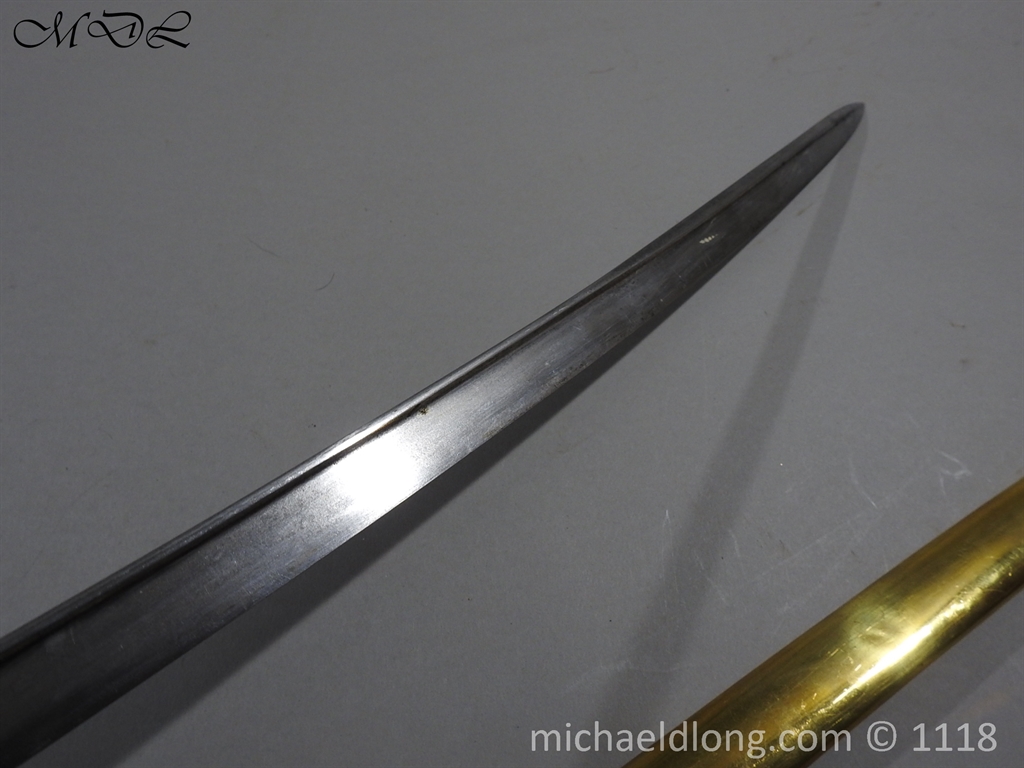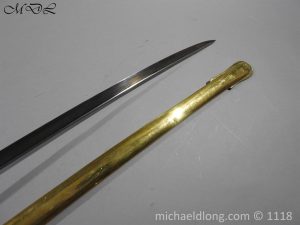 Early 1822 British pattern sword with pipe back blade and regulation brass hilt but with the Spanish House of Bourbon Royal Coat of Arms for Queen Isabella II / Regent Maria Cristina of Bourbon to center of the hilt. Fish skin grip with stepped pommel and yellow and gold dress knot which does show age wear. The blade again British regulation with engraved panals to each side again with The Spanish House of Bourbon Royal Coat of Arms. Complete with folding side guard in working order and brass scabbard, the sword overall is is super condition