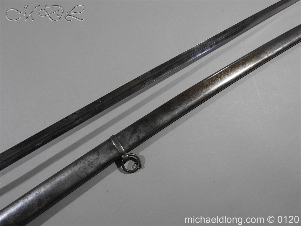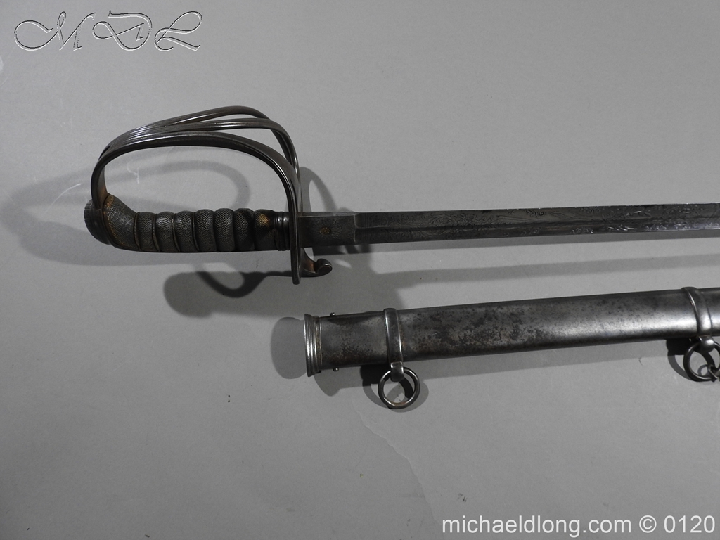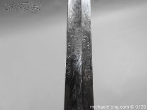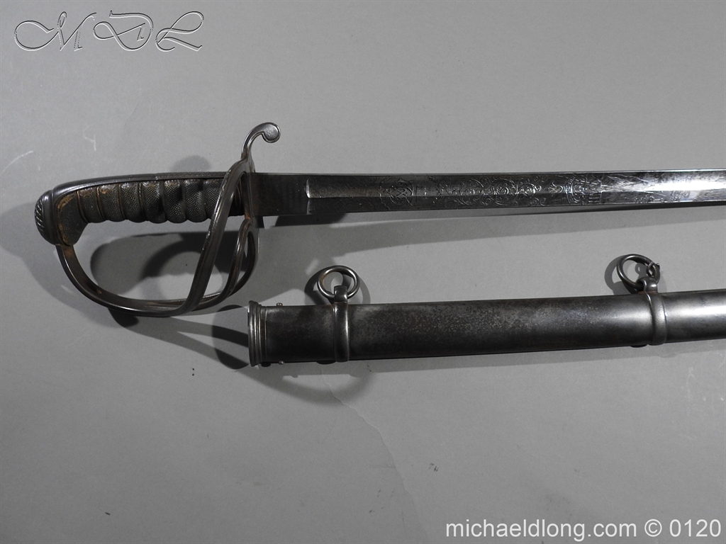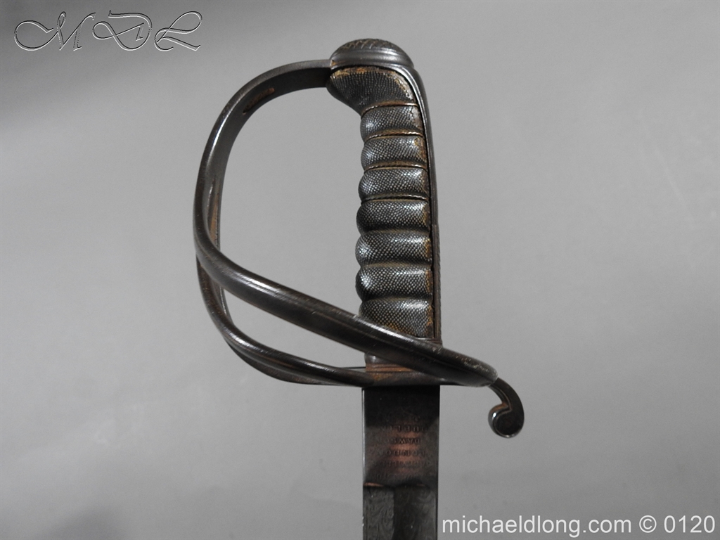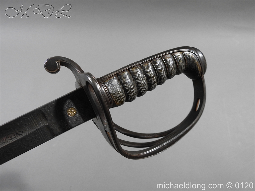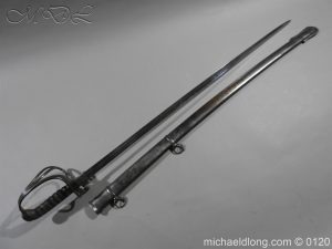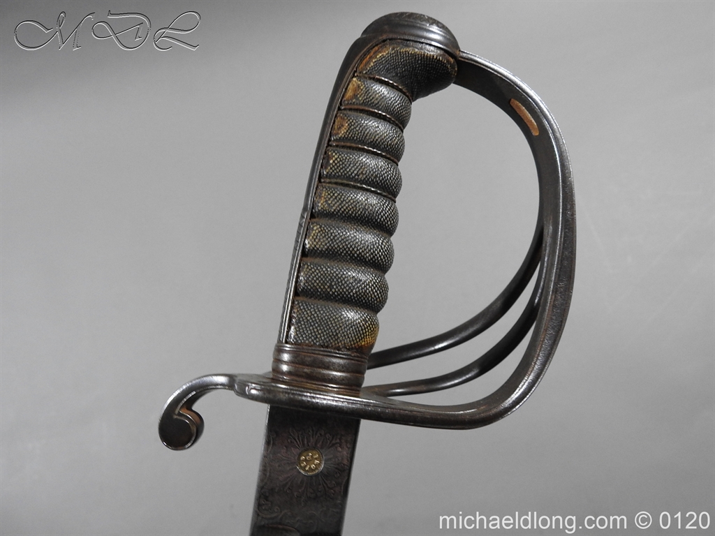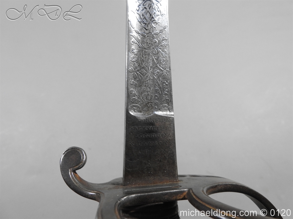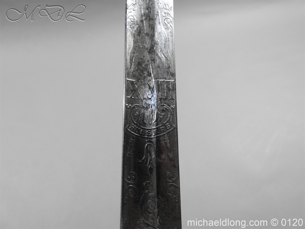 15th Hussars Victorian Officer’s Sword 1821 pattern regulation three bar hilt chequered pommel and fish skin grip. The blade in good condition engraved with XV Hussars crossed lancer, VR and Crown plus owner initials and crest further research needed. Marked Johnston London – Dawson’s Dublin complete with steel scabbard