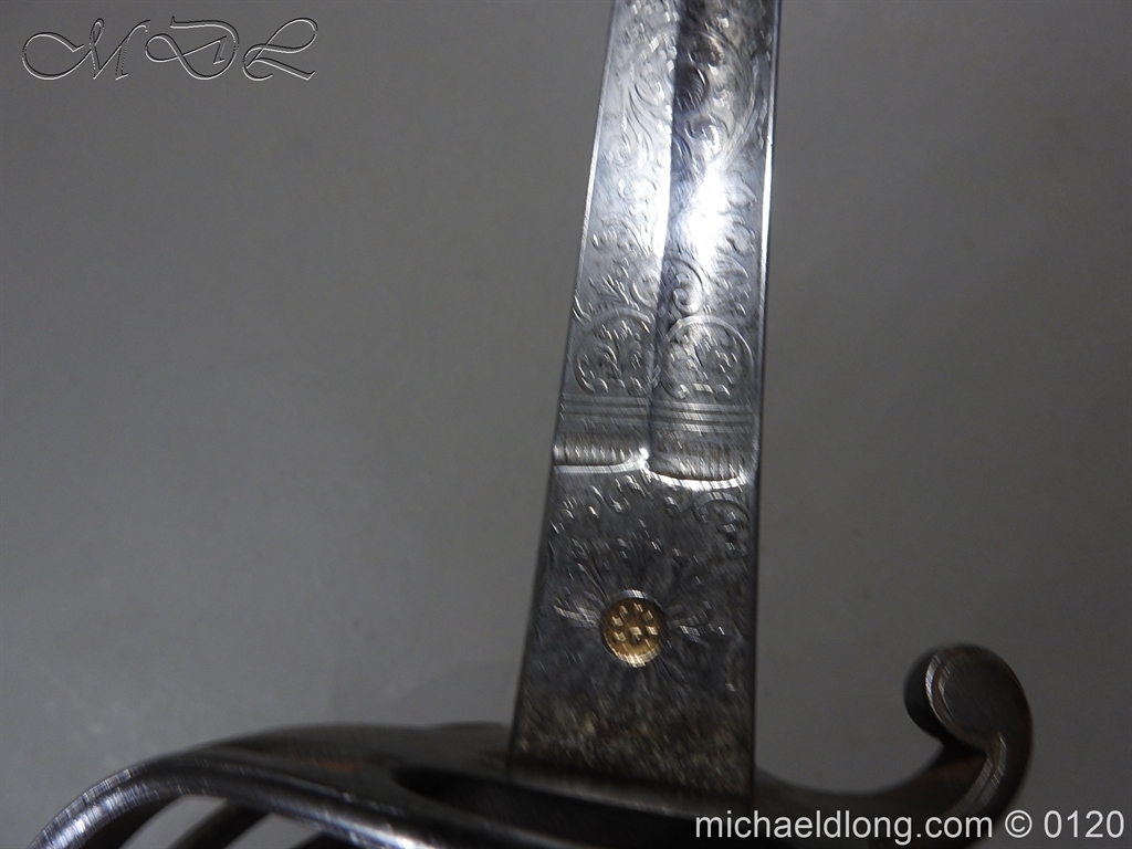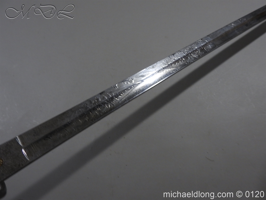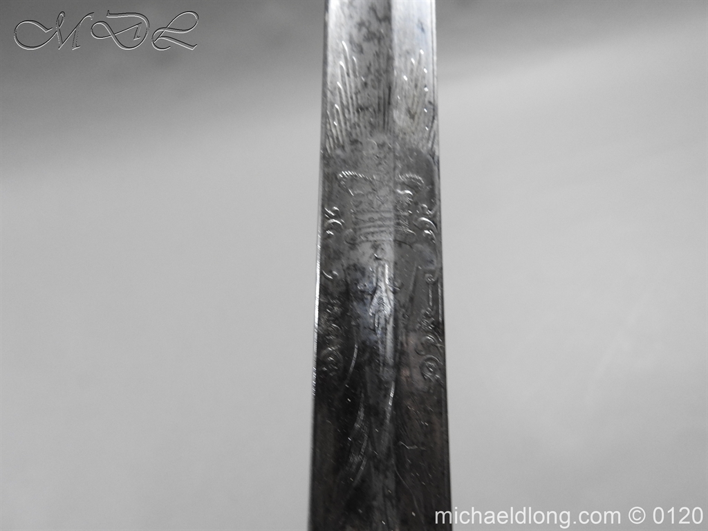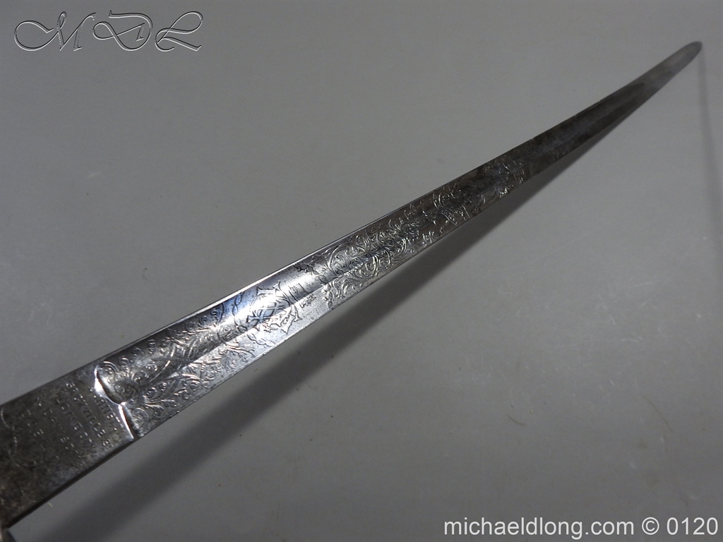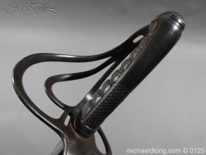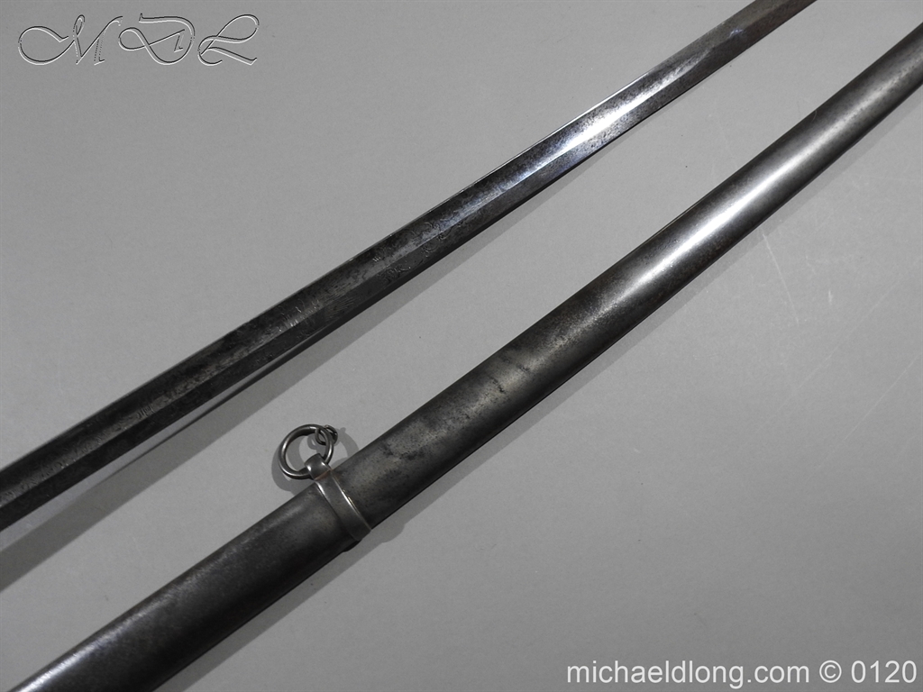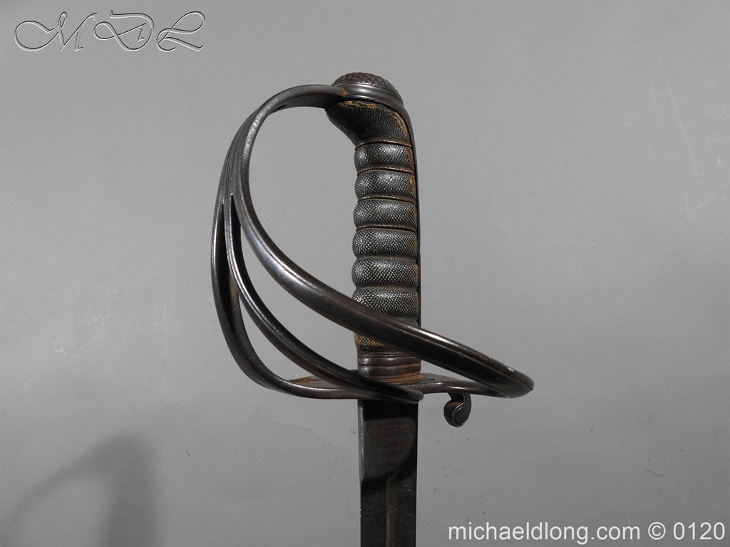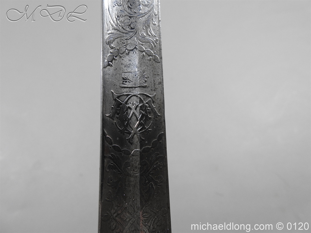 15th Hussars Victorian Officer’s Sword 1821 pattern regulation three bar hilt chequered pommel and fish skin grip. The blade in good condition engraved with XV Hussars crossed lancer, VR and Crown plus owner initials and crest further research needed. Marked Johnston London – Dawson’s Dublin complete with steel scabbard