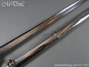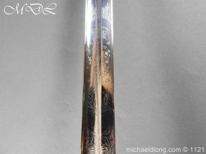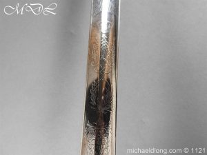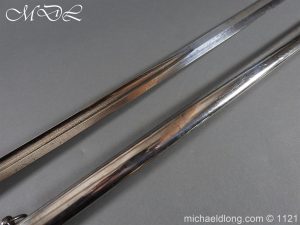 18th Hussars Cavalry Sword Patent Hilt by Wilkinson Sword London number 30493 October 21st 1890 to J M S Groves. Steel three bar hilt with chequered pommel and solid patent hilt. Slightly curved blade with single fuller engraved with scrolls crown VR and officer’s name pls regimental badge for the 18th Hussars and battle honours for the Peninsular and waterloo. Brass proof plug and marked SOLID PATENT TANG with Wilkinson number on back edge. It is complete with steel scabbard with two loose rings. Overall length 40 inches the blade 34.75 inches