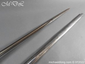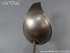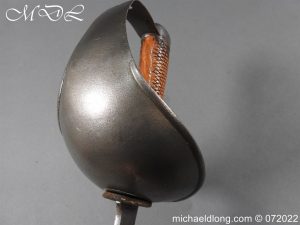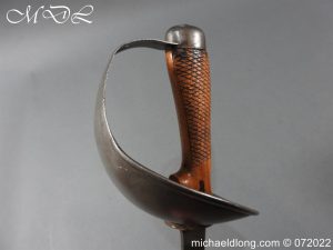 1908 Indian Pattern Troopers Sword by Wilkinson, steel bowl guard with turned over edges and plain domed pommel. Chequered wooden grip and oval sword knot slit. 1908 regulation blade marked on side with Wilkinson and broad arrow the reverse with again with broad arrow I 192 and complete with scabbard