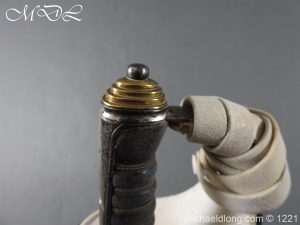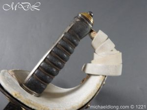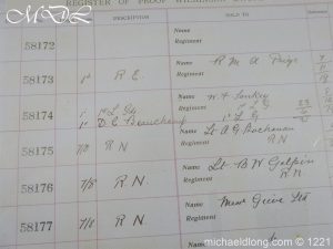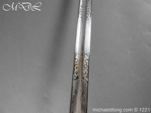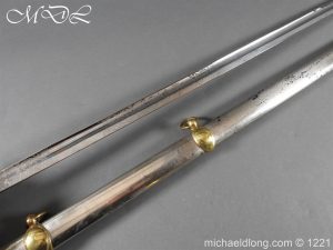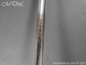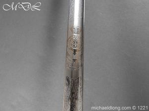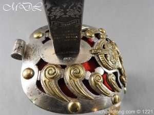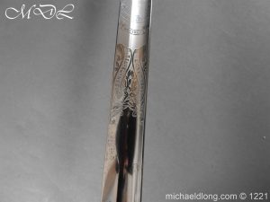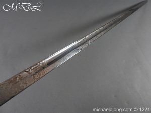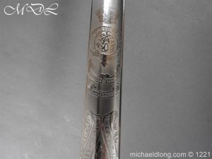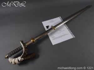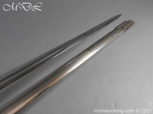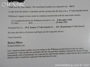 1st Life Guards Officer’s Sword by Wilkinson No 58174 dating it to 1919 Regulation hilt with leather liner and knot complete with fish skin grip. The blade engraved with GR V the reverse with crown and regimental badge plus battle honours maker marked Henry Wilkinson and contained within full dress scabbard which shows age wear to surface. The sword is sold with a copy of the register however it states that the sword was sold twice first to an officer called Sankey and second to Beauchamp so we assume Wilkinson sword duplicated the blade number which is not unique but only happen occasionally please see images