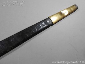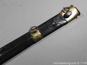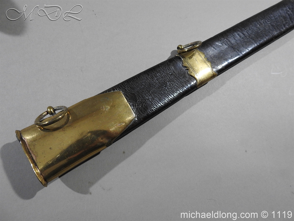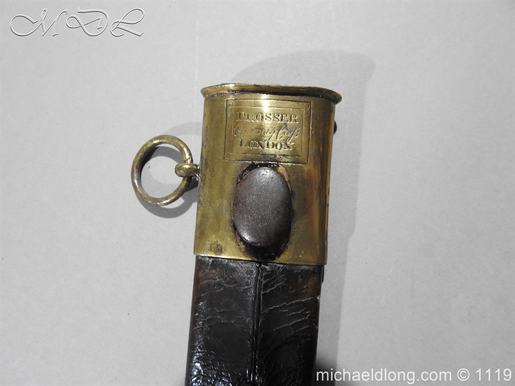 Excellent example of the rare pattern of sword by Prosser of London, 1796 Infantry officer gilt brass hilt is super condition with silver wire wrapped grip and original officer’s knot. The two shell guards with regimental badges, double edged blade engraved with matching regimental badges as the hilt with Royals below. The Scabbard black leather with matching gilt fitting and two loose rings, the top mounted also fitted with frog stud and engraved with makers name Prosser London. Overall length 100cm blade 80cm for reference please see Swords of the British Army 1788 to 1914 by Robson plate 168 Scottish Infantry Swords