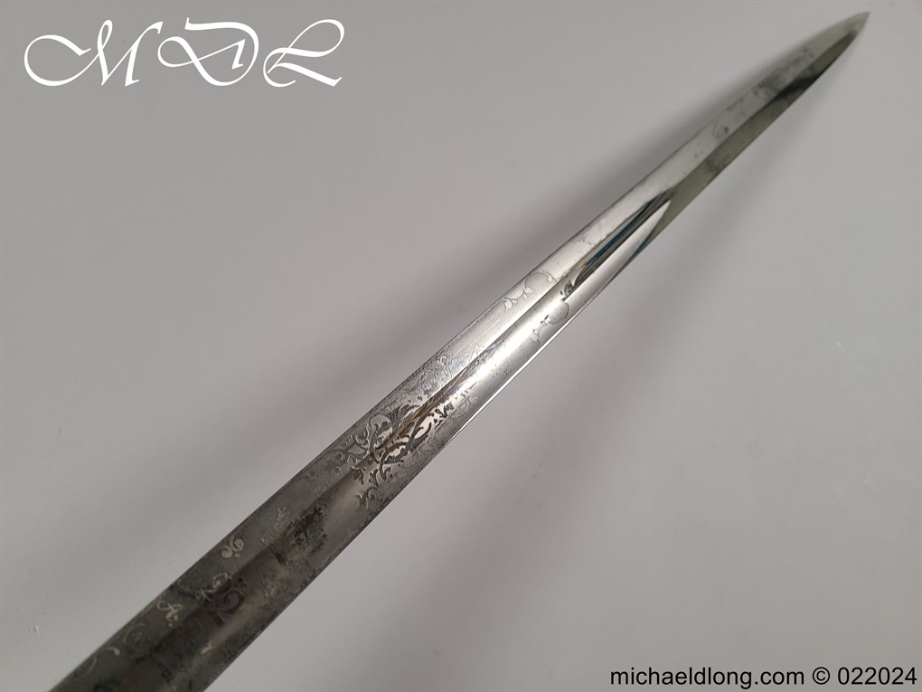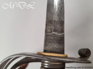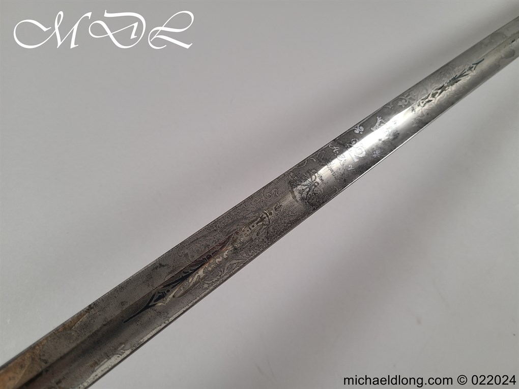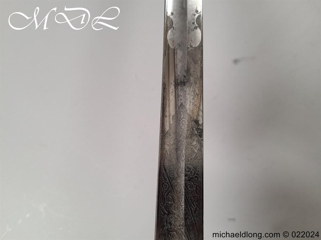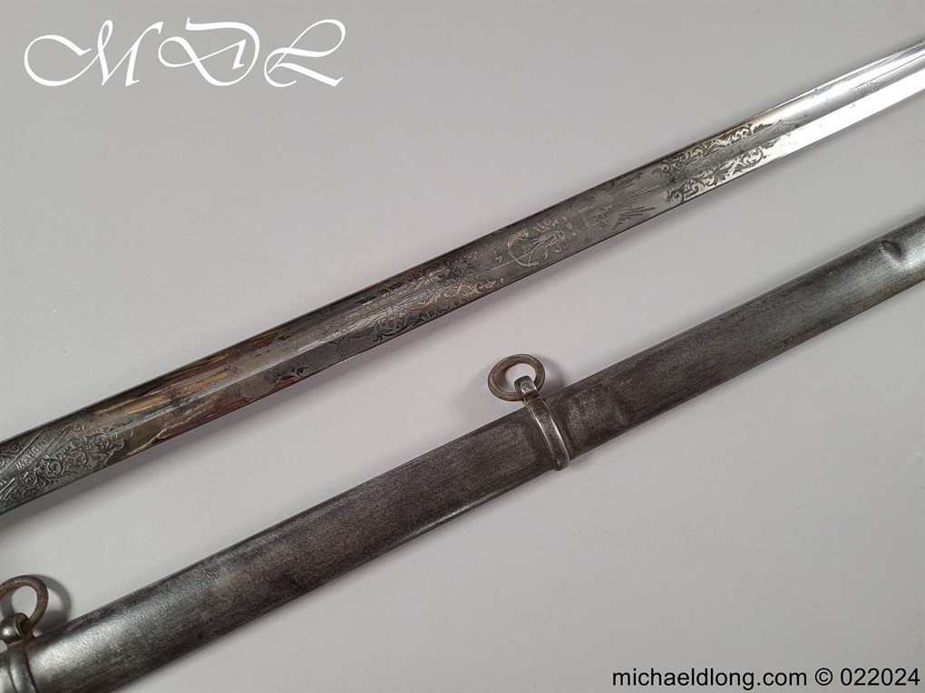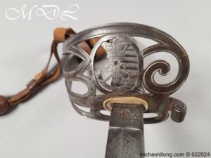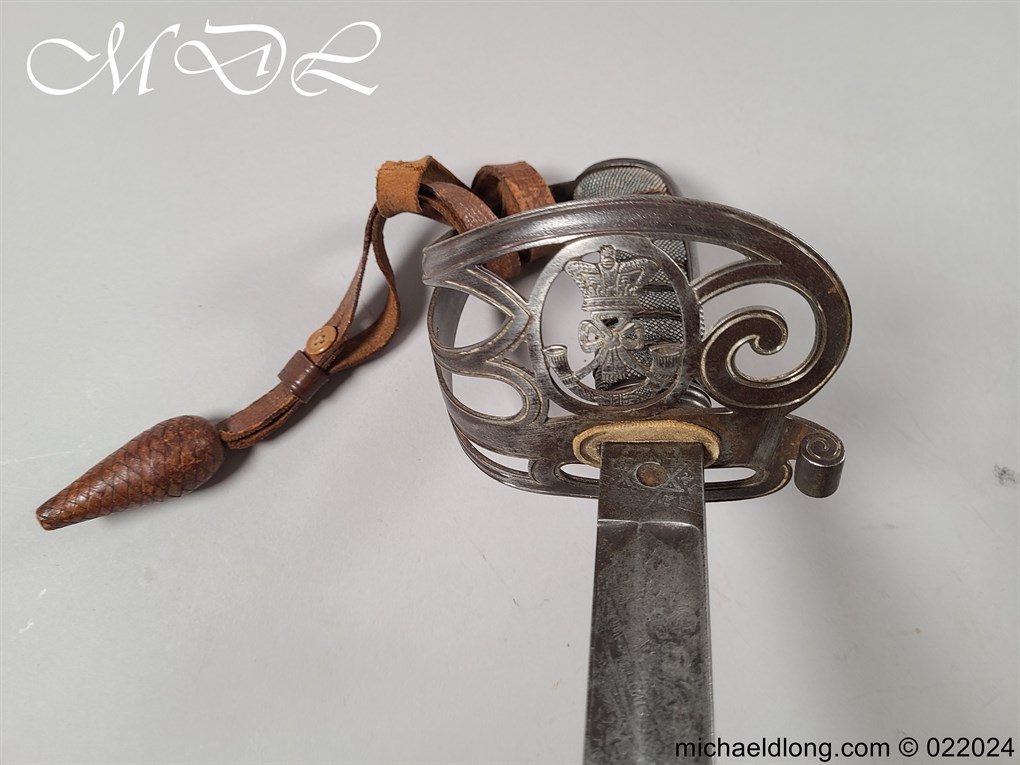 Victorian 22nd Auchmull Rifle Volunteers Officers Sword named to Andrew Smith. Regulation hilt with slung bugle and Victorian crown, fish skin grip, service knot and stepped pommel. The blade well etched with crown and bugle to one side the reverse with crown 22nd ARV and below Auchmull. Marked Hobson and son London and complete with steel scabbard, overall length 98cm the blade 82.5cm