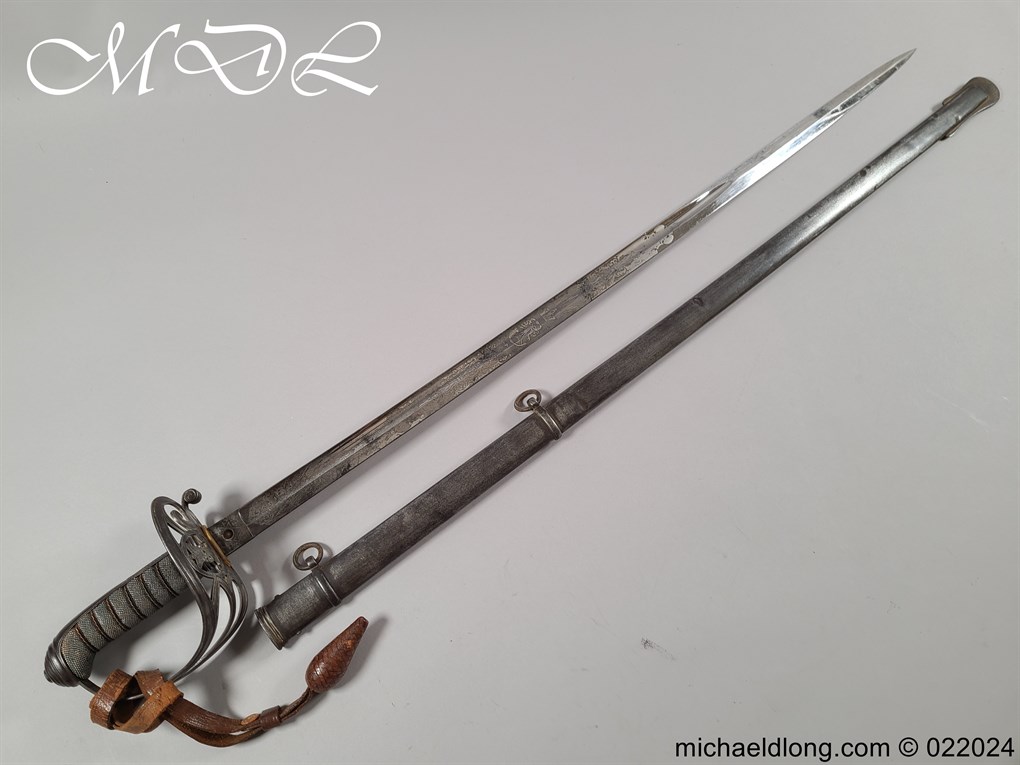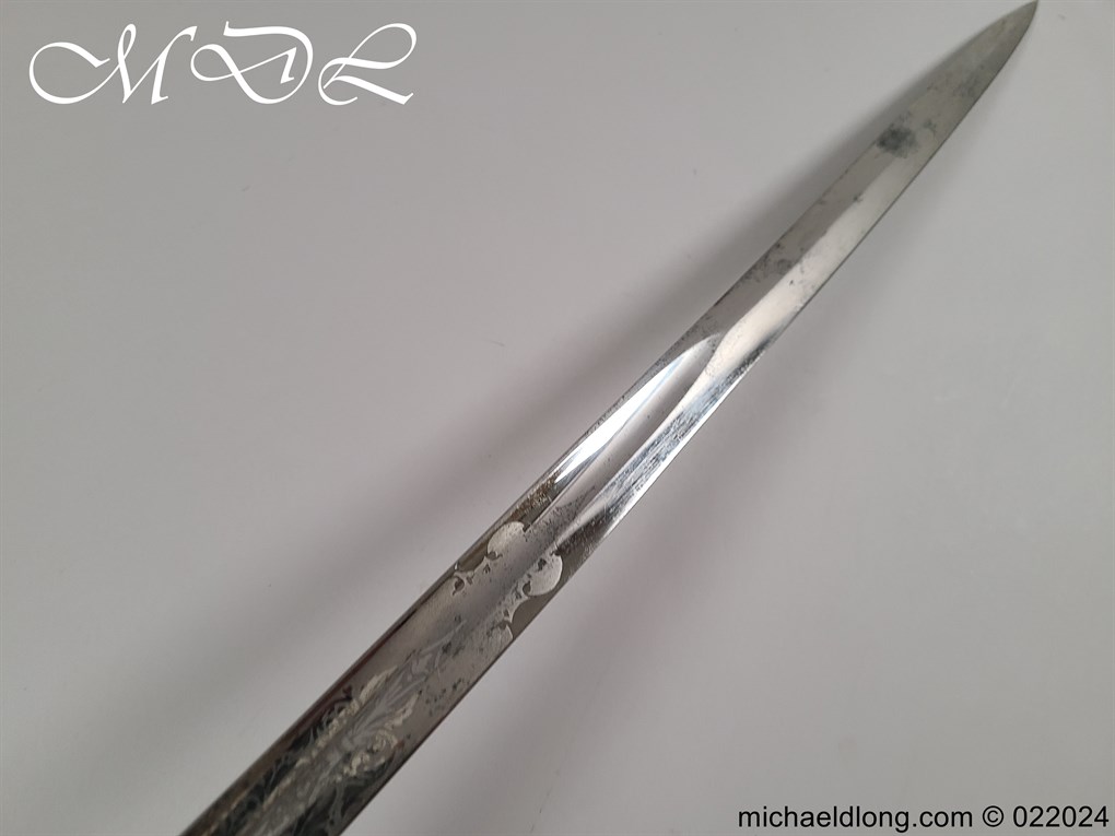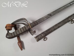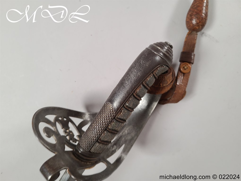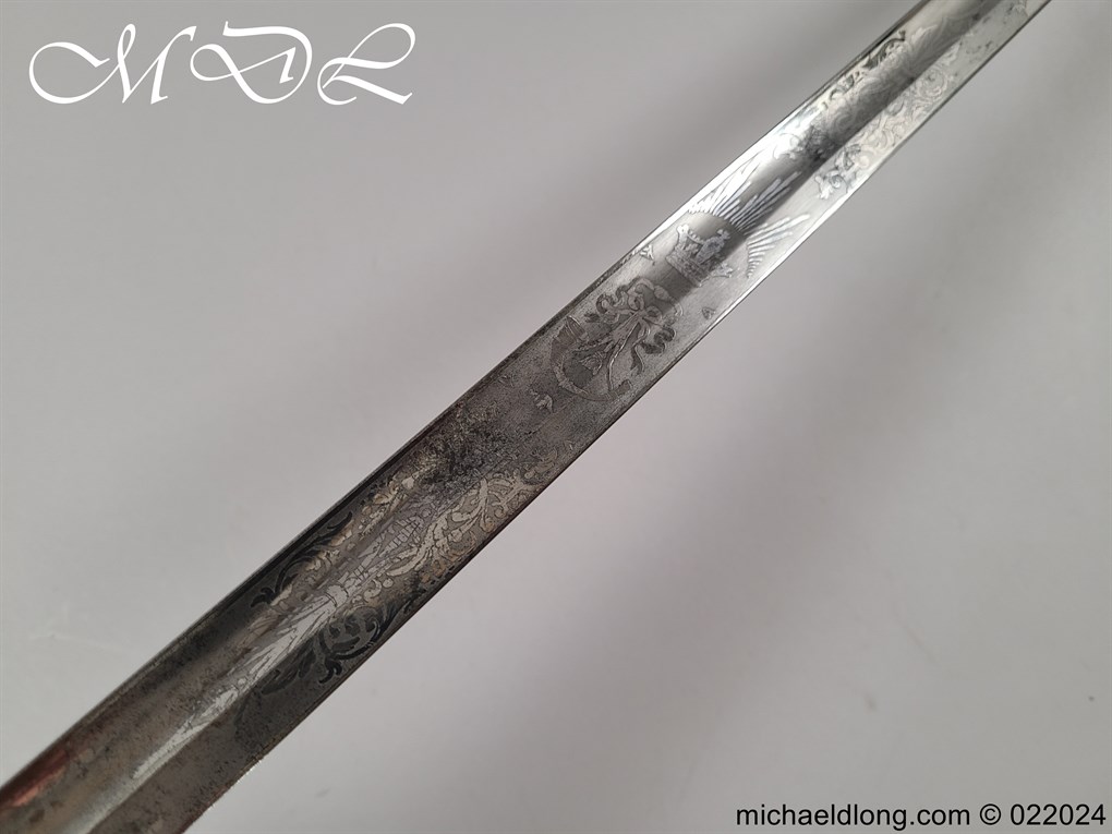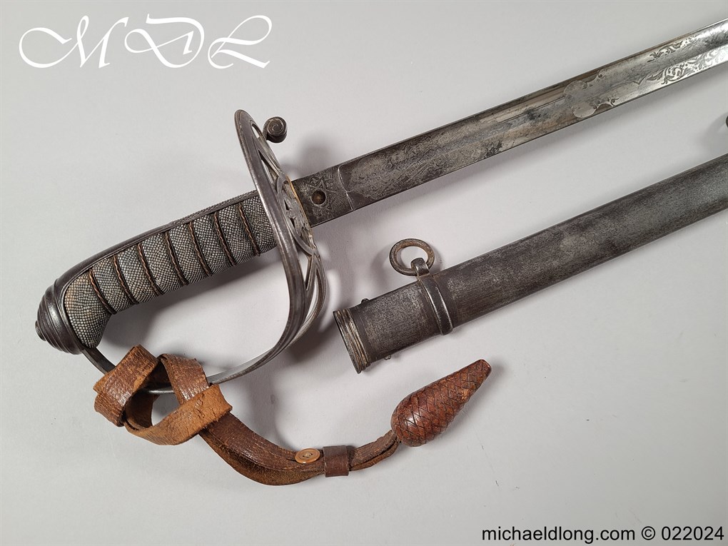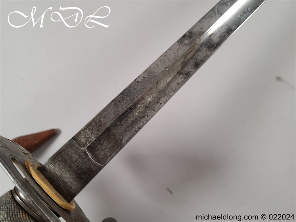 Victorian 22nd Auchmull Rifle Volunteers Officers Sword named to Andrew Smith. Regulation hilt with slung bugle and Victorian crown, fish skin grip, service knot and stepped pommel. The blade well etched with crown and bugle to one side the reverse with crown 22nd ARV and below Auchmull. Marked Hobson and son London and complete with steel scabbard, overall length 98cm the blade 82.5cm