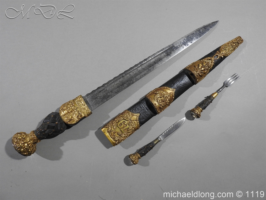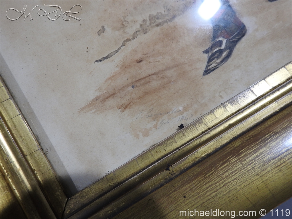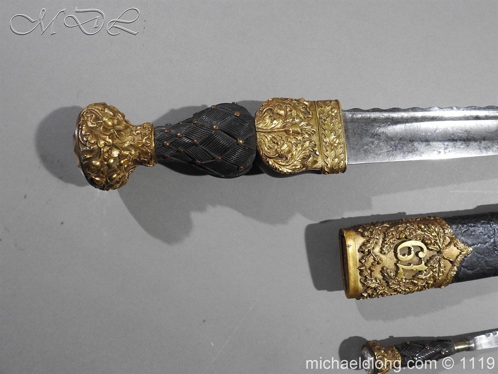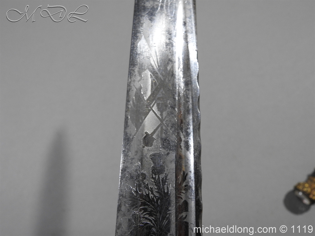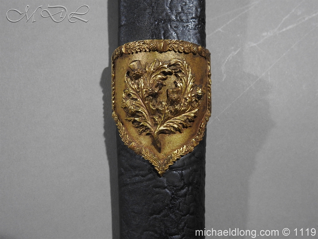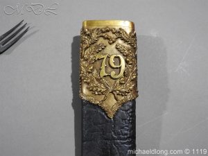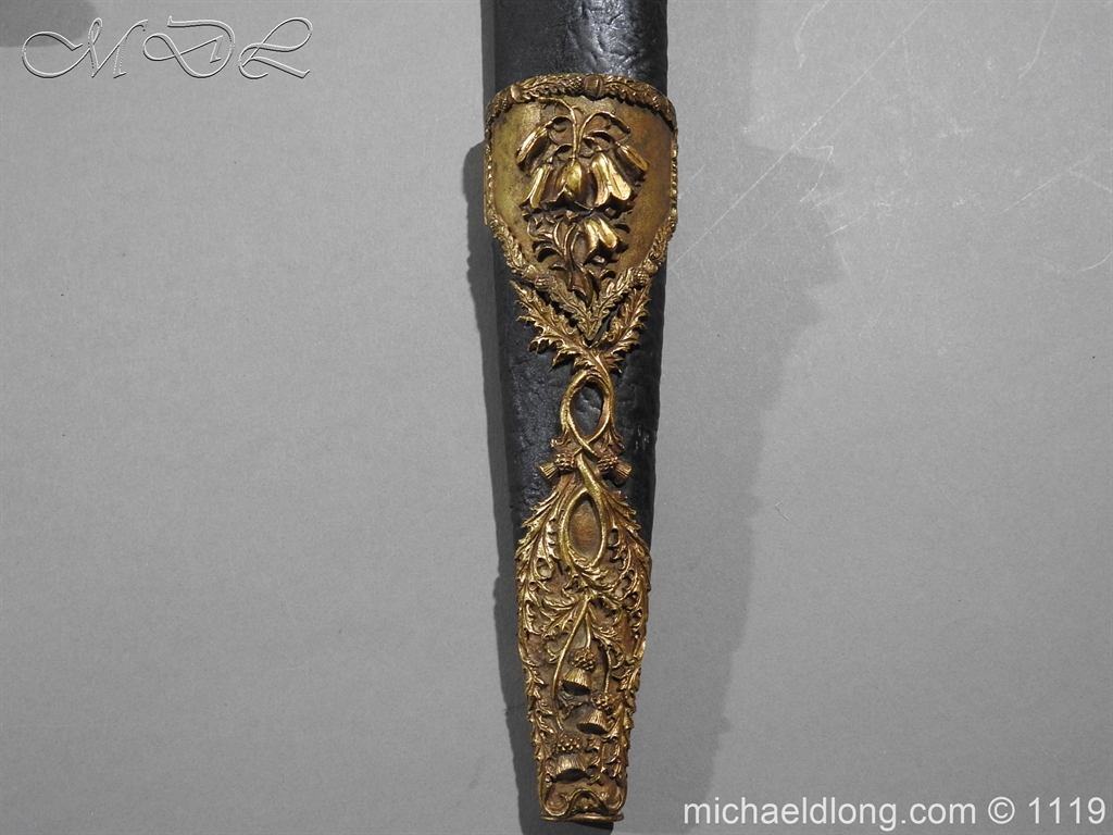 A charming collection of one officer’s items consisting of hi broadsword which retains it’s liner, fringe to the basket hilt and it’s black leather scabbard with steel mounts. 79th Highlanders dirk with etched blade heavy thistle ornamented gilt mounts to scabbard, bogwood grip terminating in heavy oakleaf decoration and foiled citrine with matching knife and fork. 79th large gilt sporran cantle bearing the battle honours Peninsula Egypt Waterloo Plaid or kilt pin in the form of a small basket hilted sword, his shoulder belt plate, plaide brooch, gilt glengarry style whistle boss, bronzed glengarry badge, white metal larger glengarry badge plus his Crimea Medal with clasp Sebastopol named to Captain Harry Murray 79th Highlanders. Together with a full length watercolour study of the captain in his 79th Highlanders uniform showing clearly all the above items signed and dated 1848 Sword and dirk matching Edinburgh makers
