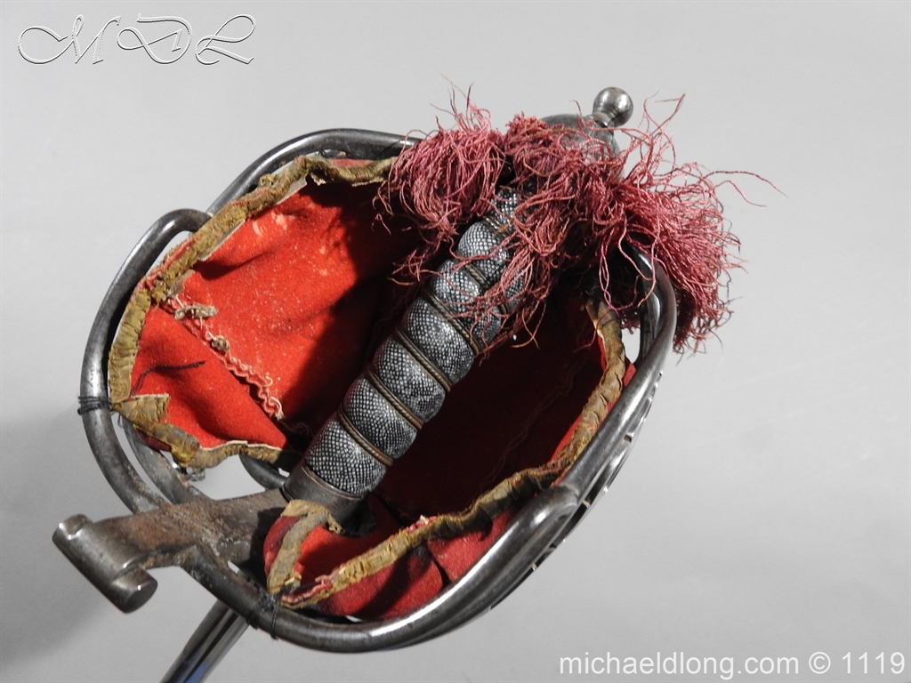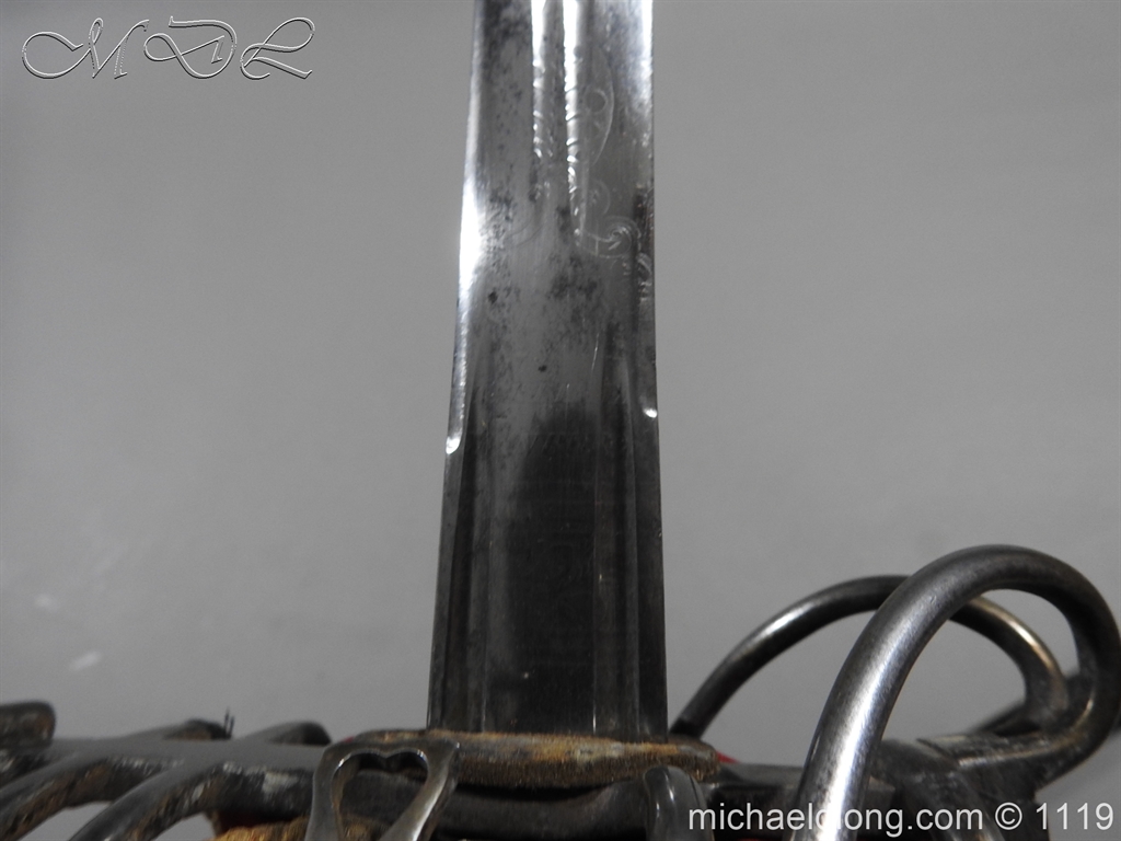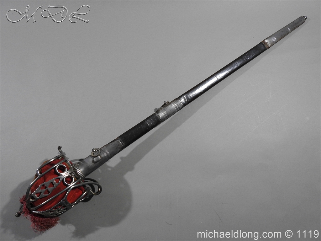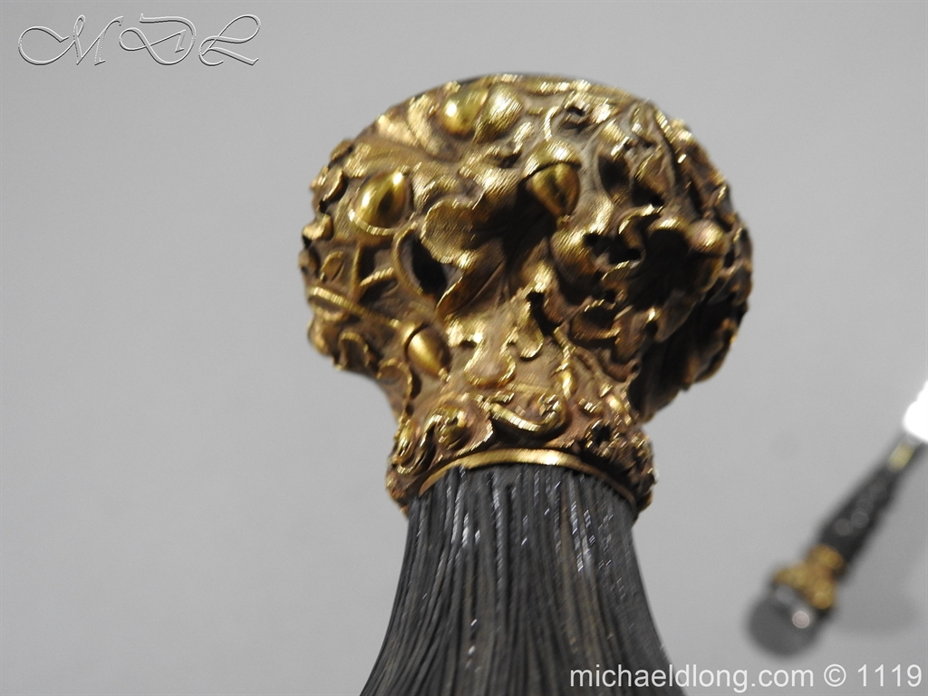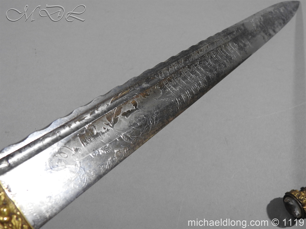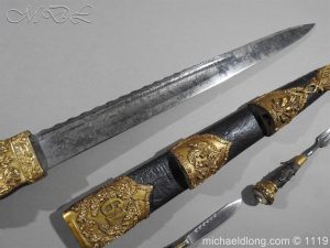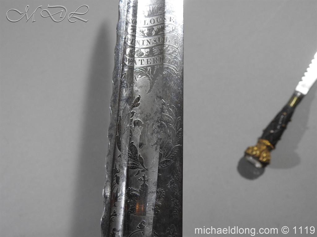 A charming collection of one officer’s items consisting of hi broadsword which retains it’s liner, fringe to the basket hilt and it’s black leather scabbard with steel mounts. 79th Highlanders dirk with etched blade heavy thistle ornamented gilt mounts to scabbard, bogwood grip terminating in heavy oakleaf decoration and foiled citrine with matching knife and fork. 79th large gilt sporran cantle bearing the battle honours Peninsula Egypt Waterloo Plaid or kilt pin in the form of a small basket hilted sword, his shoulder belt plate, plaide brooch, gilt glengarry style whistle boss, bronzed glengarry badge, white metal larger glengarry badge plus his Crimea Medal with clasp Sebastopol named to Captain Harry Murray 79th Highlanders. Together with a full length watercolour study of the captain in his 79th Highlanders uniform showing clearly all the above items signed and dated 1848 Sword and dirk matching Edinburgh makers