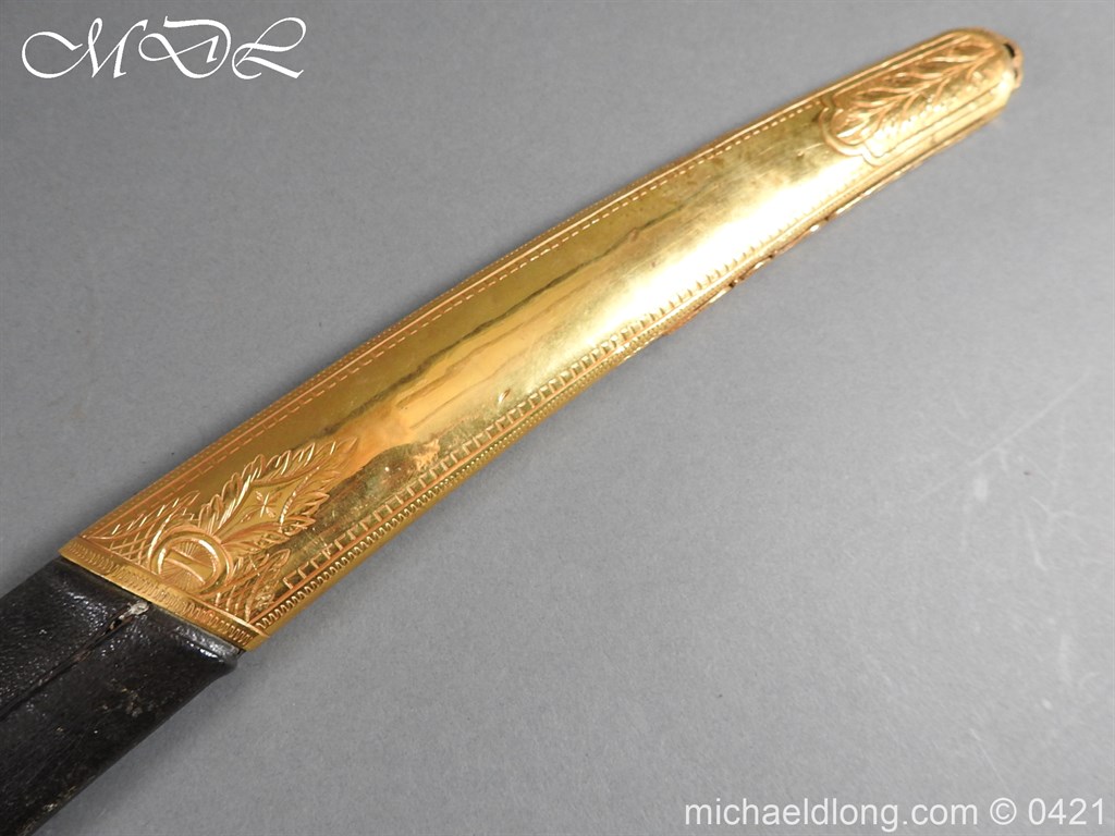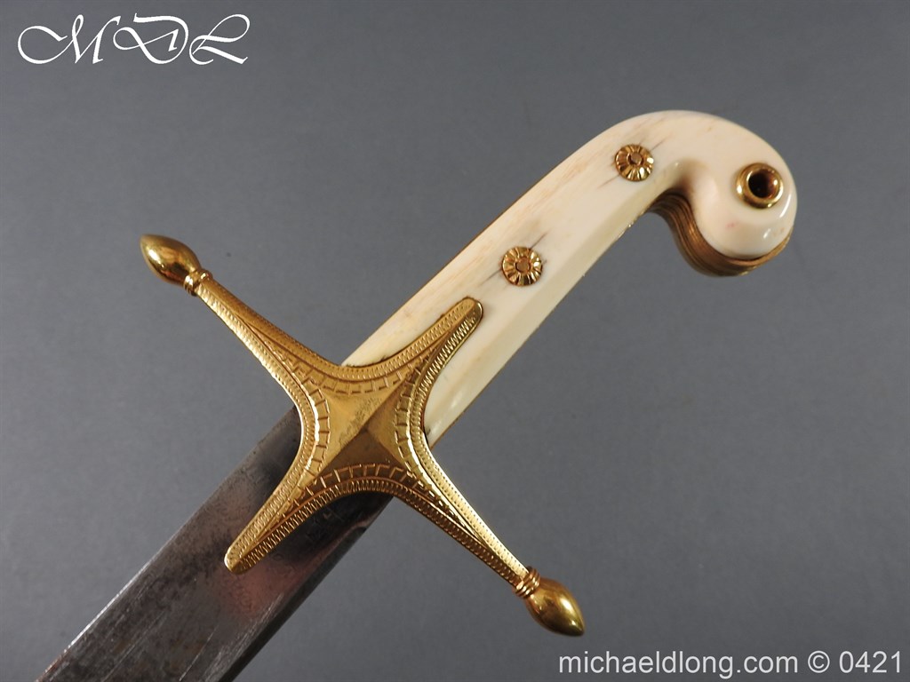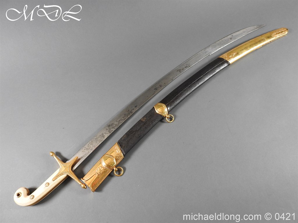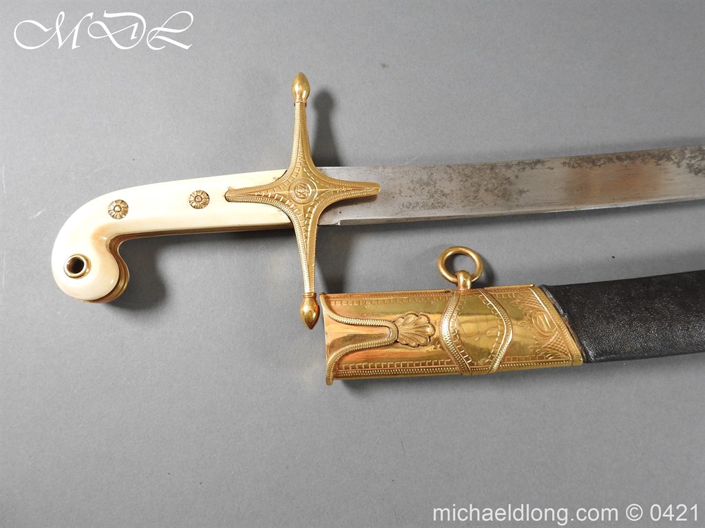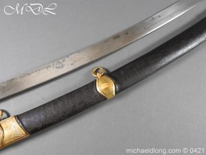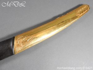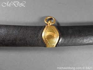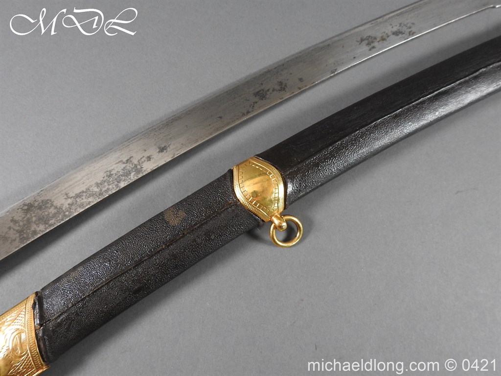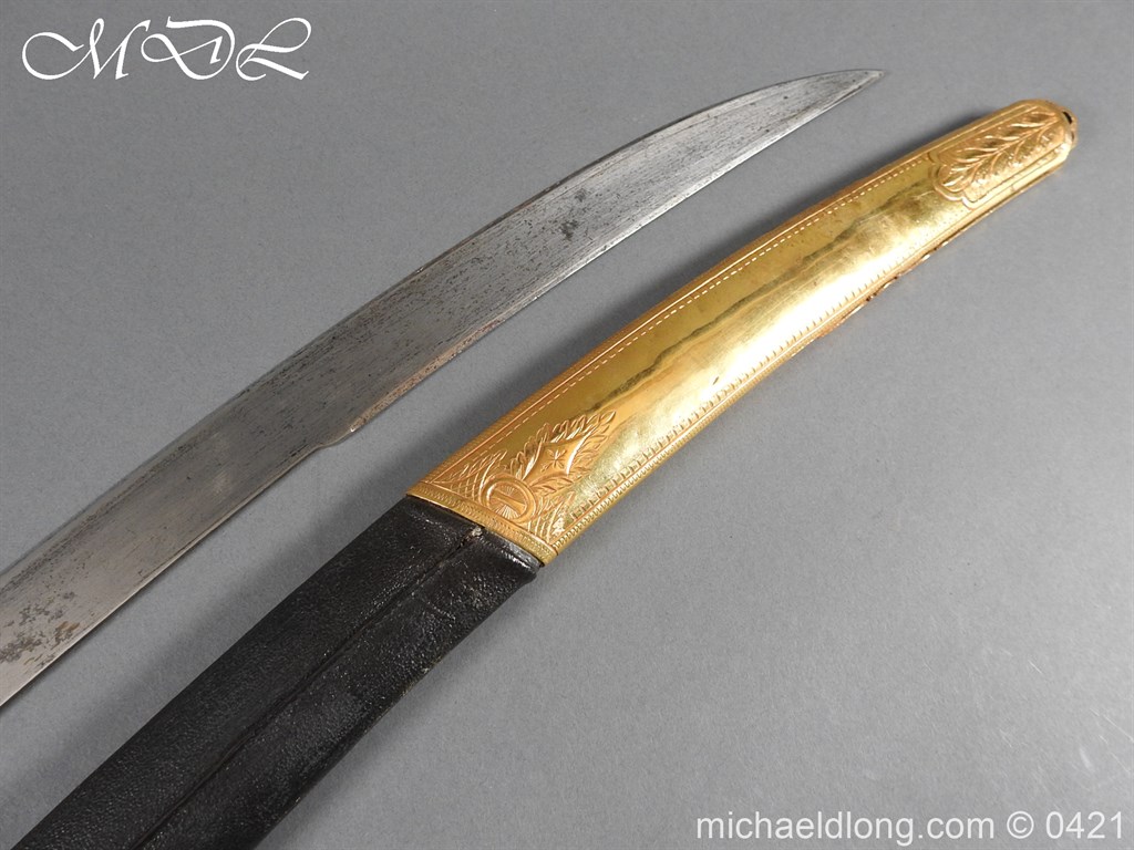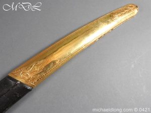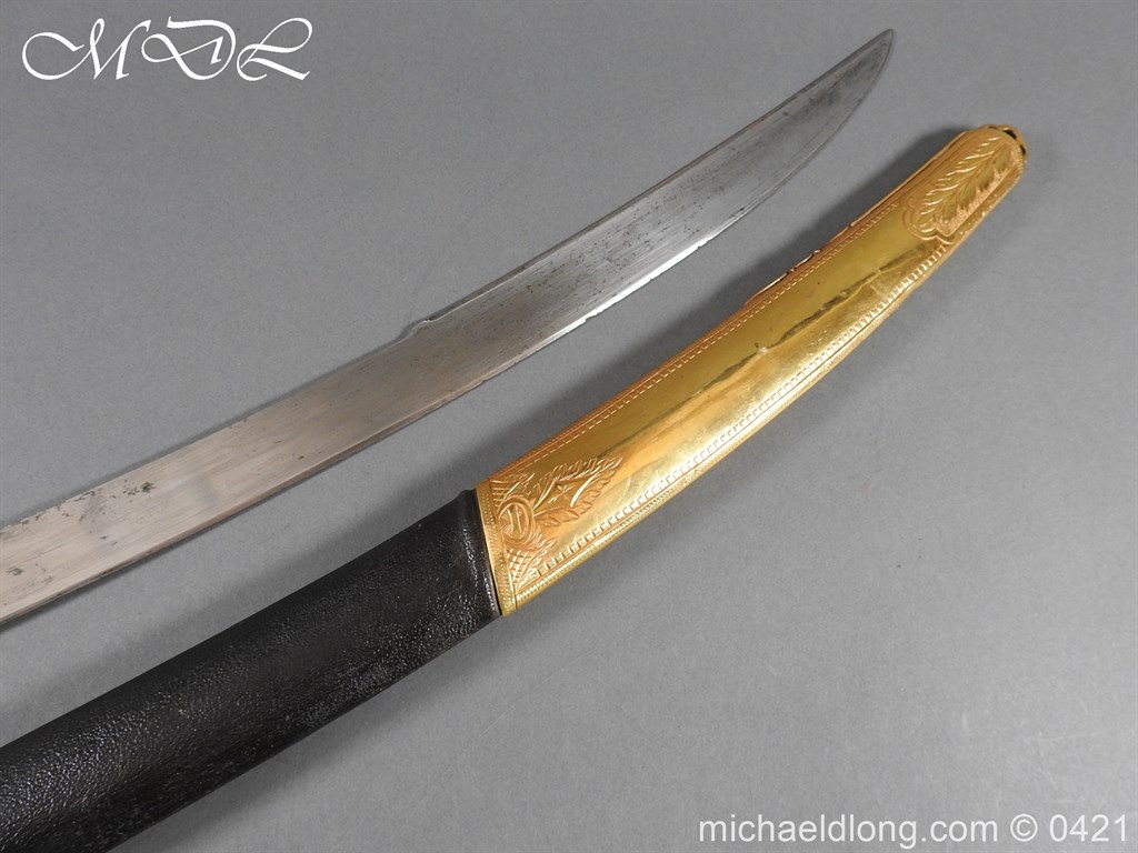 The sword is in excellent condition with super gilt finish to all the mounts, the leather scabbard is again excellent . Length 91cm blade 78cm Literature: “Previously Unrecorded Regimental Pattern 7th Hussars Mameluke by Chris Bryant” Attached below are images of a mameluke sword illustrating the previously unrecorded regimental pattern for the officers of 7th (Queen’s Own) Hussars, c.1805 – 1845. This very specific pattern, down to the details of the engraving on the hilt and scabbard mounts, appears to have been introduced by Lord Uxbridge (later Marquess of Anglesey) as Colonel of the regiment and retained throughout his Colonelcy of the 7th Hussars until December 1842. The pattern is discernible in period paintings of 7th Hussars officers as early as 1805, and evidently remained in use within the regiment as late as 1837, as two examples externally identical to earlier specimens are known with regimentally engraved blades bearing a VR cypher. As a regimental pattern, it does not appear to have been noticed by modern authors, perhaps because it appears to have gone out of use by the mid 1840’s (before the age of photography), and because most of the observed surviving examples have plain, unmarked blades. There is sufficient consistent evidence, however, from surviving regimentally marked examples, examples with provenance to officers of the 7th Hussars, and several period portraits of 7th Hussars officers carrying this pattern sword, for it to be recognized as the regimental pattern of the 7th Hussars between c.1805 and c.1845. These and other known early examples all have similar substantial clipped back flat un-fullered blades, generally without engraved decoration. The two later examples with regimentally engraved blades and VR cyphers have similarly formed blades, but narrower in width. The blade on the example illustrated below has its original chemically darkened finish, like blueing but dark grey, applied to its entire surface. I would associate a finish like this with the requirements of active service – as such there would have been no reason for it to have occurred after 1815. Major Hodge’s sword, carried at Quatre Bras, supports the fact that the pattern was carried on active service as well as serving as a dress sword.