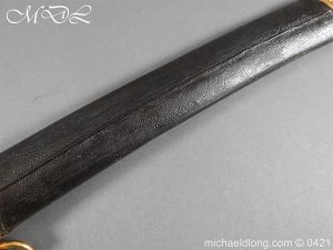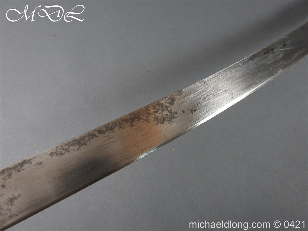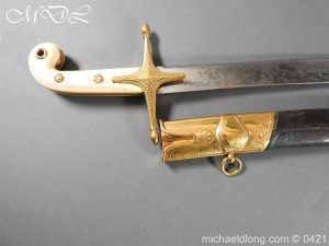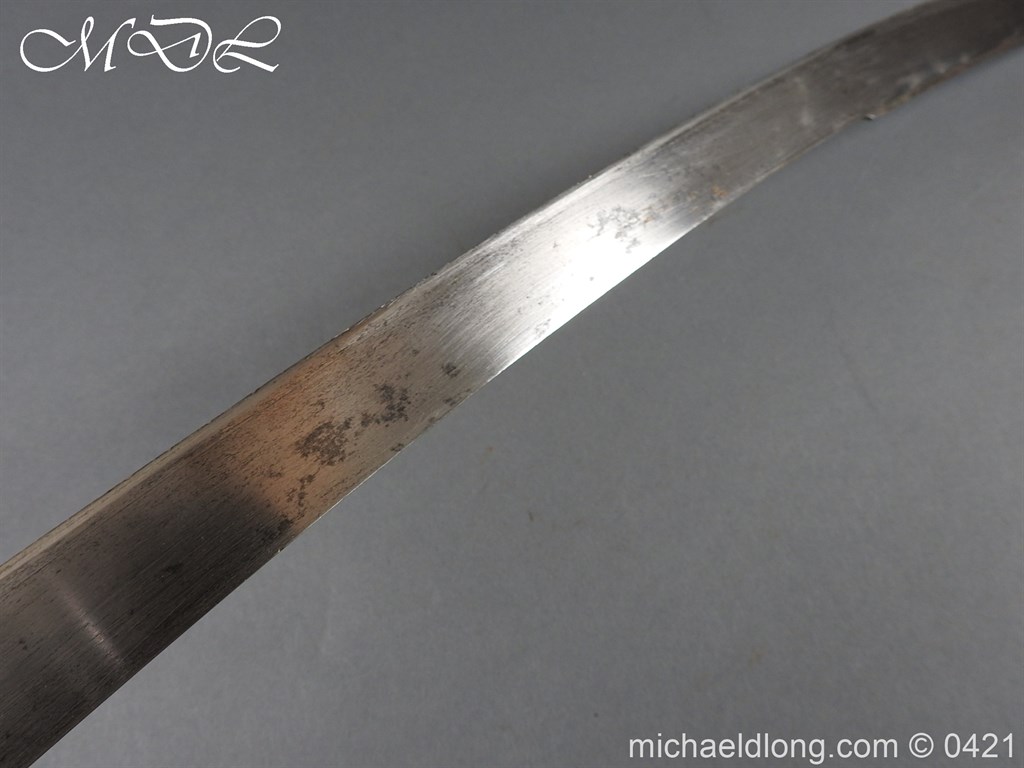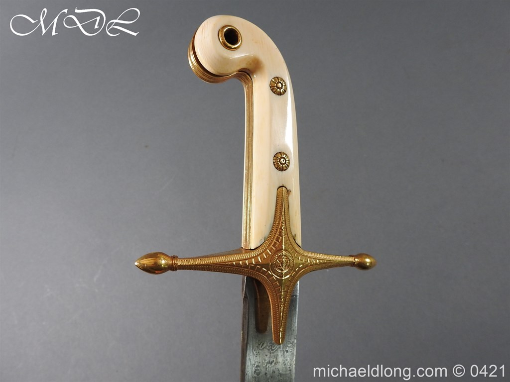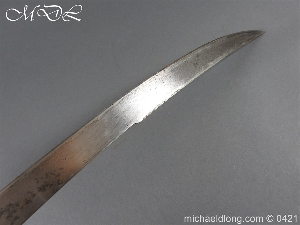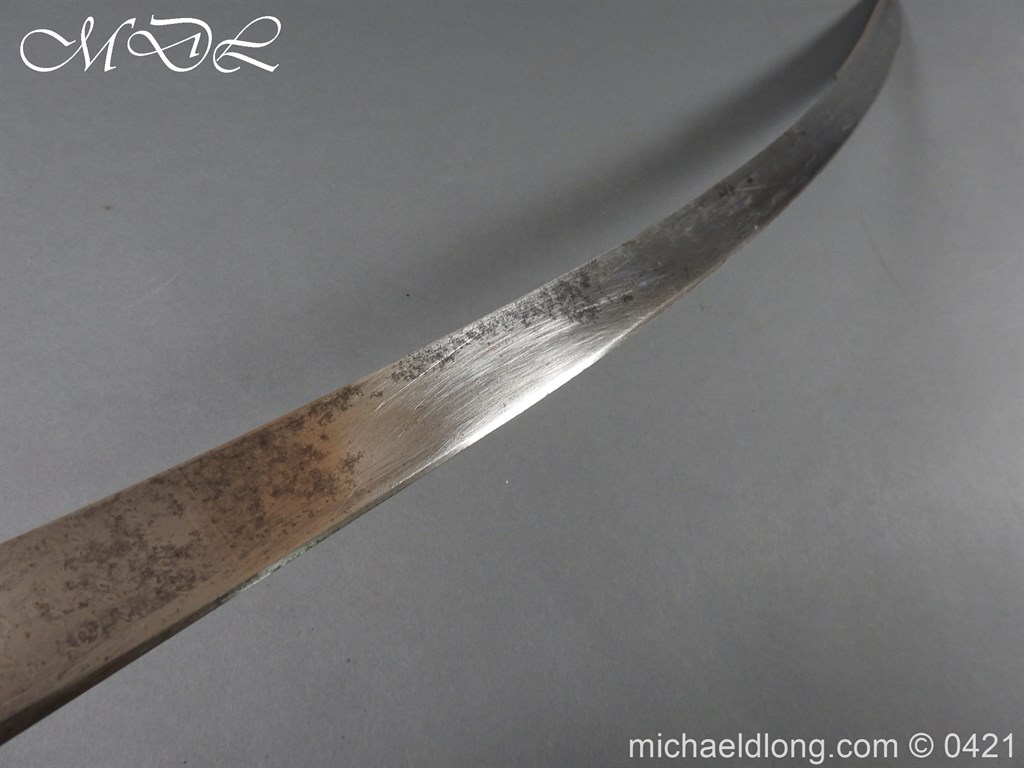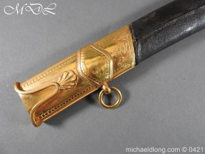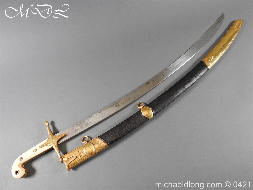 The sword is in excellent condition with super gilt finish to all the mounts, the leather scabbard is again excellent . Length 91cm blade 78cm Literature: “Previously Unrecorded Regimental Pattern 7th Hussars Mameluke by Chris Bryant” Attached below are images of a mameluke sword illustrating the previously unrecorded regimental pattern for the officers of 7th (Queen’s Own) Hussars, c.1805 – 1845. This very specific pattern, down to the details of the engraving on the hilt and scabbard mounts, appears to have been introduced by Lord Uxbridge (later Marquess of Anglesey) as Colonel of the regiment and retained throughout his Colonelcy of the 7th Hussars until December 1842. The pattern is discernible in period paintings of 7th Hussars officers as early as 1805, and evidently remained in use within the regiment as late as 1837, as two examples externally identical to earlier specimens are known with regimentally engraved blades bearing a VR cypher. As a regimental pattern, it does not appear to have been noticed by modern authors, perhaps because it appears to have gone out of use by the mid 1840’s (before the age of photography), and because most of the observed surviving examples have plain, unmarked blades. There is sufficient consistent evidence, however, from surviving regimentally marked examples, examples with provenance to officers of the 7th Hussars, and several period portraits of 7th Hussars officers carrying this pattern sword, for it to be recognized as the regimental pattern of the 7th Hussars between c.1805 and c.1845. These and other known early examples all have similar substantial clipped back flat un-fullered blades, generally without engraved decoration. The two later examples with regimentally engraved blades and VR cyphers have similarly formed blades, but narrower in width. The blade on the example illustrated below has its original chemically darkened finish, like blueing but dark grey, applied to its entire surface. I would associate a finish like this with the requirements of active service – as such there would have been no reason for it to have occurred after 1815. Major Hodge’s sword, carried at Quatre Bras, supports the fact that the pattern was carried on active service as well as serving as a dress sword.