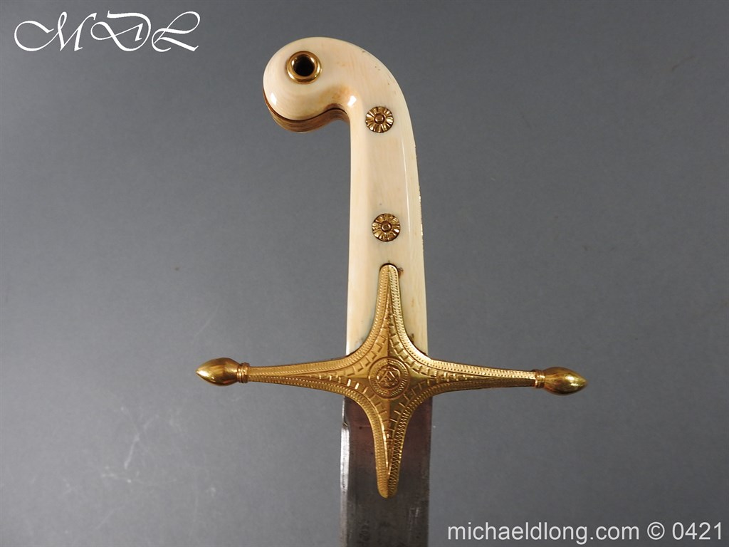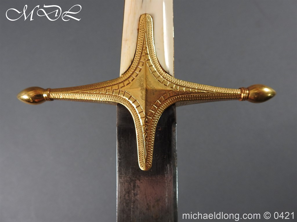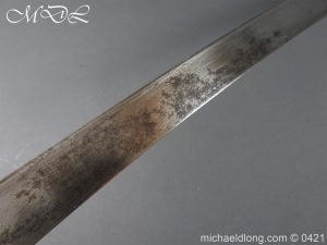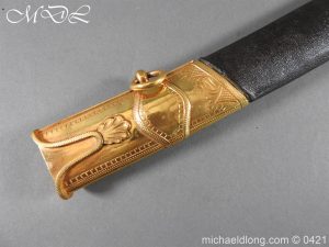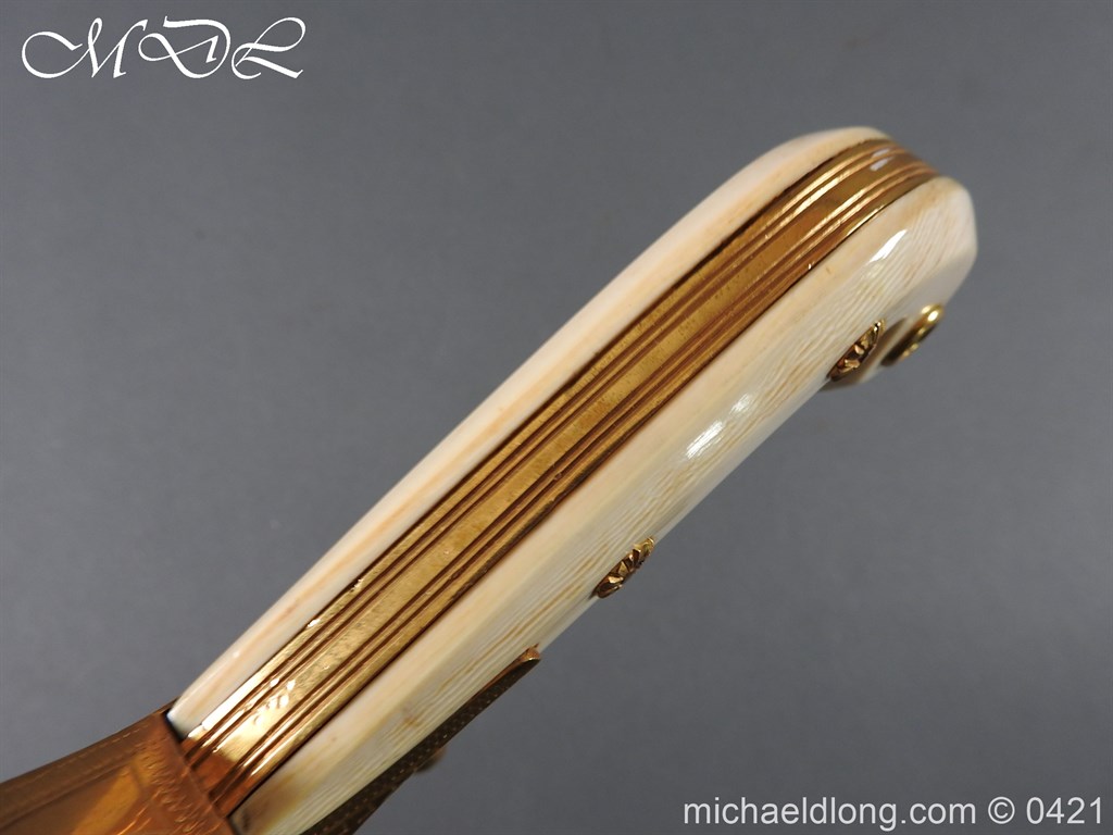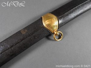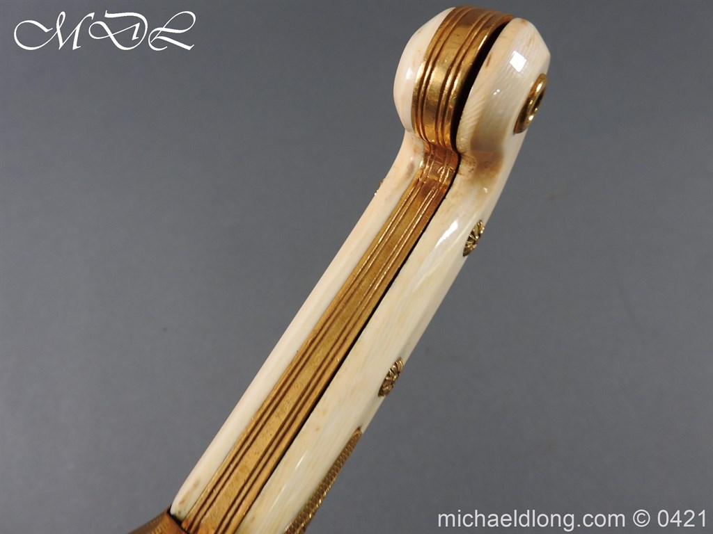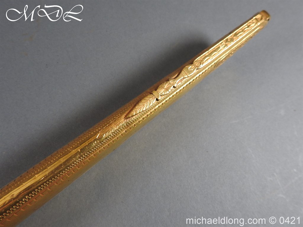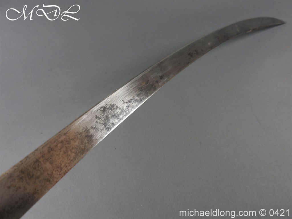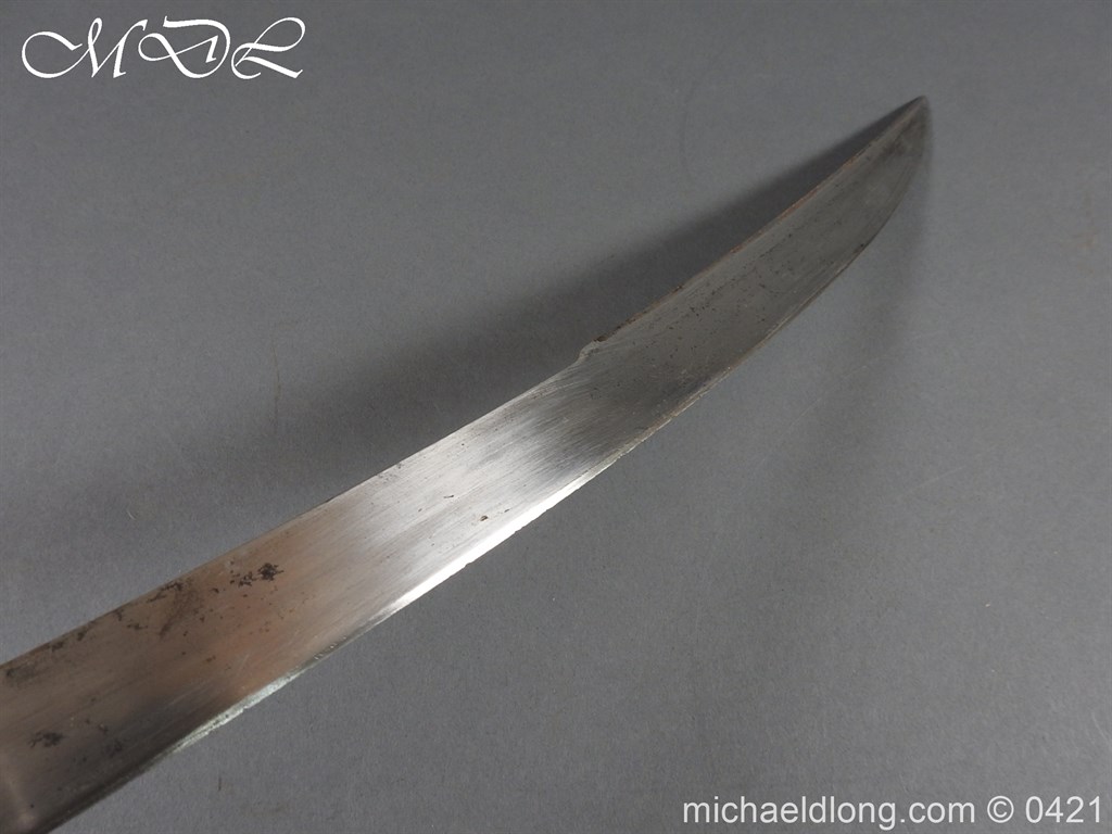 The sword is in excellent condition with super gilt finish to all the mounts, the leather scabbard is again excellent . Length 91cm blade 78cm Literature: “Previously Unrecorded Regimental Pattern 7th Hussars Mameluke by Chris Bryant” Attached below are images of a mameluke sword illustrating the previously unrecorded regimental pattern for the officers of 7th (Queen’s Own) Hussars, c.1805 – 1845. This very specific pattern, down to the details of the engraving on the hilt and scabbard mounts, appears to have been introduced by Lord Uxbridge (later Marquess of Anglesey) as Colonel of the regiment and retained throughout his Colonelcy of the 7th Hussars until December 1842. The pattern is discernible in period paintings of 7th Hussars officers as early as 1805, and evidently remained in use within the regiment as late as 1837, as two examples externally identical to earlier specimens are known with regimentally engraved blades bearing a VR cypher. As a regimental pattern, it does not appear to have been noticed by modern authors, perhaps because it appears to have gone out of use by the mid 1840’s (before the age of photography), and because most of the observed surviving examples have plain, unmarked blades. There is sufficient consistent evidence, however, from surviving regimentally marked examples, examples with provenance to officers of the 7th Hussars, and several period portraits of 7th Hussars officers carrying this pattern sword, for it to be recognized as the regimental pattern of the 7th Hussars between c.1805 and c.1845. These and other known early examples all have similar substantial clipped back flat un-fullered blades, generally without engraved decoration. The two later examples with regimentally engraved blades and VR cyphers have similarly formed blades, but narrower in width. The blade on the example illustrated below has its original chemically darkened finish, like blueing but dark grey, applied to its entire surface. I would associate a finish like this with the requirements of active service – as such there would have been no reason for it to have occurred after 1815. Major Hodge’s sword, carried at Quatre Bras, supports the fact that the pattern was carried on active service as well as serving as a dress sword.