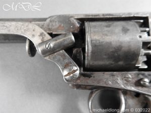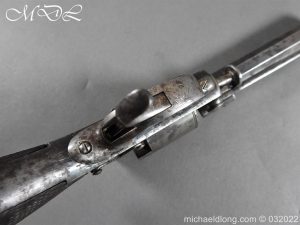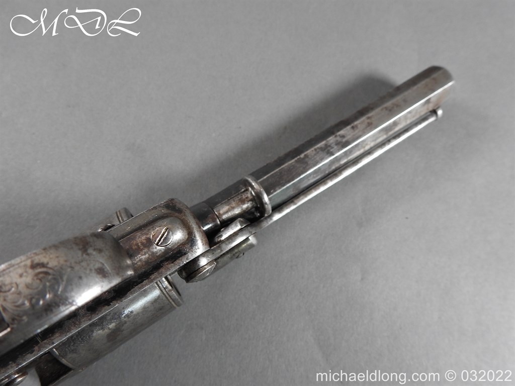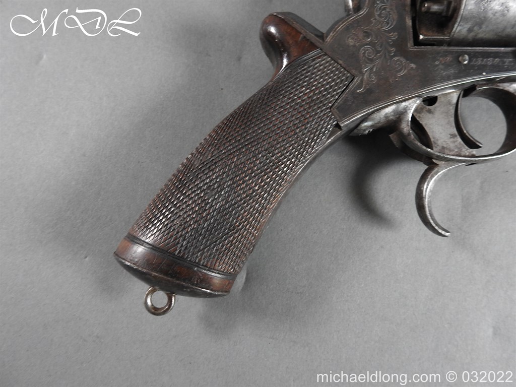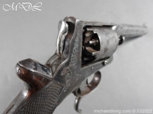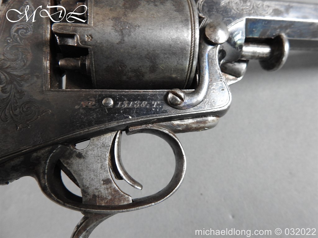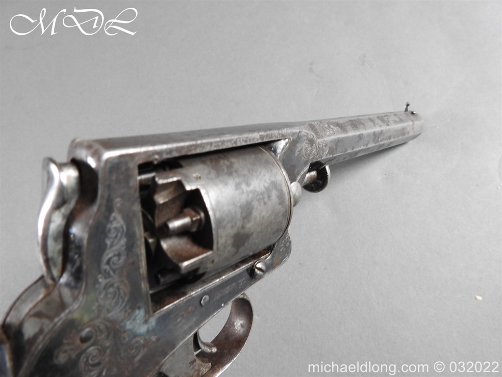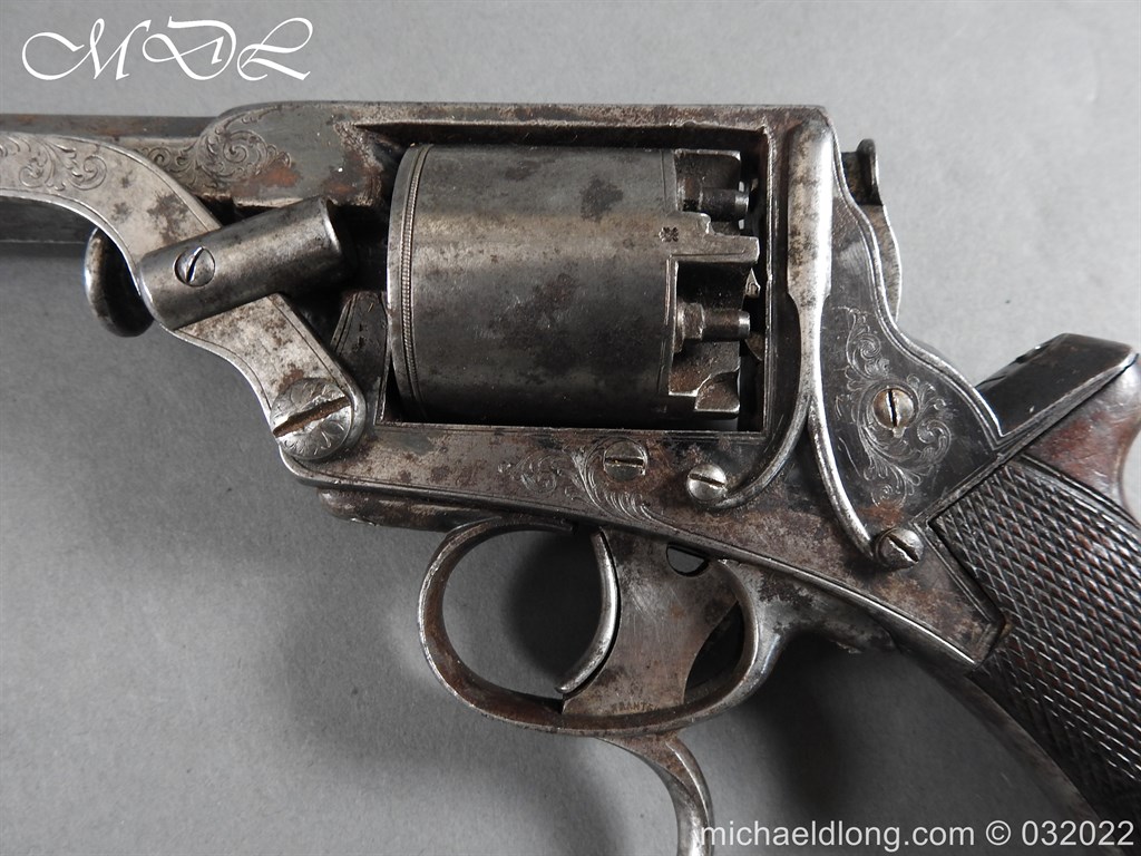 Tranter 80 Bore Percussion Revolver the frame engraved with floral design and serial number 18138T action in working order with 4.5 inch barrel. Cylinder with Victorian proof marks 5 shot and with tranter patent rammer and double trigger. Complete with chequered one piece grip with engraved butt cap. This historic revolver is of an obsolete caliber and can therefore be owned live without any form of license. It can be fully stripped, cock and dry fired – UK Delivery address only please