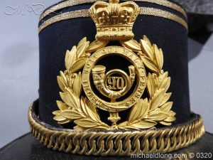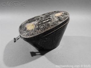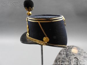 A super and scare Victorian 90th Light Infantry Officer’s Shako named to Captain John Henry Hedges. The gilt fittings are excellent as it has been stored in original transit tin named to the J H Hedges, however the cloth on the top has suffered slightly due to the same reason storage in the tin. The melton cloth otherwise is super, trimmed with gold lace with a flat patent leather peak and velvet backed chin chain. The interior of the shako has a light beige leather sweatband and crimson silk lining embossed with gilt tooled tailor’s details of Henry Venn 42 Jermyn Sreet London
