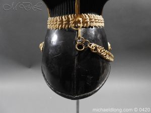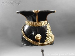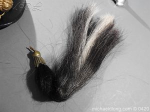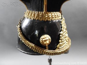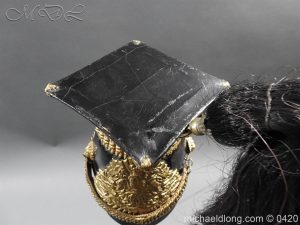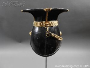 This is an original, Trooper’s Lance Cap of the 9th Queen’s Royal Lancer’s The Lance Cap has the correct internal construction, skull and peak of black patent leather with correct brass rope effect waist. The rear has the correct brass ring & hook. The sides are covered in black facing cloth. Brass piping with ornate finials extends down the 4 angles. The cap has the correct brass rosette with Victorian Crown and 9 brass button and Lion’s head bosses with correct leather backed link brass chain. It has a brass plume boss with black & white horse hair plume. The cap is fitted with correct rayed plate and badge comprising the Queens Crown Royal arms, Queen Adelaide ‘AR’ Royal cipher and Battle honours up to and including Afghanistan 1878-80 Please note inside the helmet is WD marked and dated 1911 however has a Victorian plate it maybe the helmet was reissued