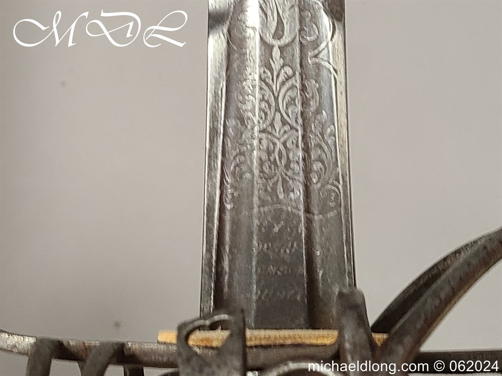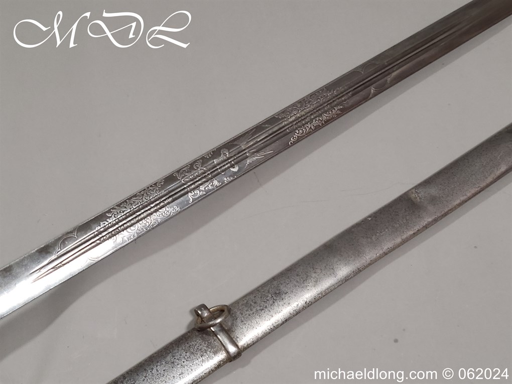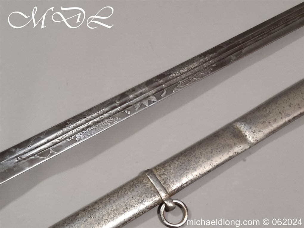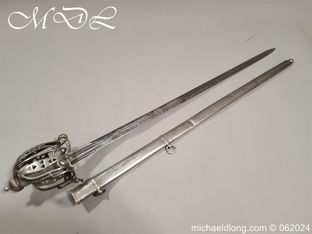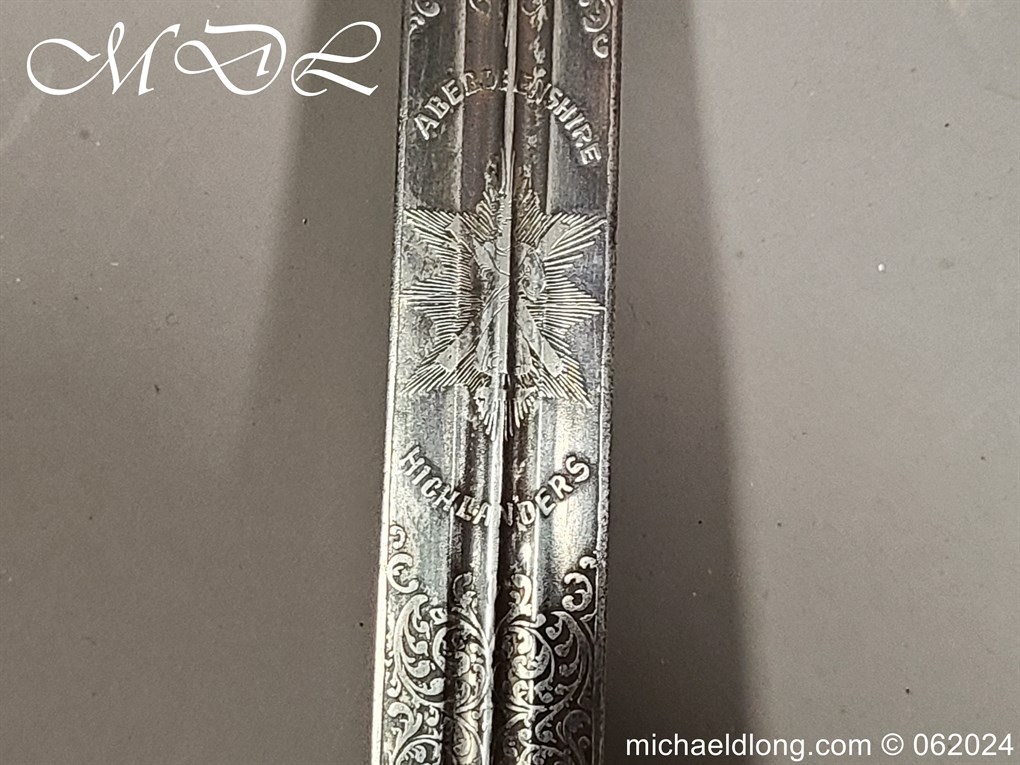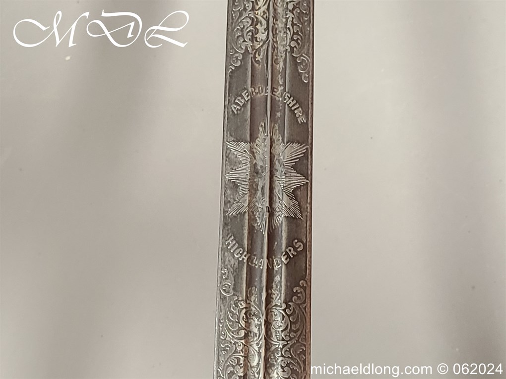 Aberdeenshire Highlanders Victorian Officers Sword, early example regulation basket with fish skin grip secured with twisted brass wire. The blade broad sword with deep engraving one side V R and Crown the reverse with Aberdeenshire Highlanders and regimental badge and Meyer Dublin. Complete with steel scabbard with two loose rings. Overall length 98cm the blade 82cm