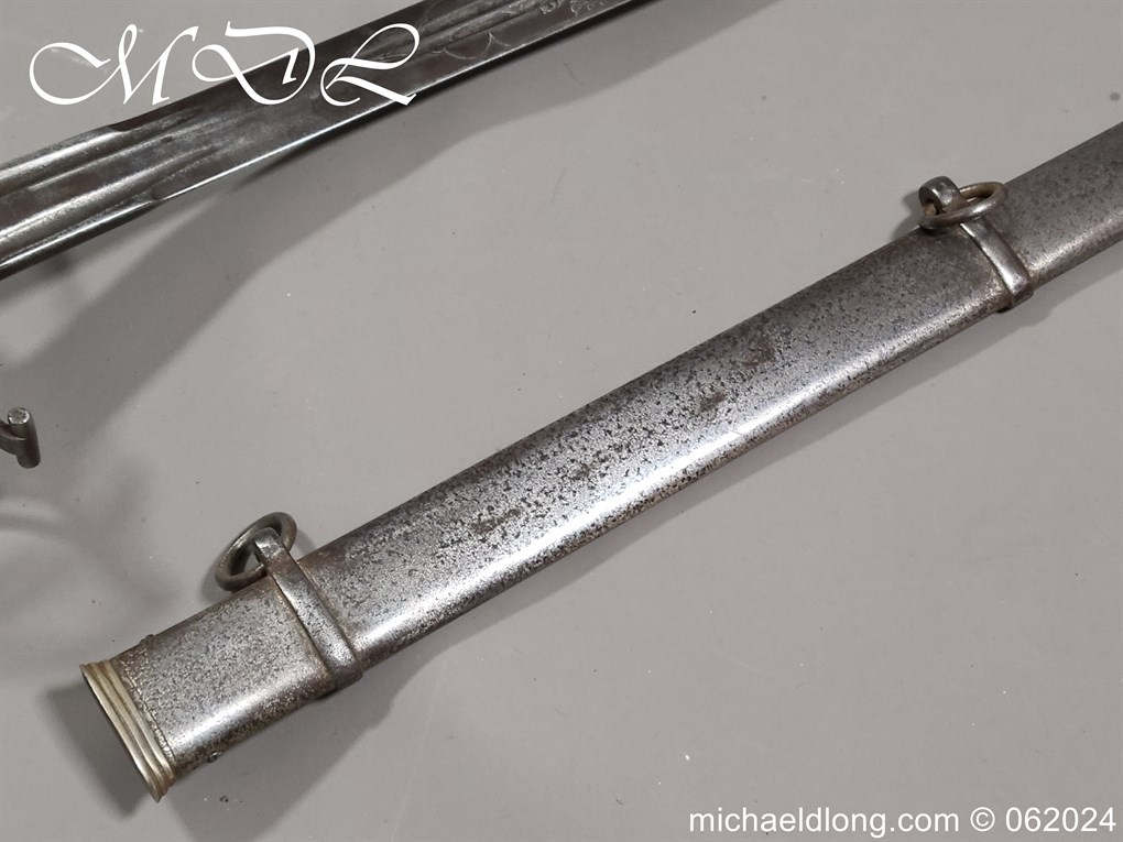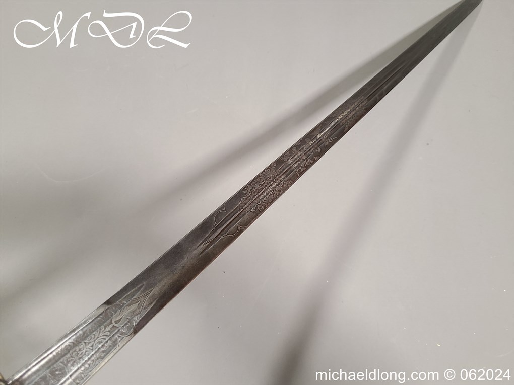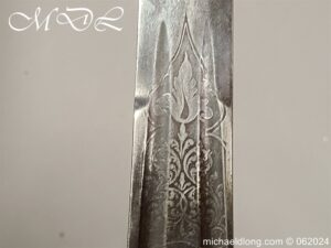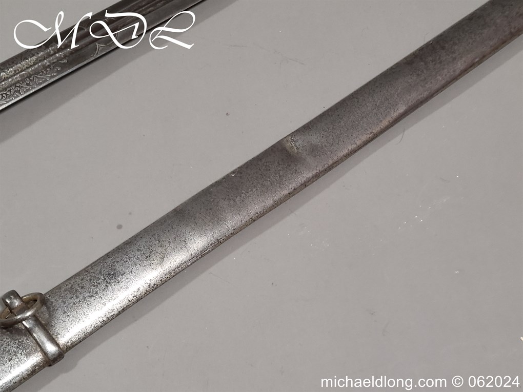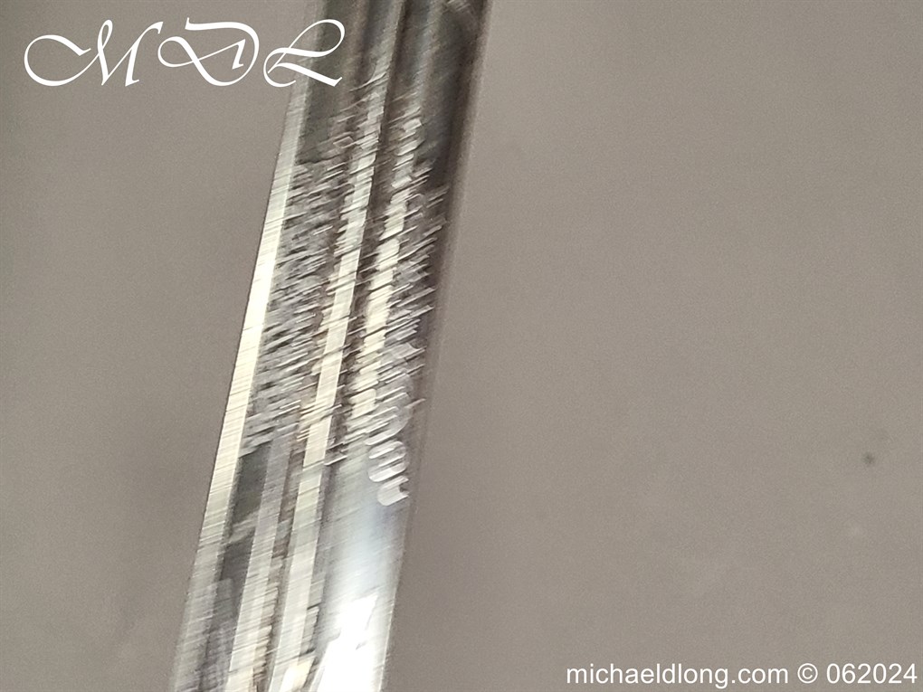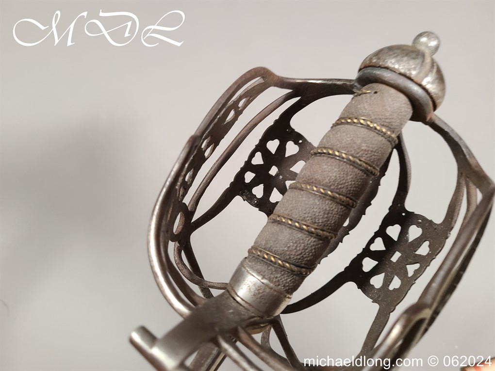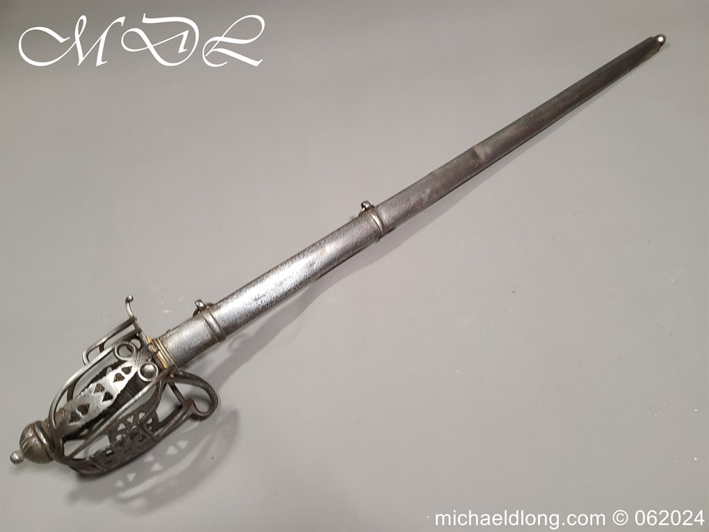 Aberdeenshire Highlanders Victorian Officers Sword, early example regulation basket with fish skin grip secured with twisted brass wire. The blade broad sword with deep engraving one side V R and Crown the reverse with Aberdeenshire Highlanders and regimental badge and Meyer Dublin. Complete with steel scabbard with two loose rings. Overall length 98cm the blade 82cm