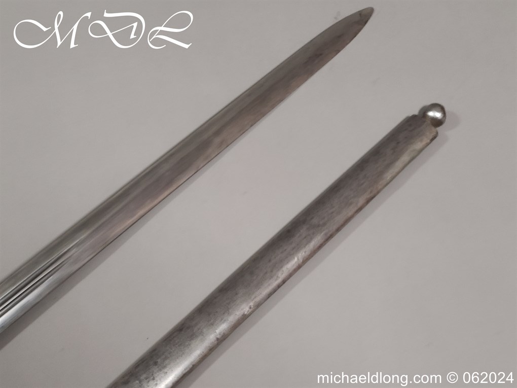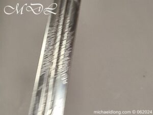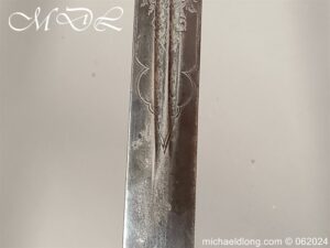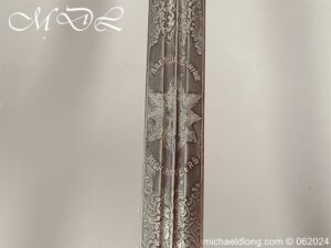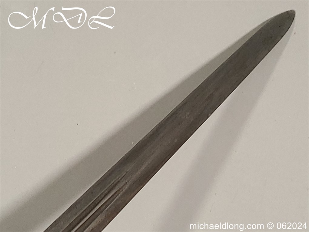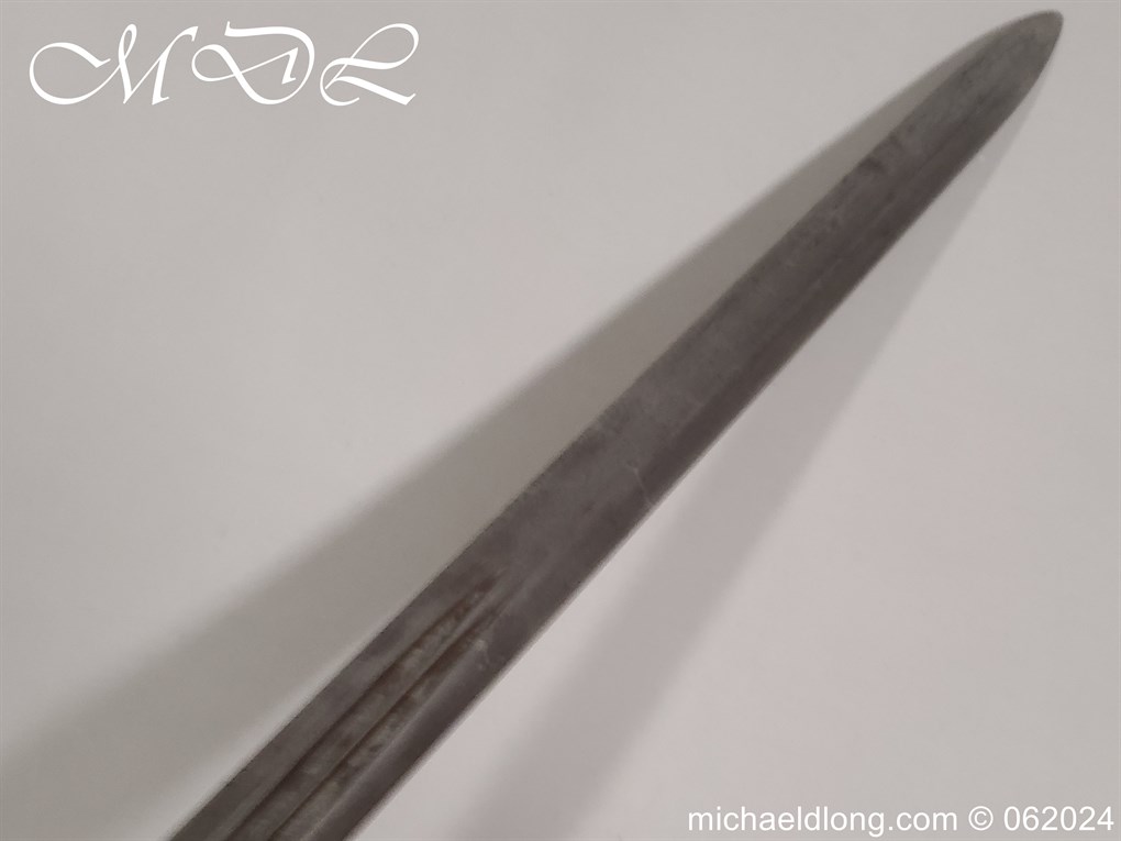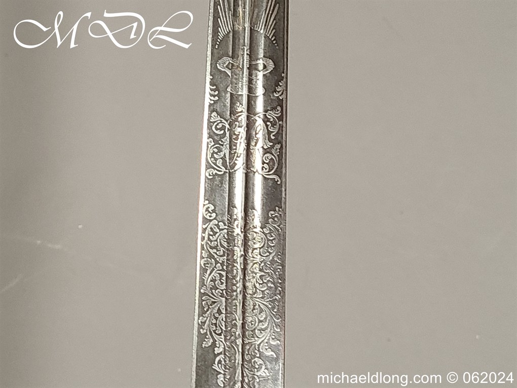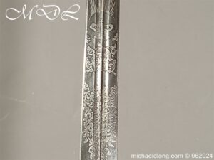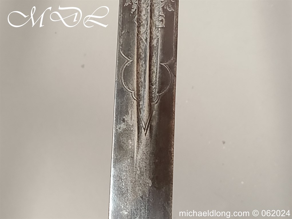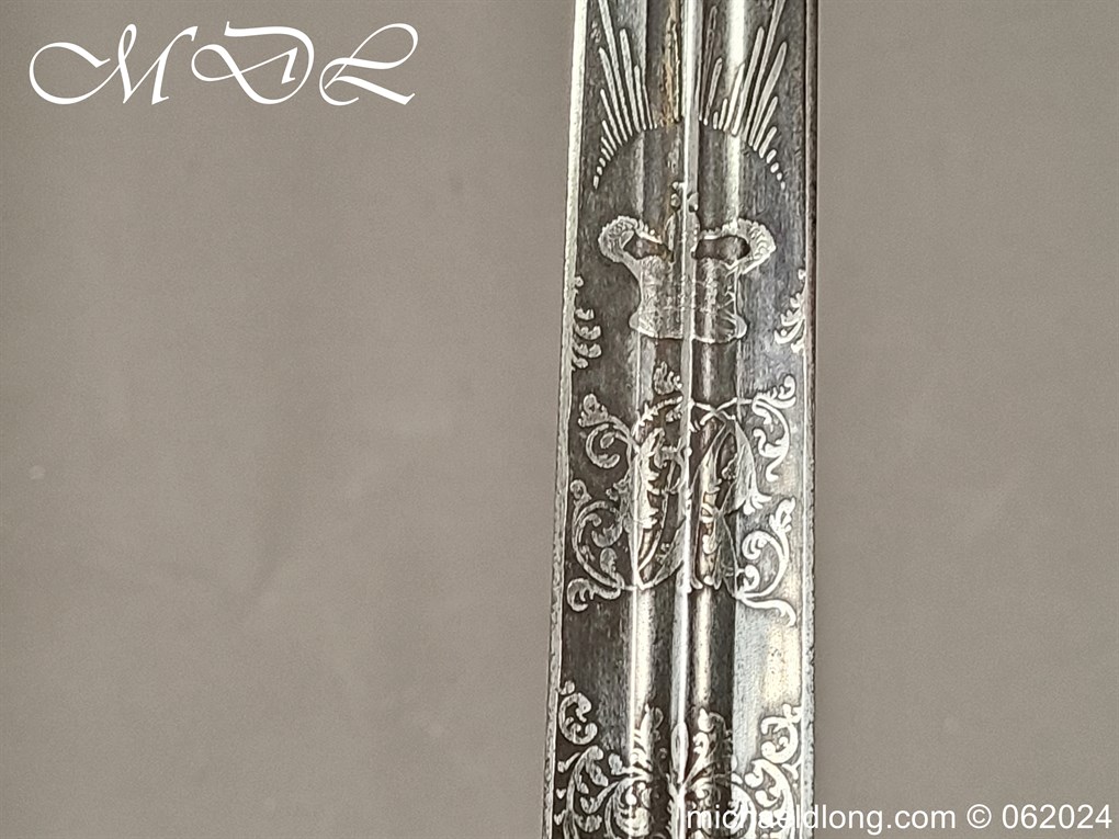 Aberdeenshire Highlanders Victorian Officers Sword, early example regulation basket with fish skin grip secured with twisted brass wire. The blade broad sword with deep engraving one side V R and Crown the reverse with Aberdeenshire Highlanders and regimental badge and Meyer Dublin. Complete with steel scabbard with two loose rings. Overall length 98cm the blade 82cm