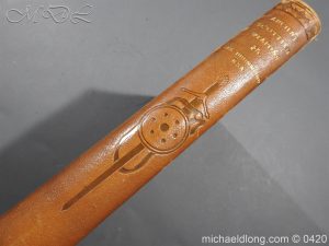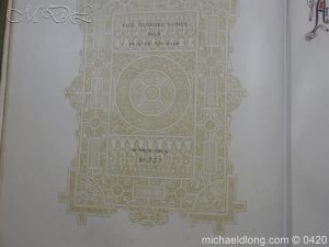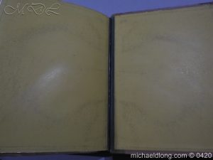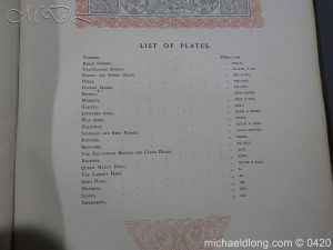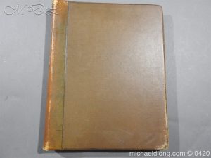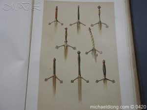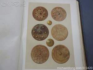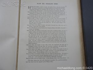 Large folio quarter leather and cloth binding, with 23 coloured plates and descriptive text for each. Illustrating targets, broad swords, two-handed swords, swords and sword hilts, dirks, powder horns, pistols, muskets, glaives, lochaber axes, war axes, halberds, sporrans and belt purses, pouches, brooches, The Ballochyle Brooch and Clach dearg, bagpipes, Queen Mary’s harp, The Lamont Harp, Irish harp, methers, spades, and implements.
