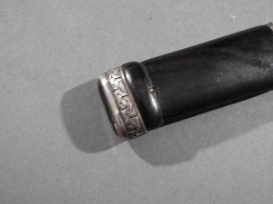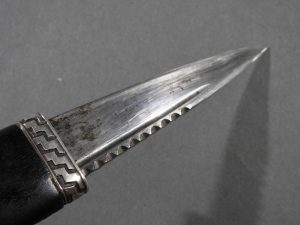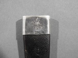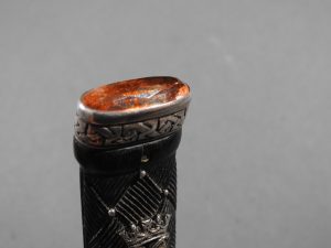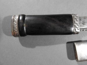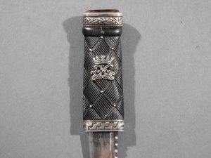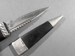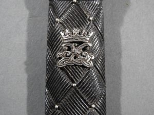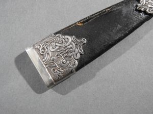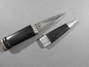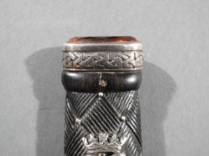 Argyll and Sutherland Highlanders Sgian Dubh with silver hall marks and maker marked MC the large basket weave carved handle with applied studs and cipher with stone to pommel, the curved steel blade with a single fuller and scalloped back edge, the leather scabbard with Celtic beast mounts slight age wear to one edge