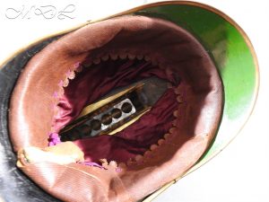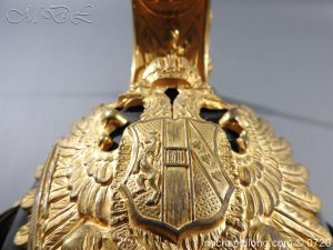 Austrian dragoon helmet possibly earlier model than the 1905 as taller but not sure, black metal skull, gilt binding to front and rear peaks, tall sharply curved comb, the frosted gilt panel sides embossed with an impressive lion engaged with a serpent, plain top, under the curl at the front a crowned FJI monogram above a trophy of flags and armour, inverted V’s at the sides of the skull down to lion head ear roundels and stylised oak wreath chin scales on leather backing, double headed eagle roundels and stylised oak wreath chin scales on leather backing, double headed eagle with Austrian Arms to helmet plate, leather and cloth lining