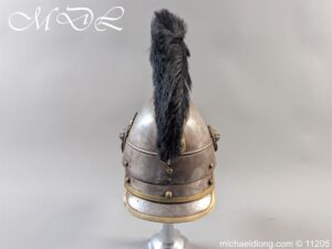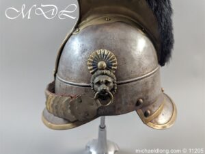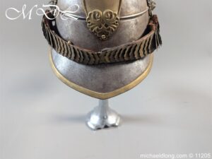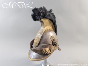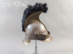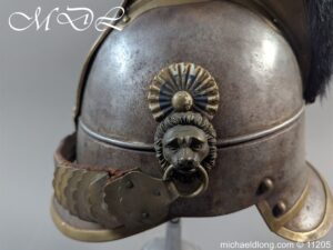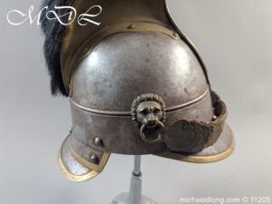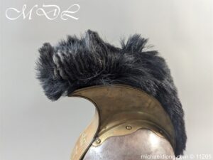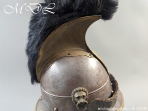 Good original helmet steel skull with brass raised comb with black horse hair crest, central brass plate with crown and M and decoration to base. Lion head ear bosses with original chin scales however leather tap missing from on side. Blue and white cockade above left side ear boss internal liner missing.