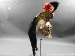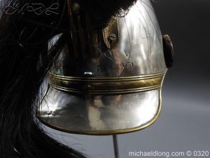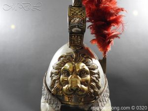 Belgium Cuirassiers 1845 Helmet white metal skull and peaks, brass peak binding, ornamental panelled crest and socket for black “brush” plume, large lion head plate, simulated chin