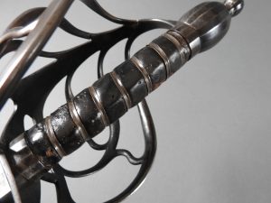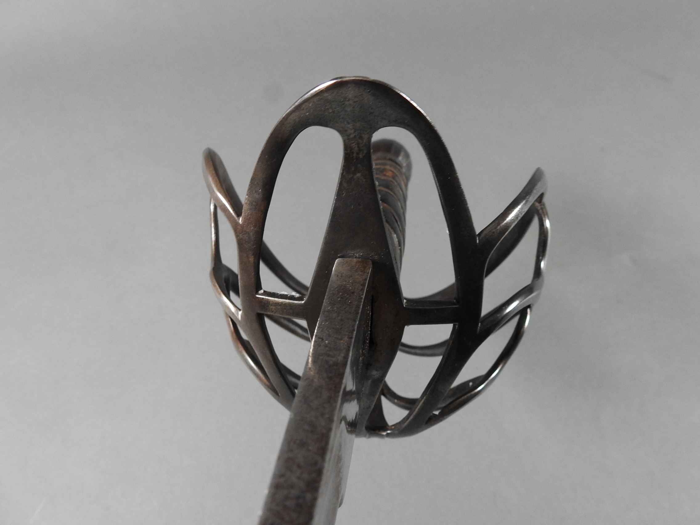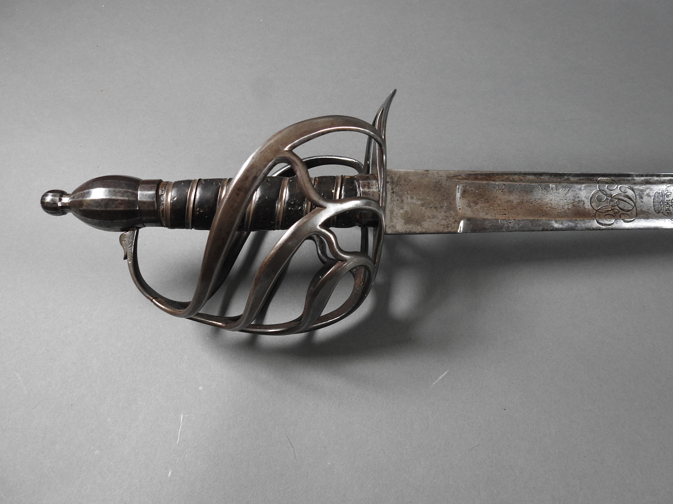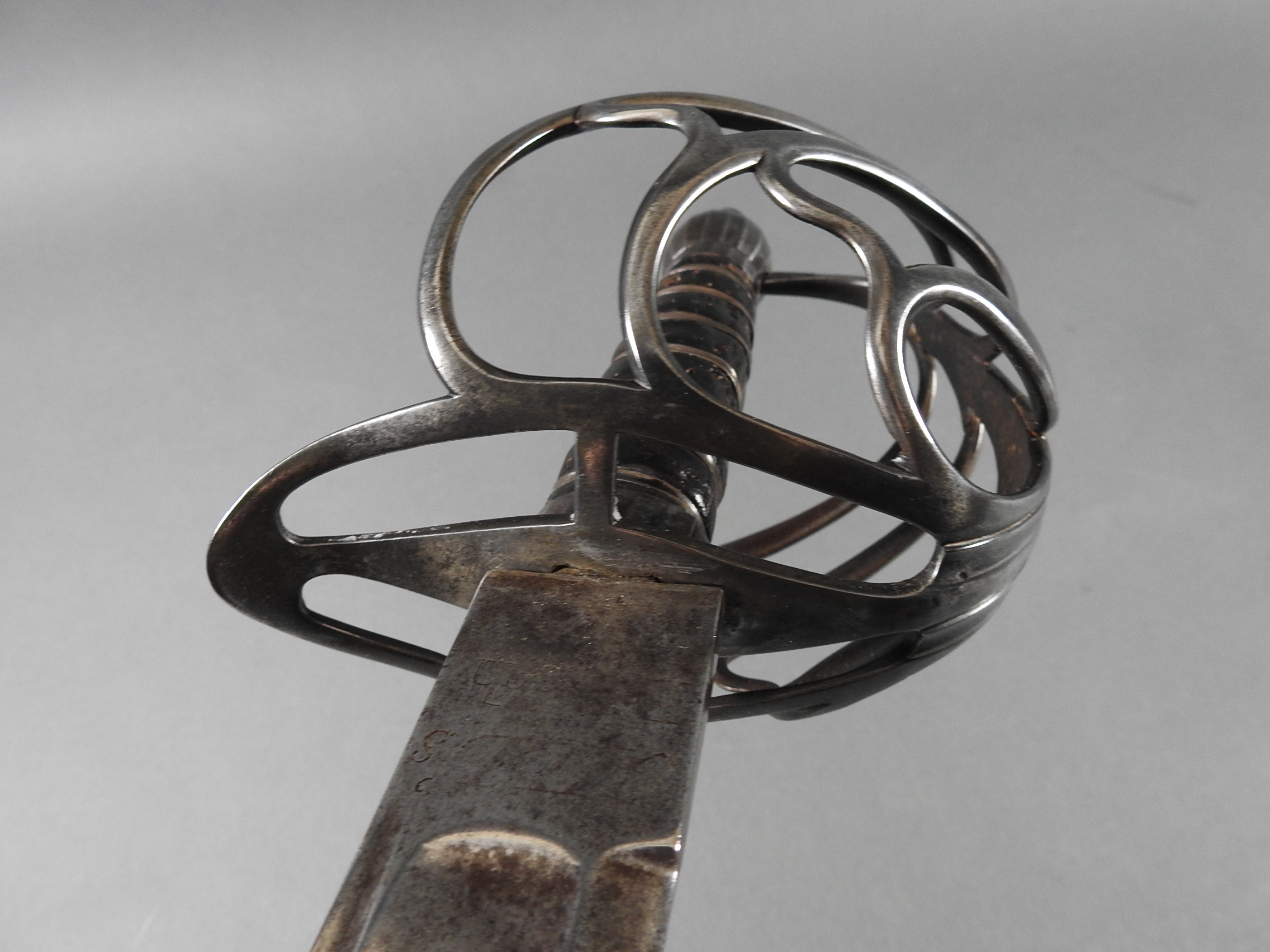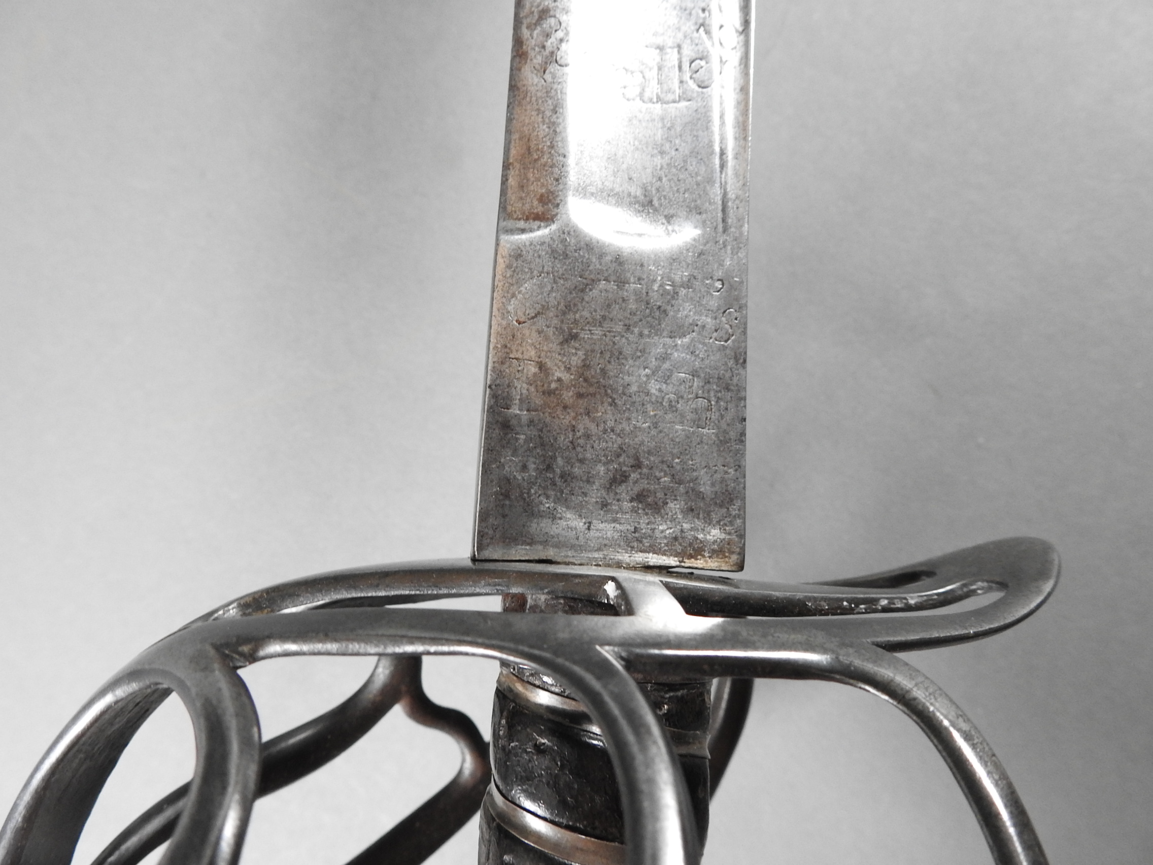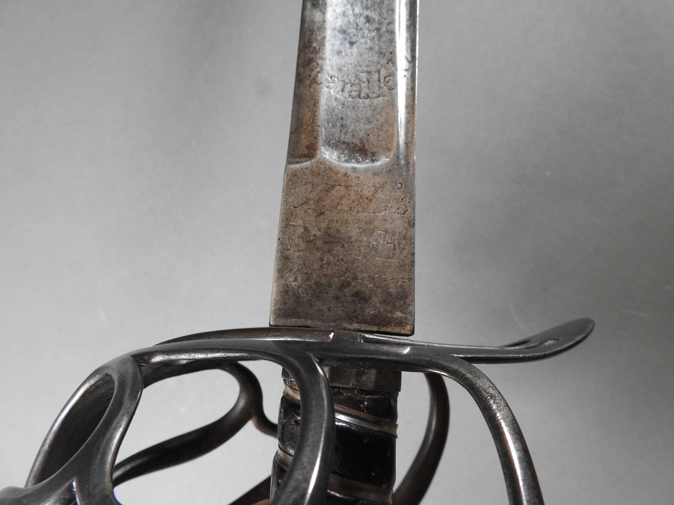 British 1788 Heavy Cavalry Officer’s Sword by Gill Dated 1792 full basket hilt of regulation pattern with ovoid faceted pommel and leather grip secured by . The blade with long broad fullered blade double-edged towards the point and with a narrow fuller bordering the back over most of its length on each side, the ricasso etched with GILL’s English Manufacture and the blade on each side etched with crowned GR monogram, a sprig of laurel above a Garter star above Unparelled, The spine with WARRANTED NEVER TO FAIL 1792 note slight movement between bade and hilt overall length 120cm the blade 100cm