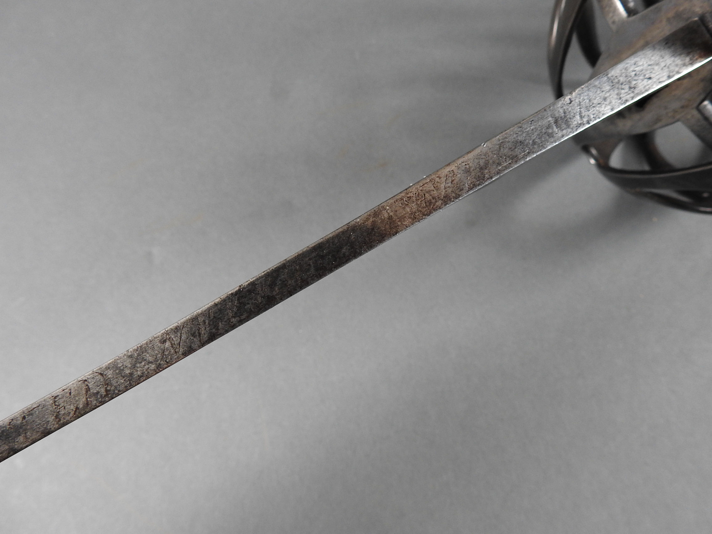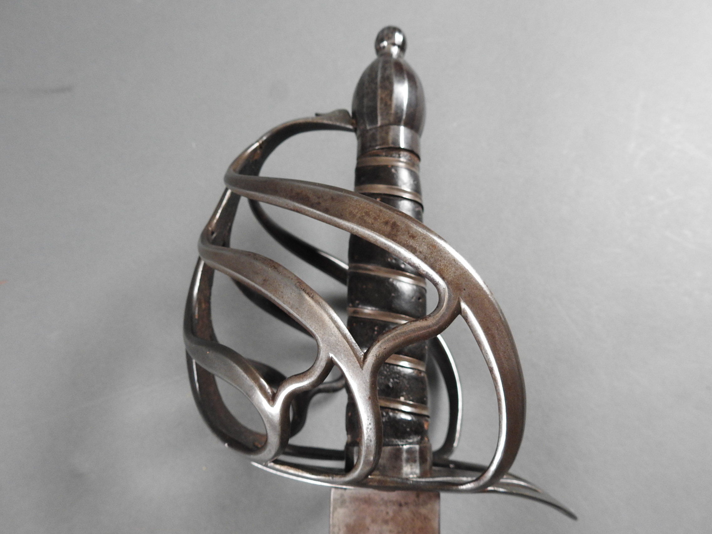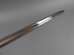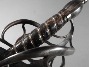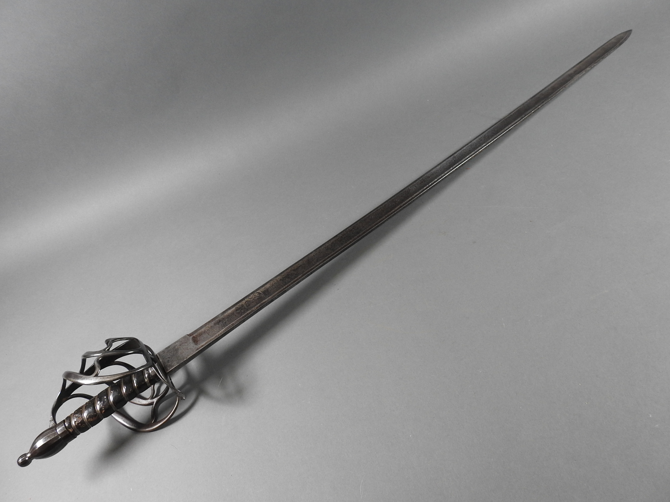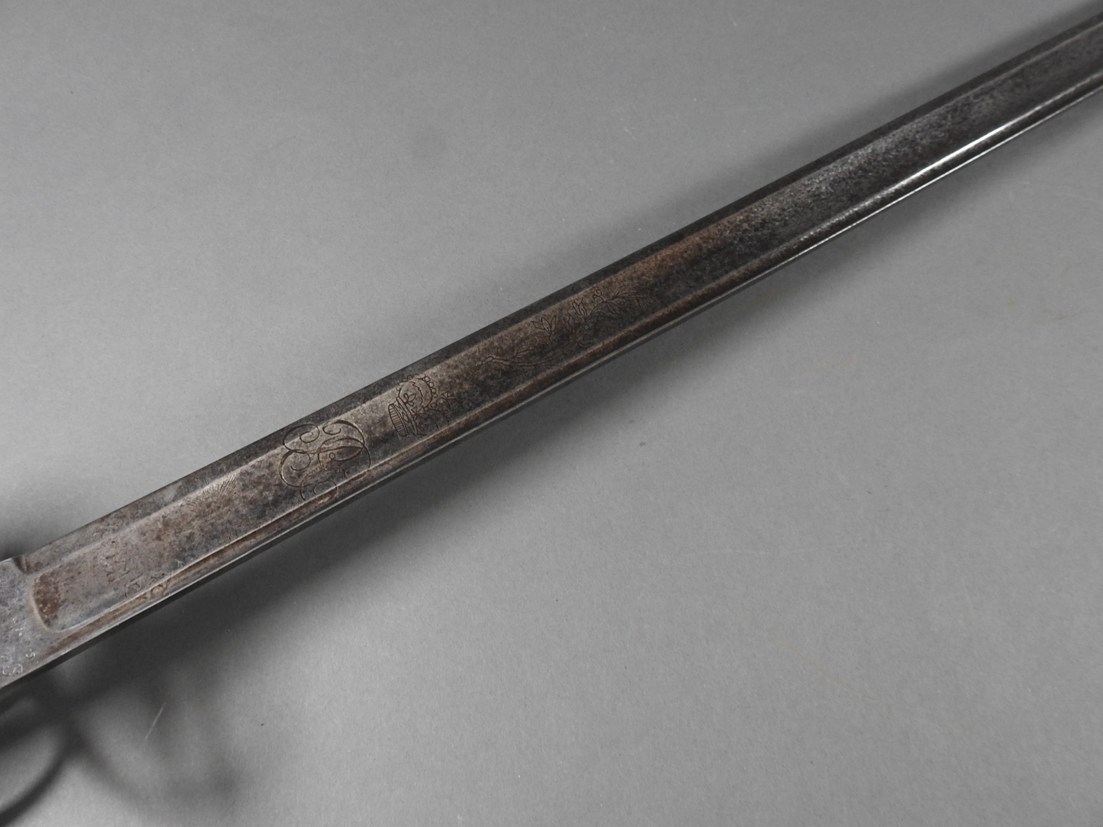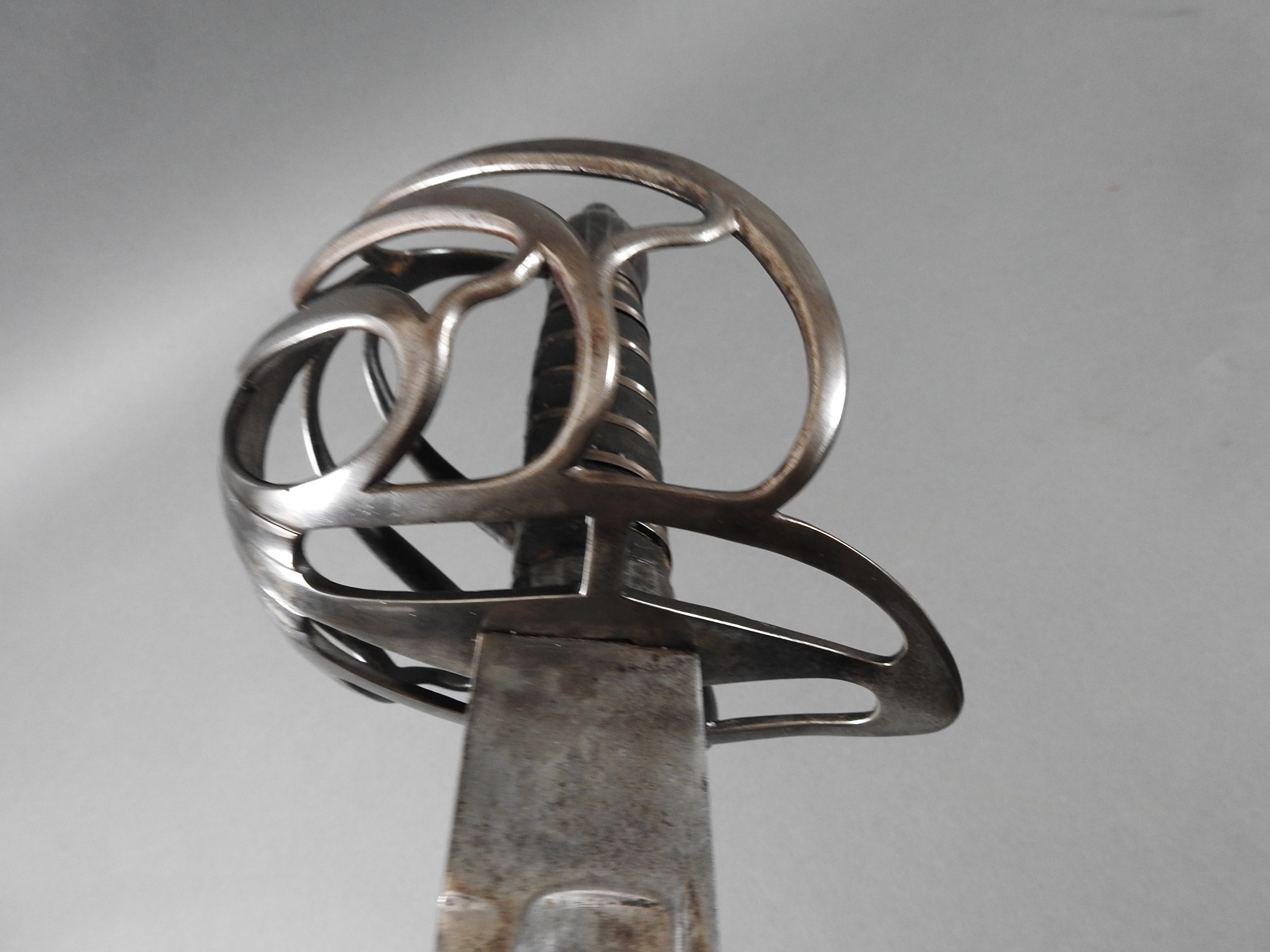 British 1788 Heavy Cavalry Officer’s Sword by Gill Dated 1792 full basket hilt of regulation pattern with ovoid faceted pommel and leather grip secured by . The blade with long broad fullered blade double-edged towards the point and with a narrow fuller bordering the back over most of its length on each side, the ricasso etched with GILL’s English Manufacture and the blade on each side etched with crowned GR monogram, a sprig of laurel above a Garter star above Unparelled, The spine with WARRANTED NEVER TO FAIL 1792 note slight movement between bade and hilt overall length 120cm the blade 100cm