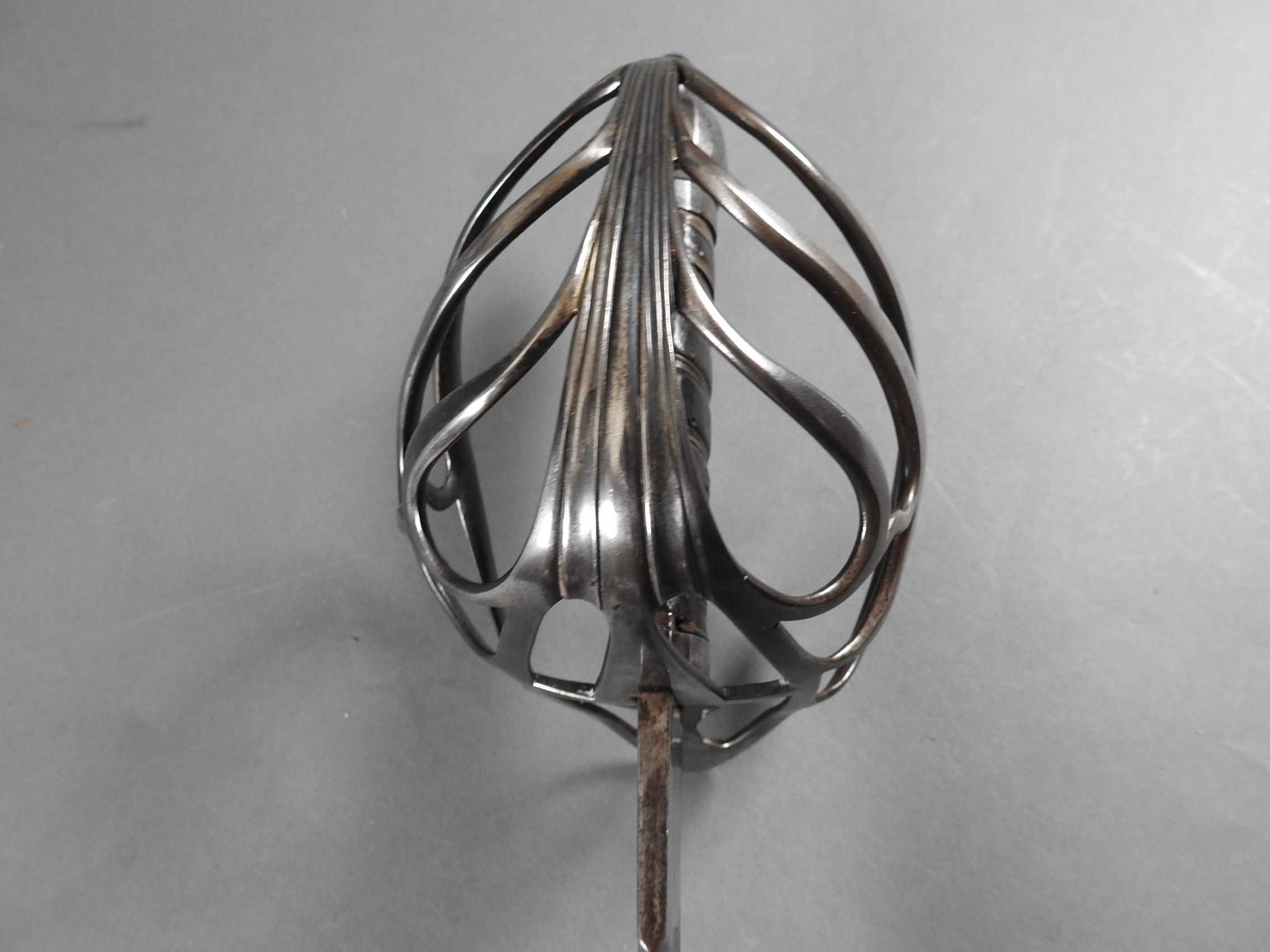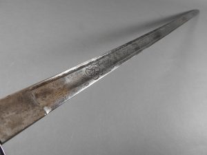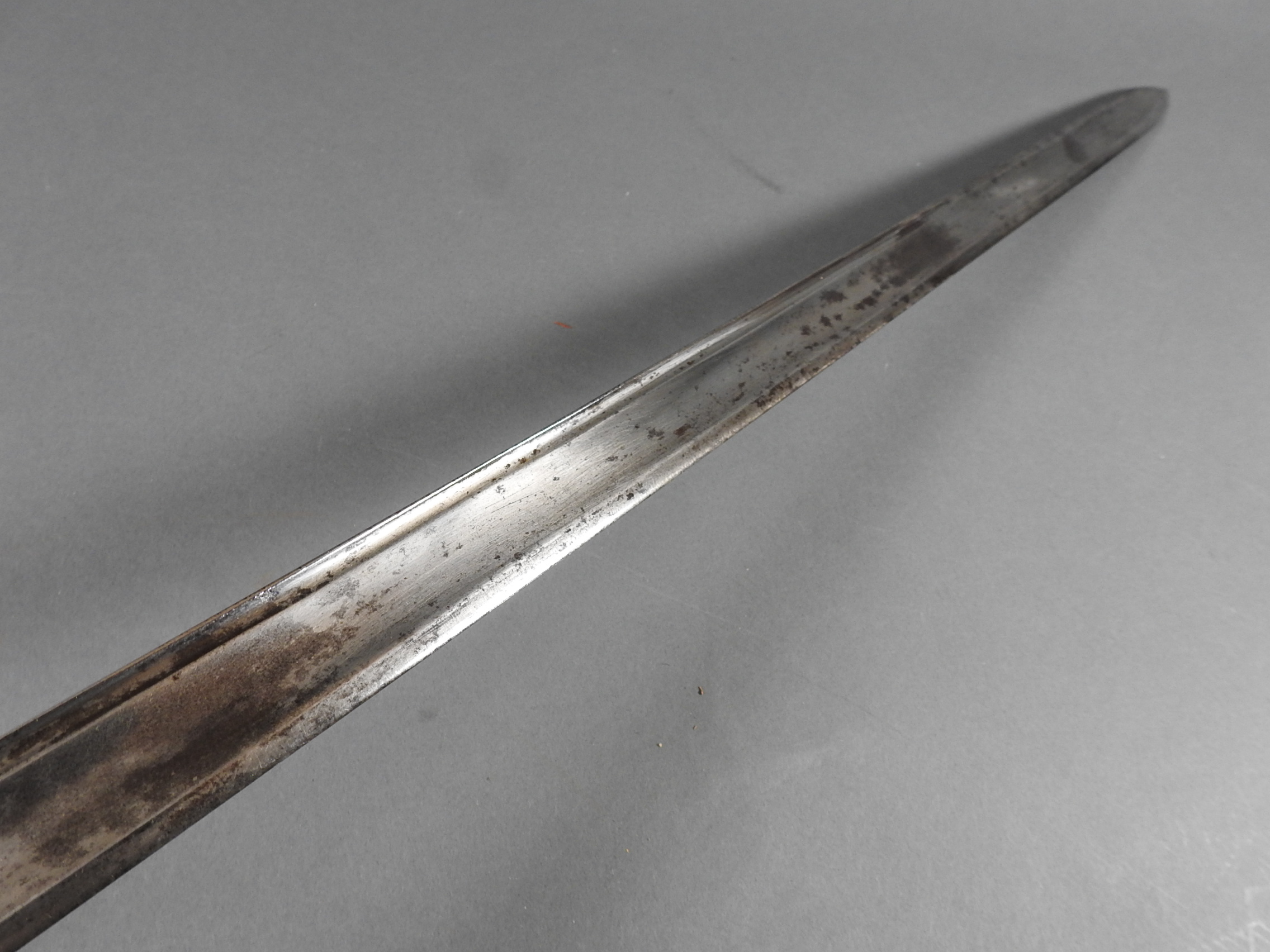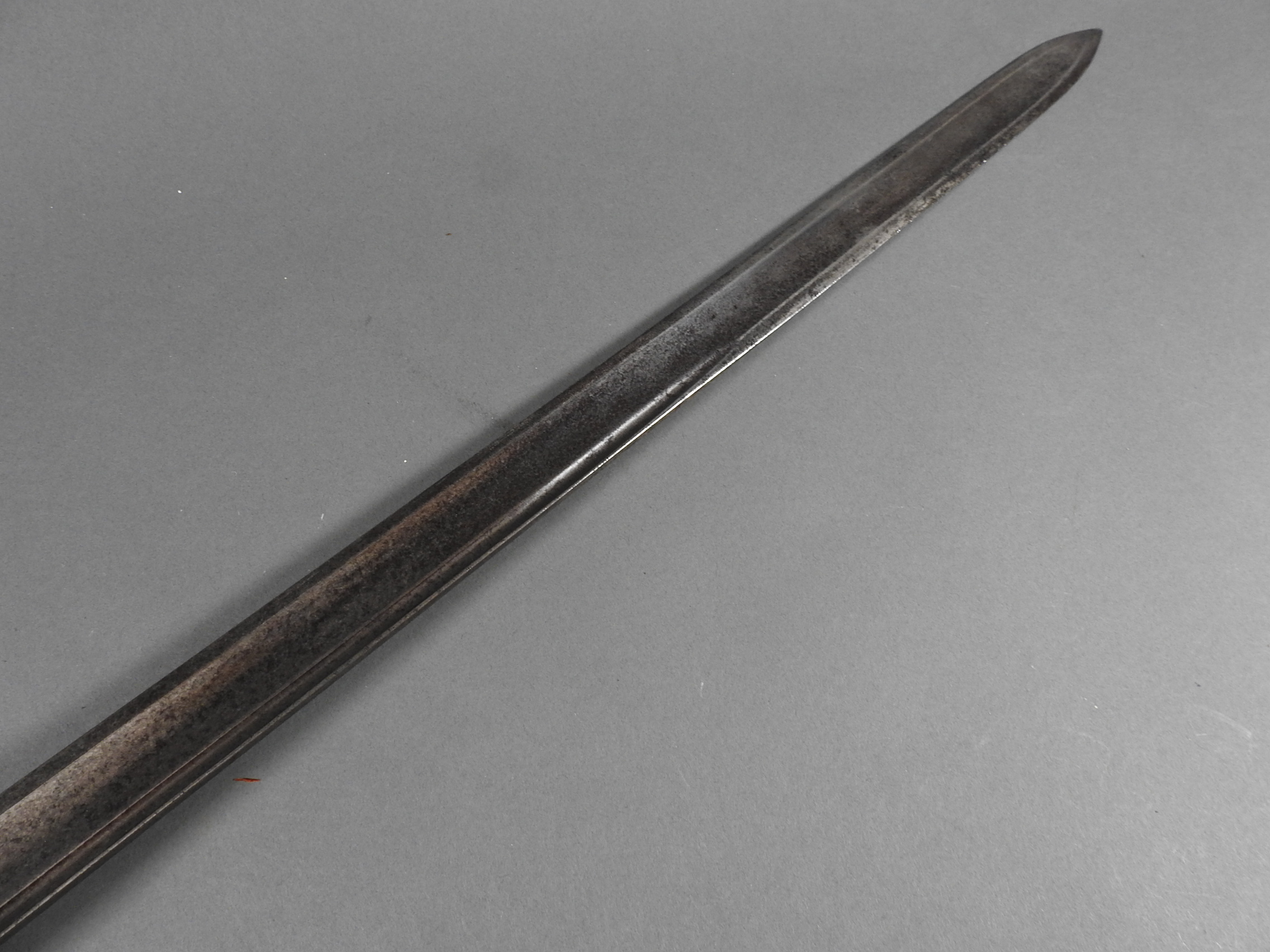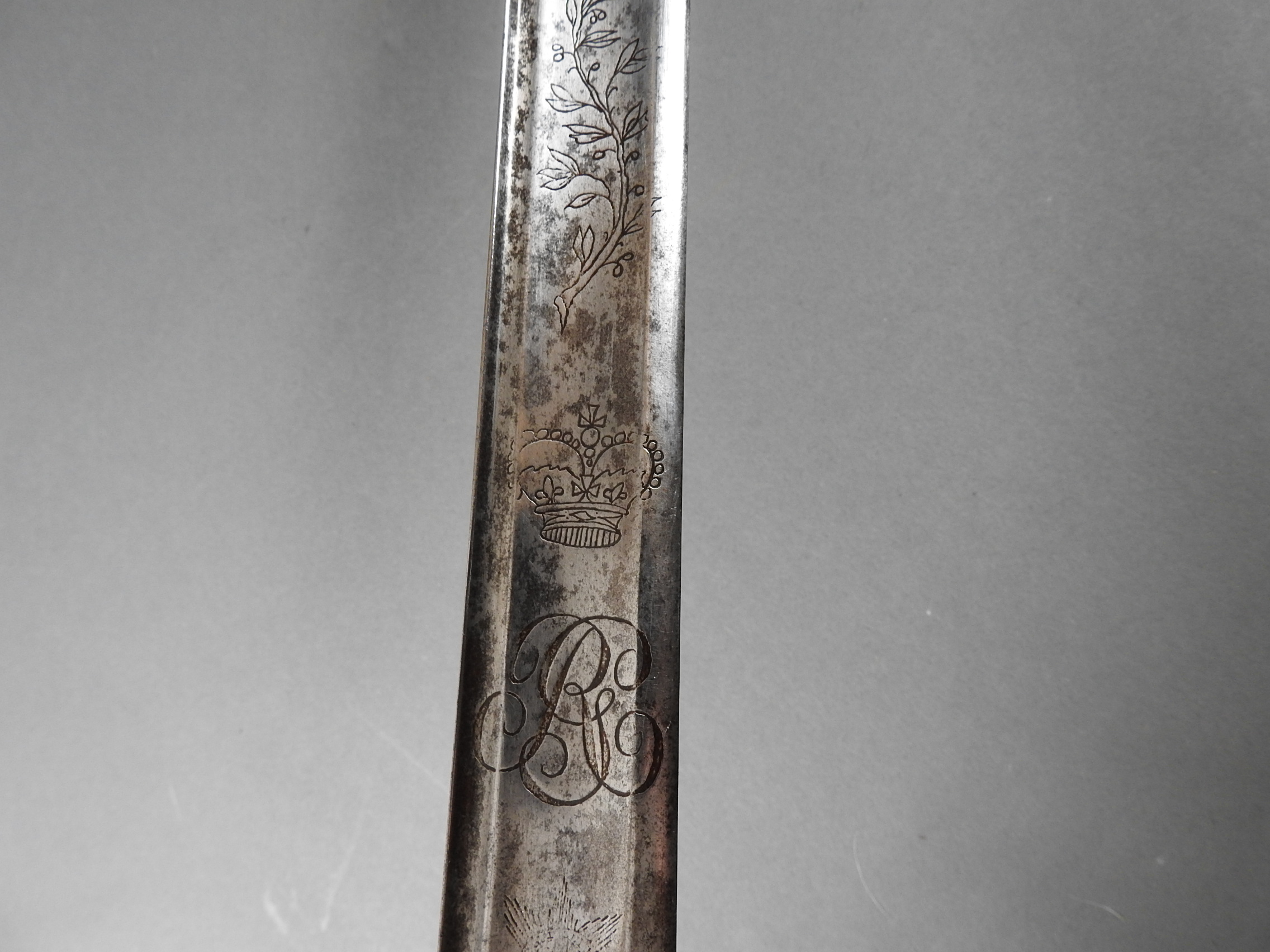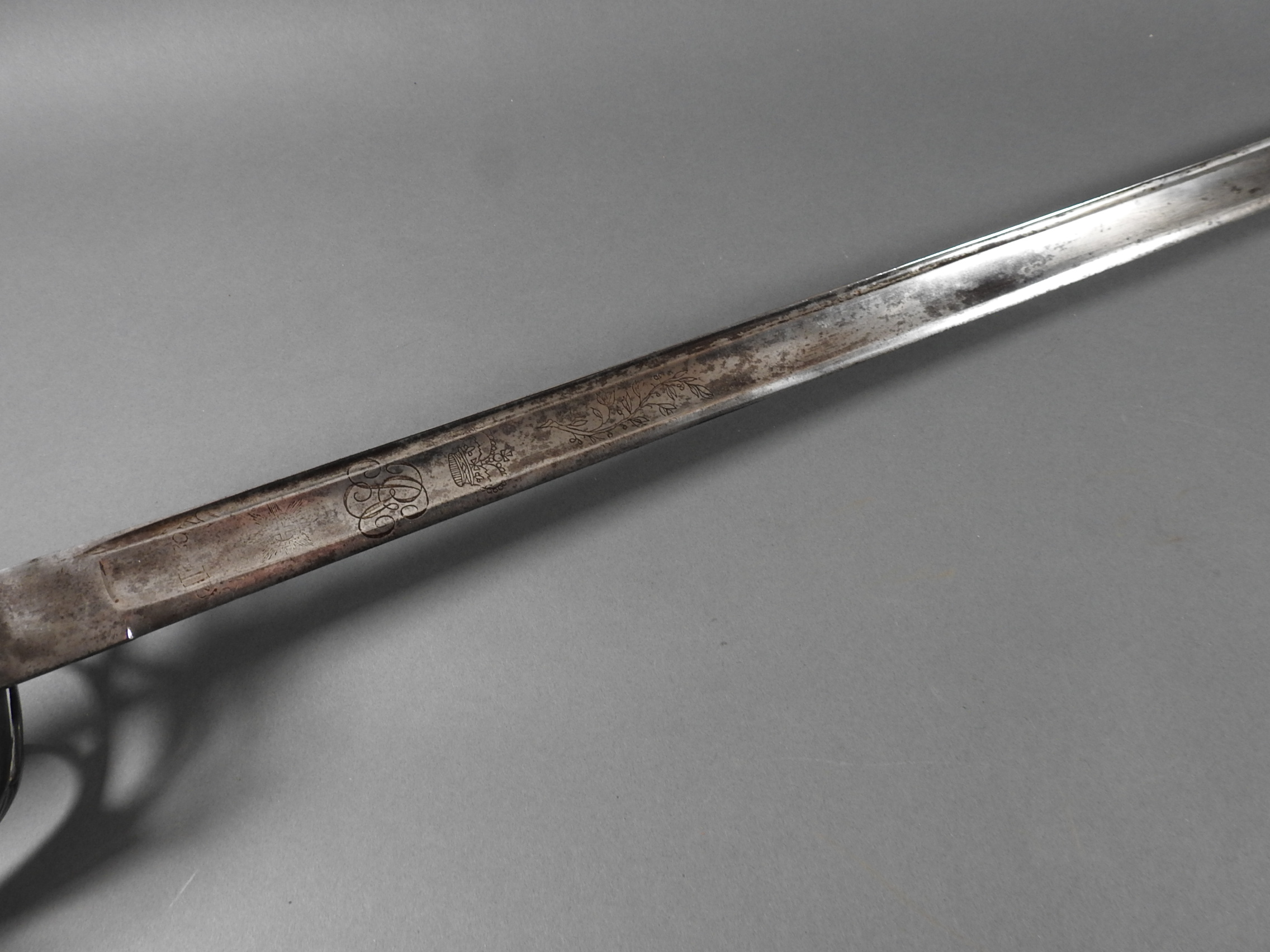 British 1788 Heavy Cavalry Officer’s Sword by Gill Dated 1792 full basket hilt of regulation pattern with ovoid faceted pommel and leather grip secured by . The blade with long broad fullered blade double-edged towards the point and with a narrow fuller bordering the back over most of its length on each side, the ricasso etched with GILL’s English Manufacture and the blade on each side etched with crowned GR monogram, a sprig of laurel above a Garter star above Unparelled, The spine with WARRANTED NEVER TO FAIL 1792 note slight movement between bade and hilt overall length 120cm the blade 100cm