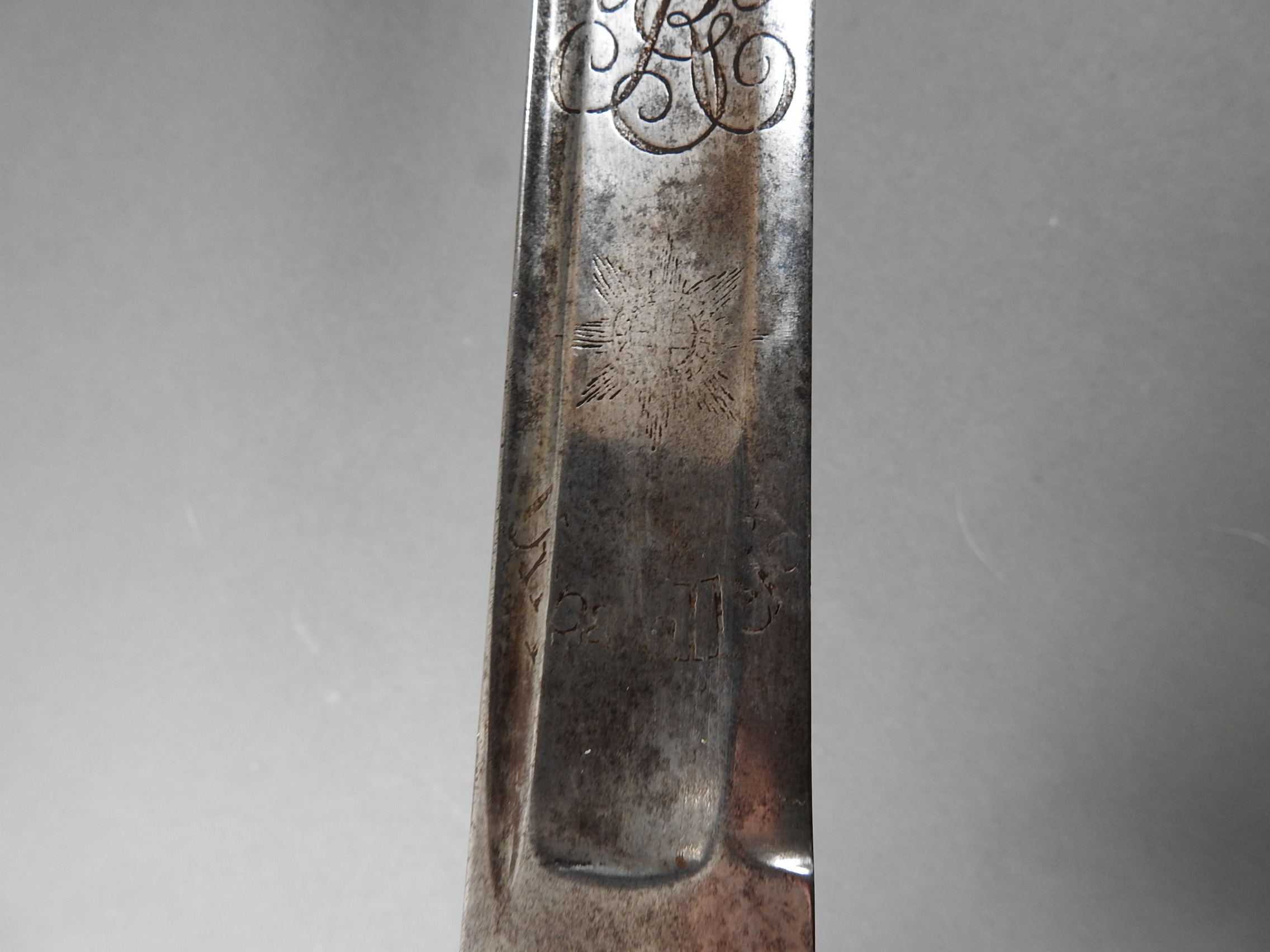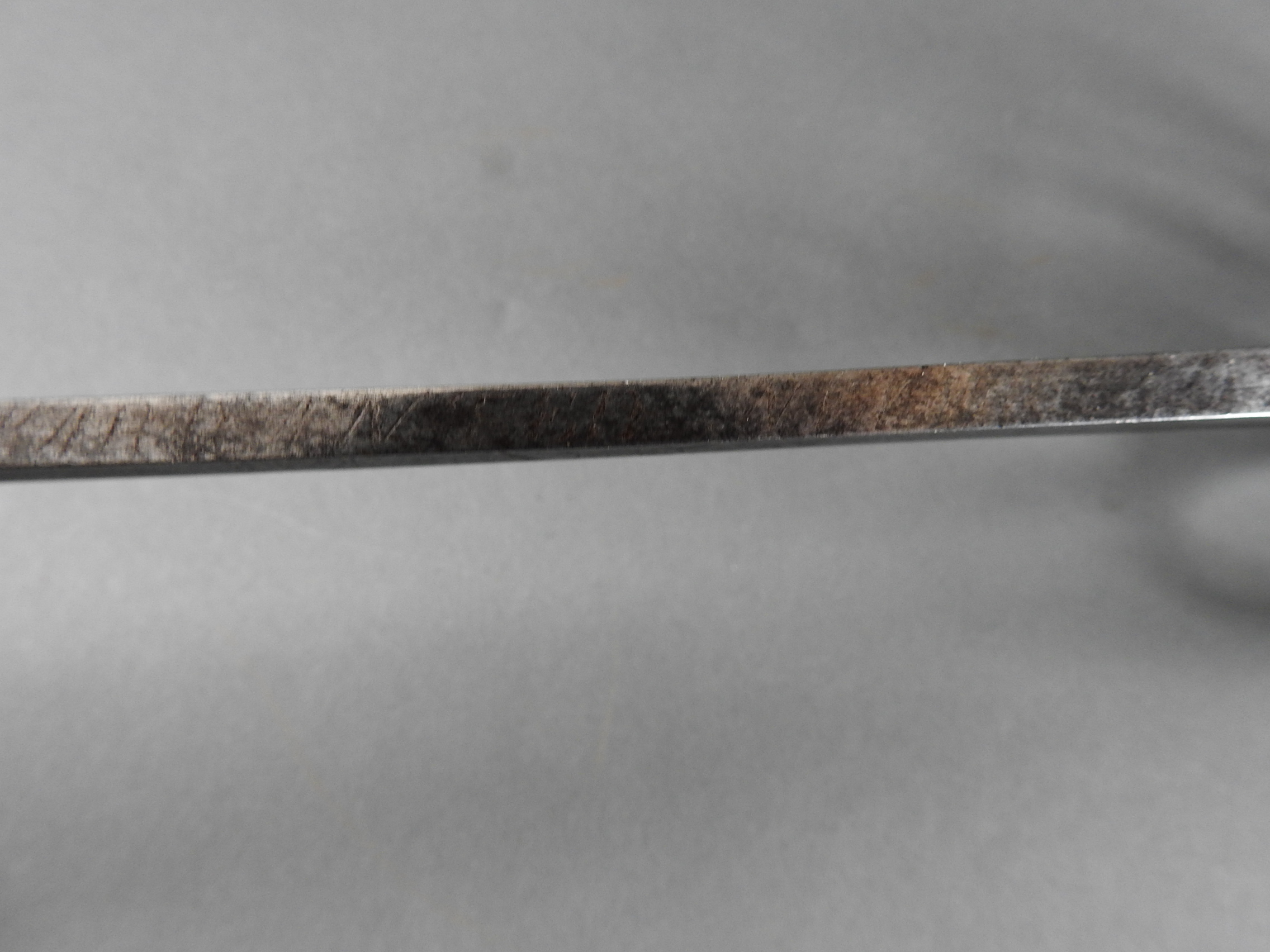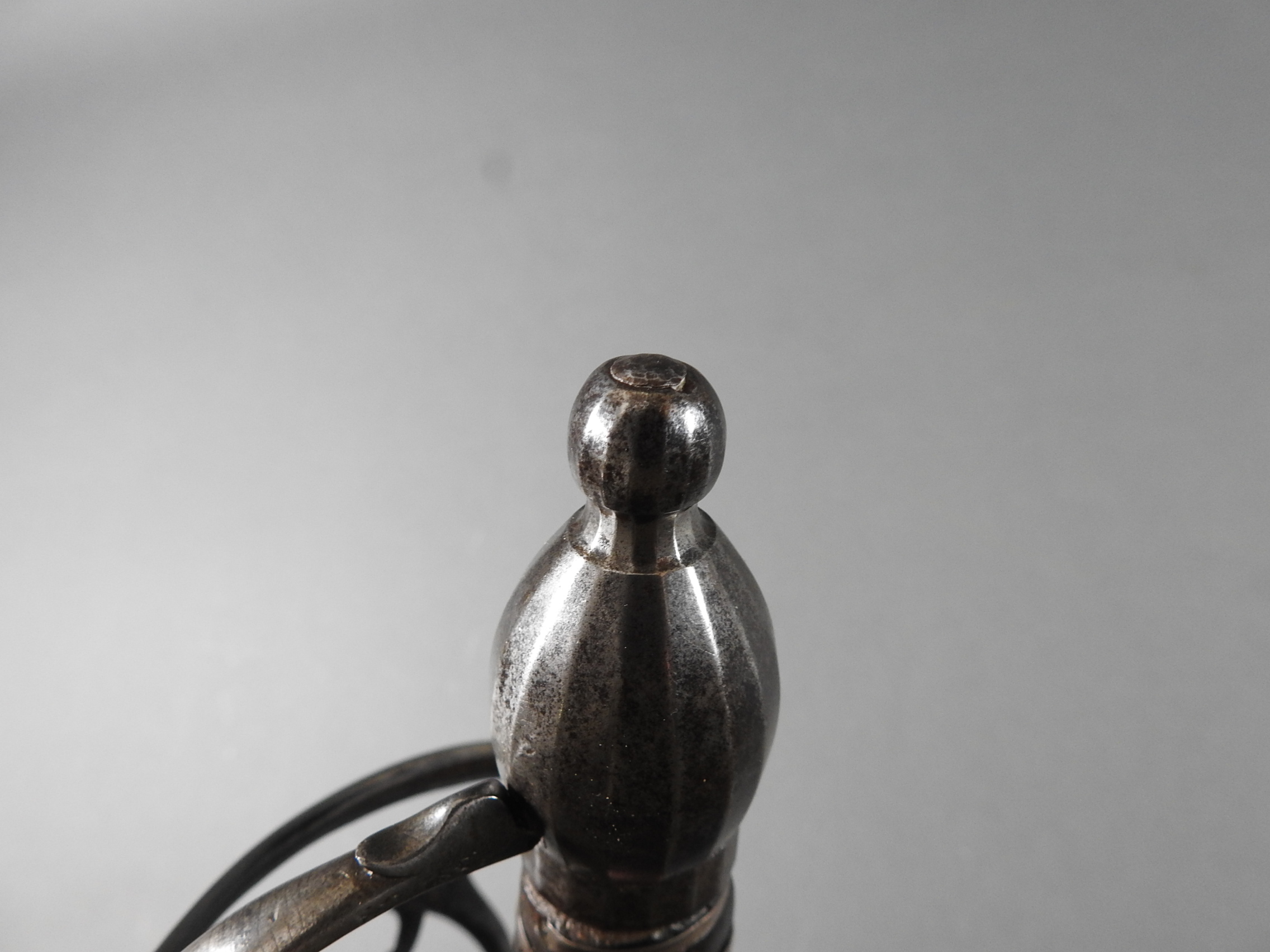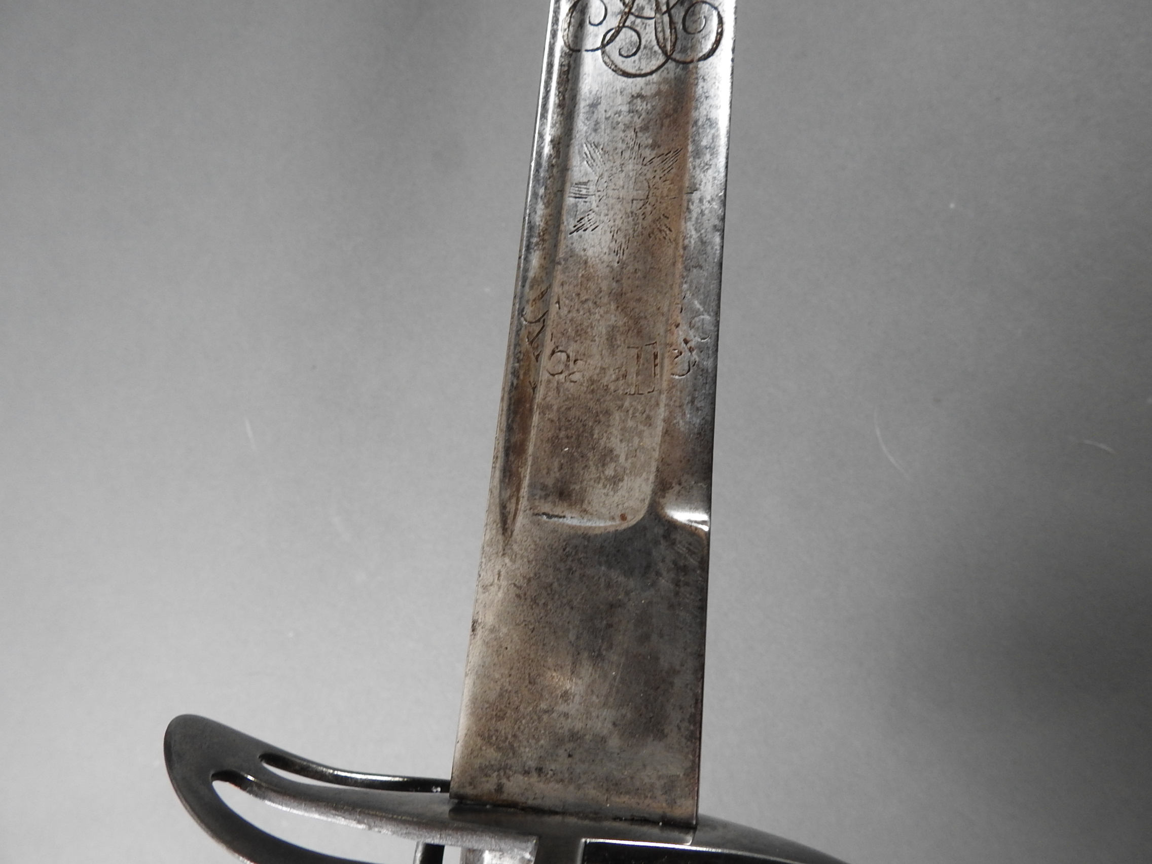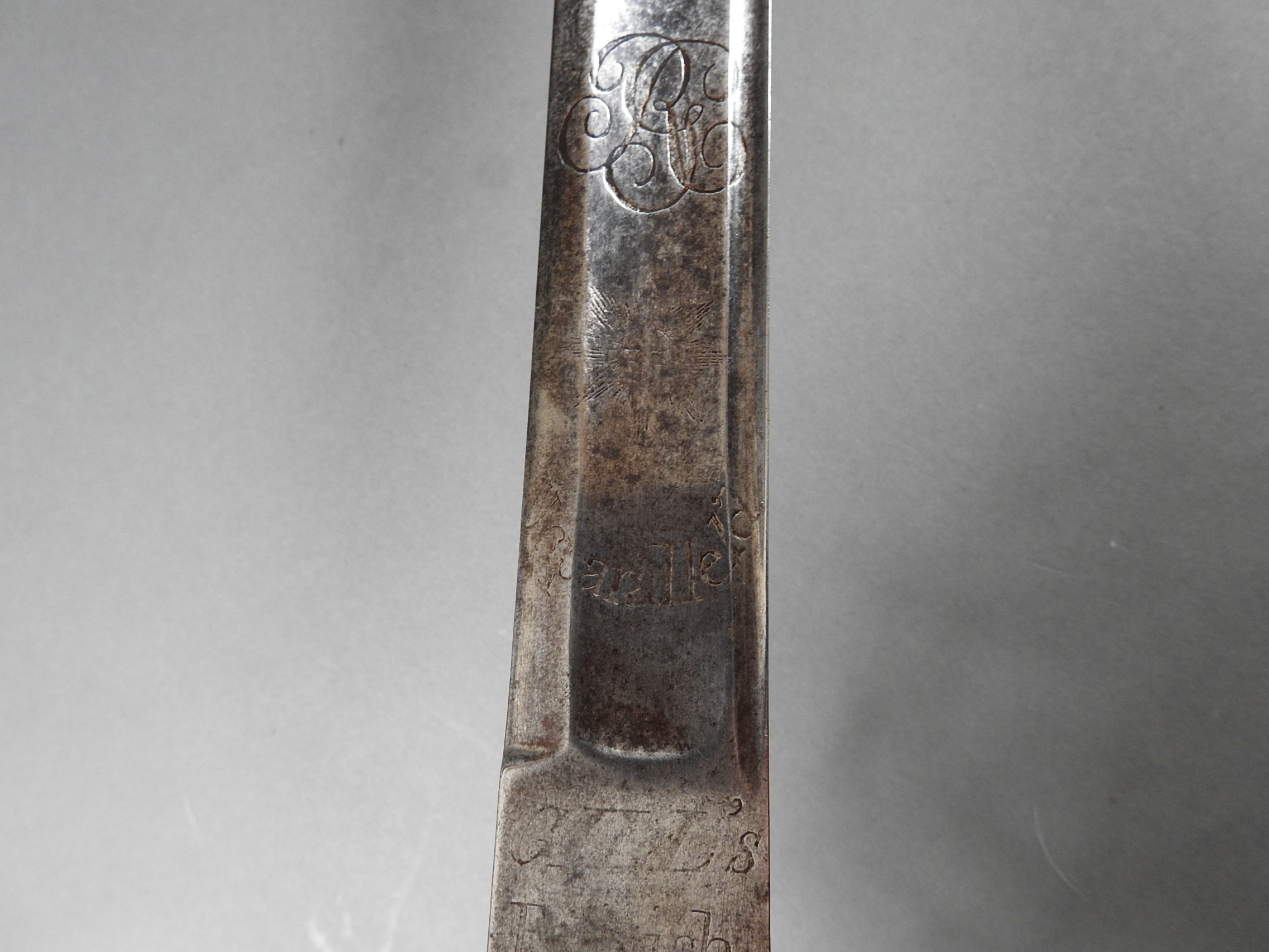 British 1788 Heavy Cavalry Officer’s Sword by Gill Dated 1792 full basket hilt of regulation pattern with ovoid faceted pommel and leather grip secured by . The blade with long broad fullered blade double-edged towards the point and with a narrow fuller bordering the back over most of its length on each side, the ricasso etched with GILL’s English Manufacture and the blade on each side etched with crowned GR monogram, a sprig of laurel above a Garter star above Unparelled, The spine with WARRANTED NEVER TO FAIL 1792 note slight movement between bade and hilt overall length 120cm the blade 100cm