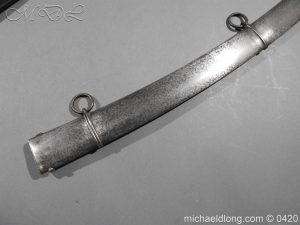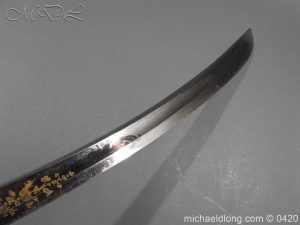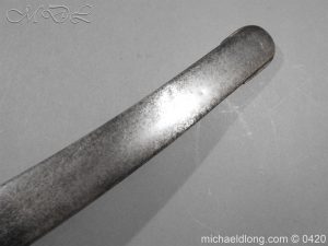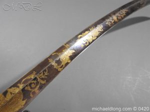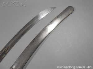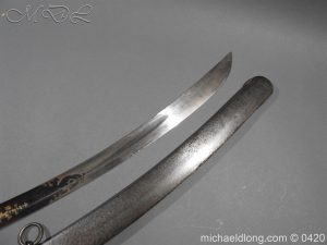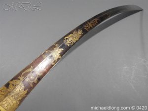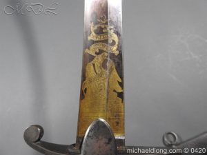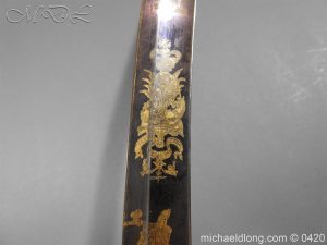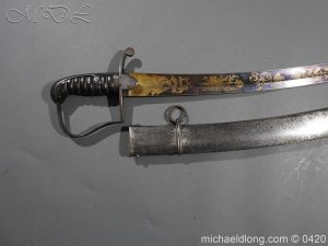 British 1796 Blue and Gilt Officer’s Sword by Gibson Thomson and Craig’s Regulation officer’s hilt with leather grip bound by silver wire, the blade with blue and gilt decoration Gr and crown, Royal Coat of arms, mounted cavalry officer and trophies of arms. Also floral decoration including thistles which may point to a Scottish heritage and the fact it came from a good house in Scotland plus makers details and Warranted. It is complete with steel scabbard with two loose rings.