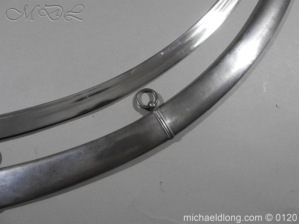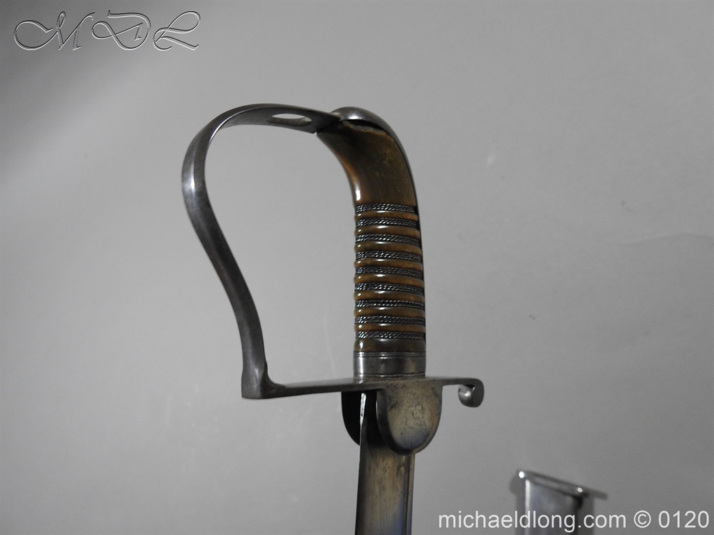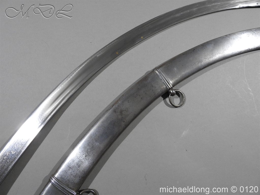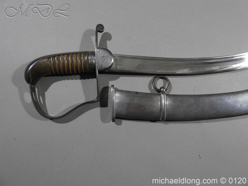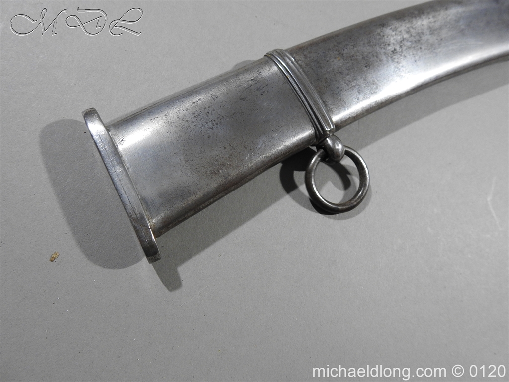 British 1796 Flank Officer’s Sword, steel polish hilt with horn grip which is bound with silver wire. The blade single edged with extreme curve has two inserted brass dots in the small top fuller and is complete with matching steel scabbard with two loose rings. Overall length 71cm blade 60cm