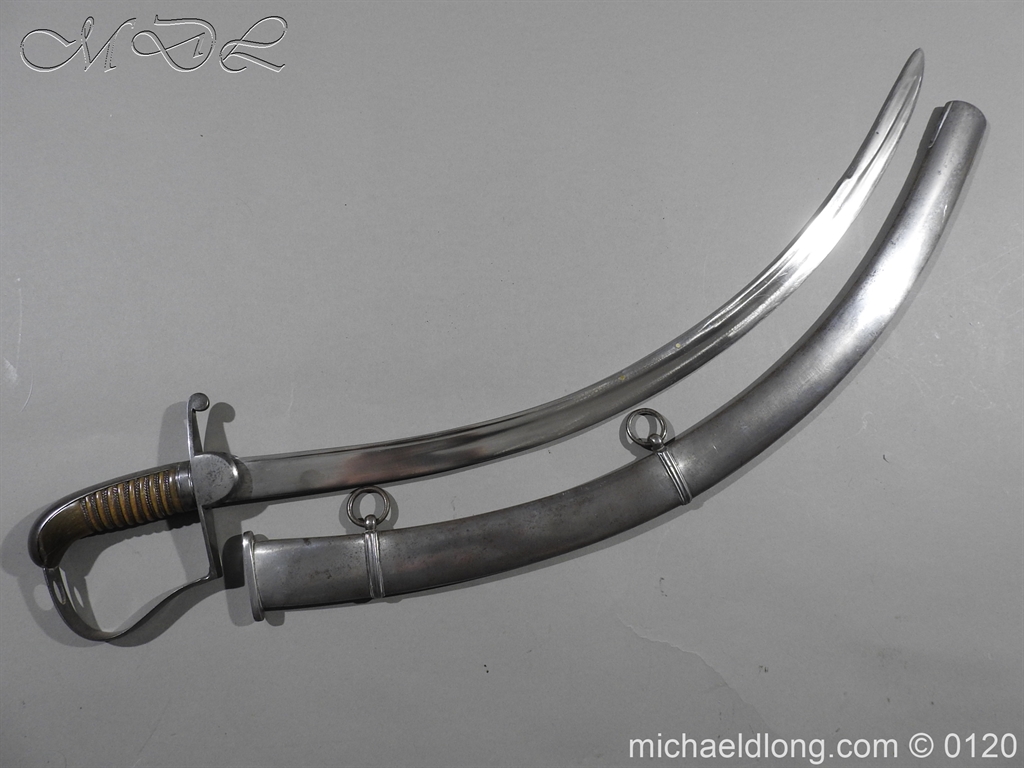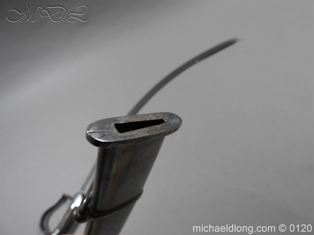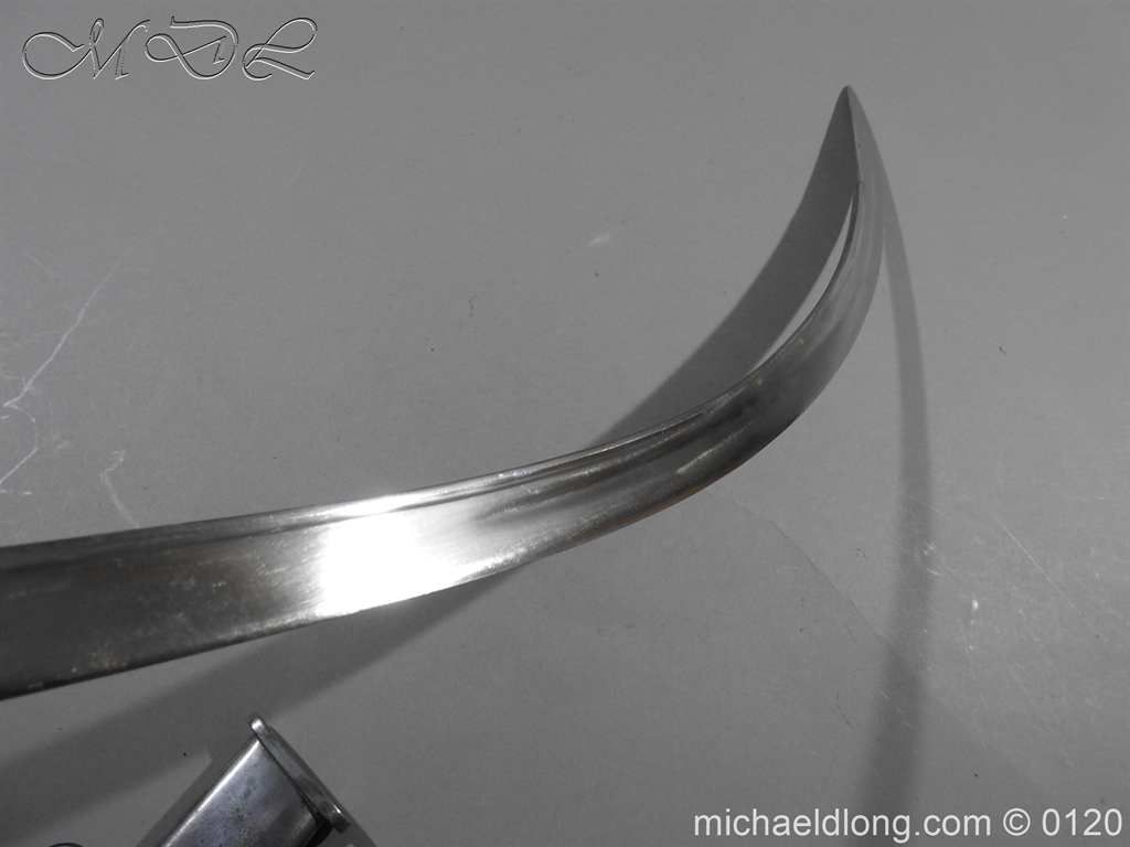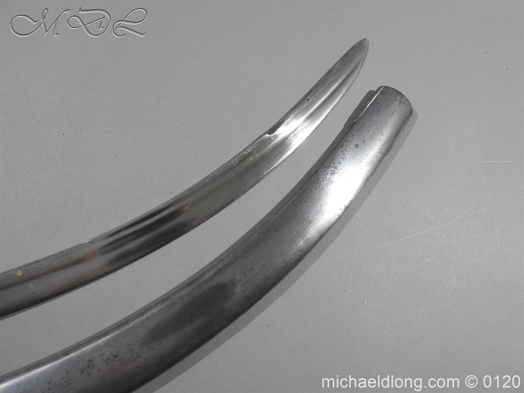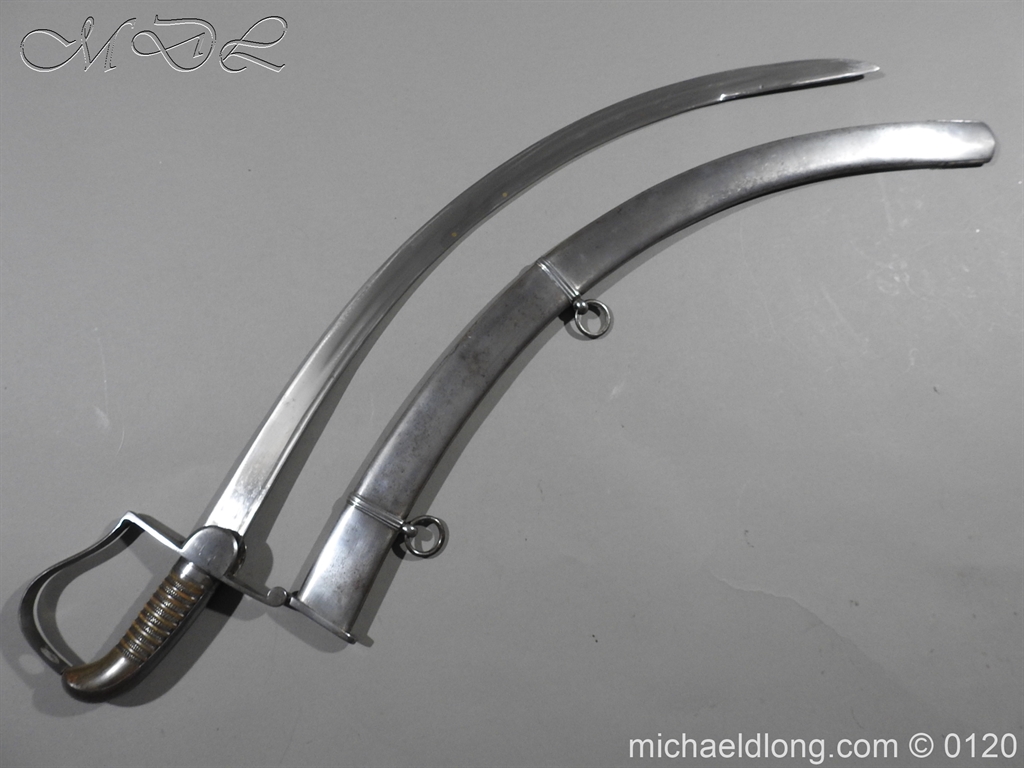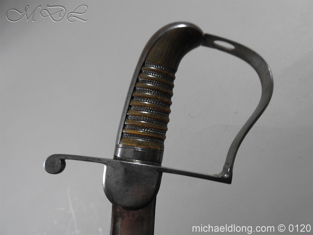British 1796 Flank Officer’s Sword, steel polish hilt with horn grip which is bound with silver wire. The blade single edged with extreme curve has two inserted brass dots in the small top fuller and is complete with matching steel scabbard with two loose rings. Overall length 71cm blade 60cm