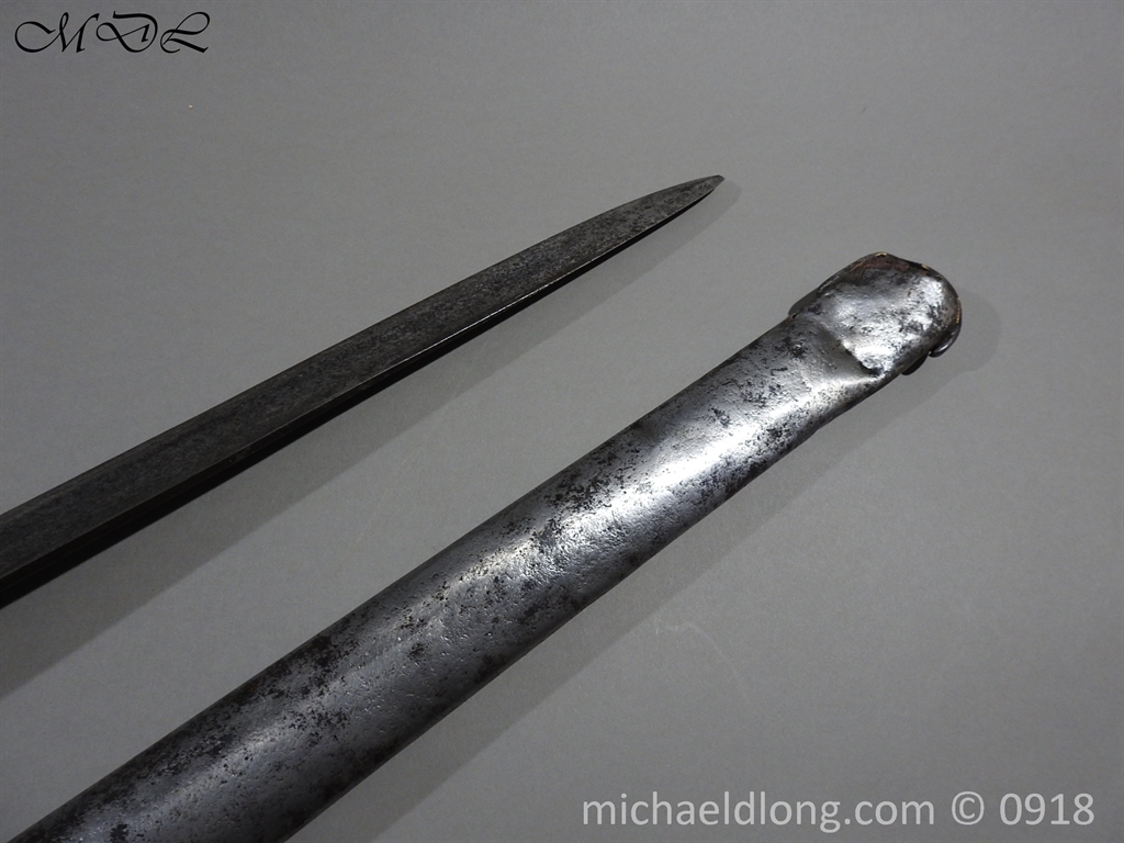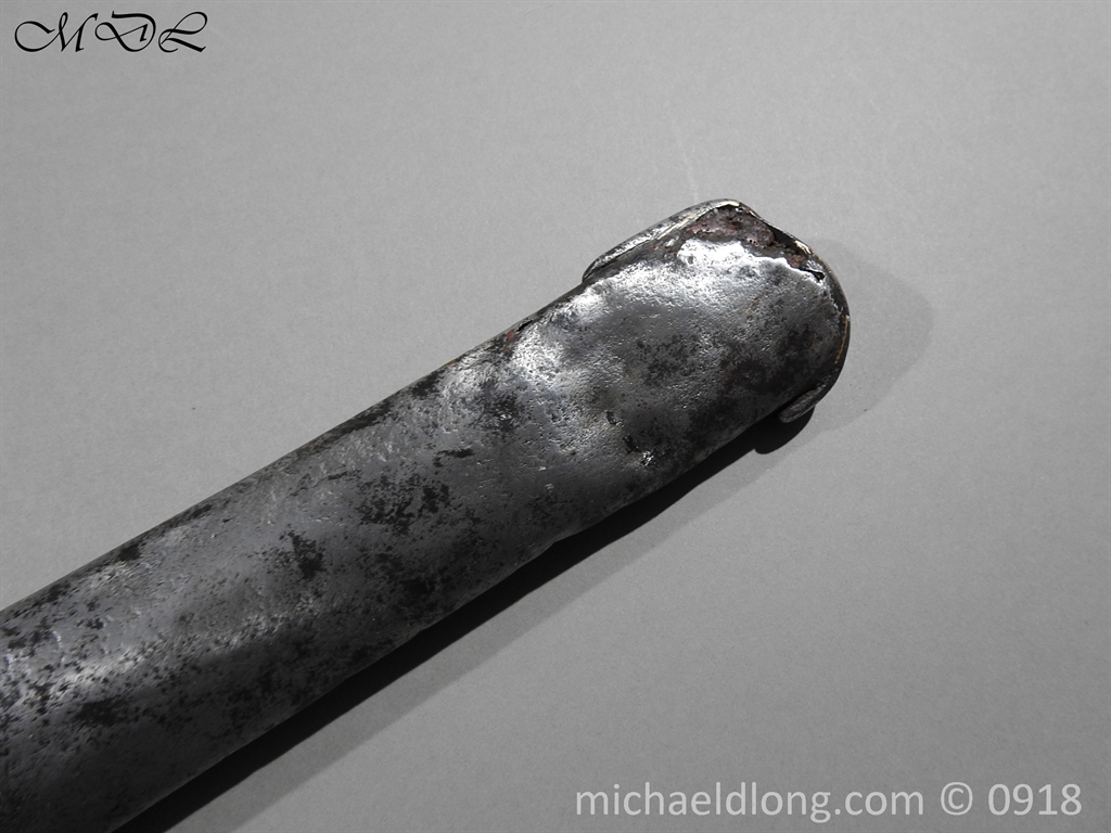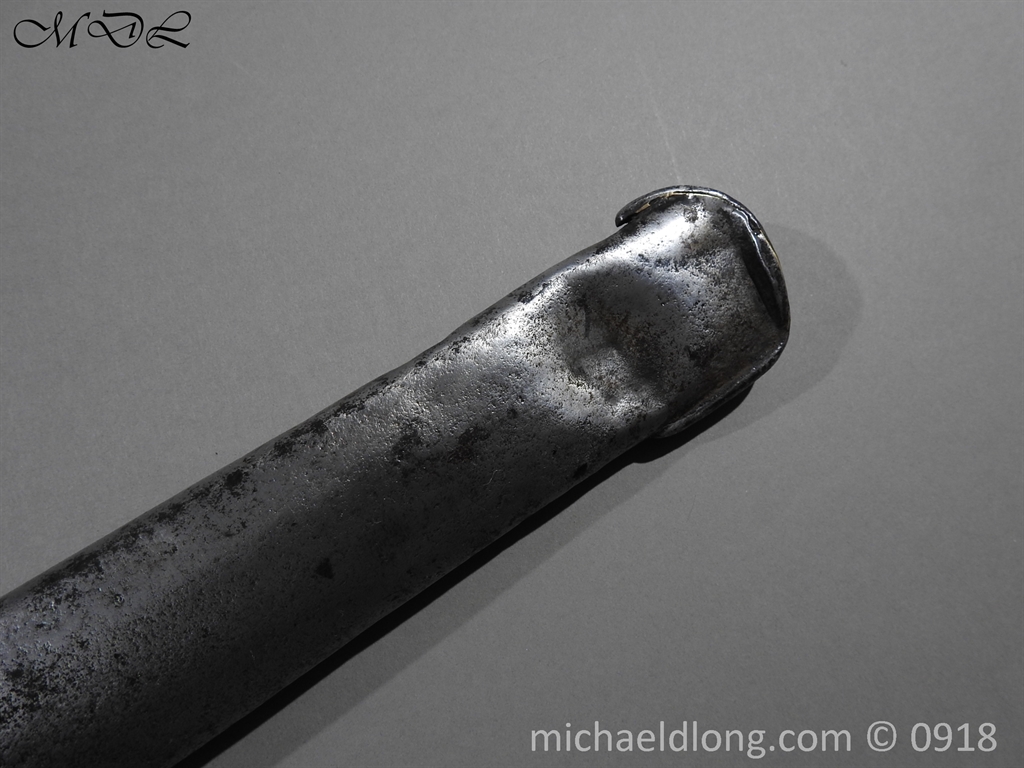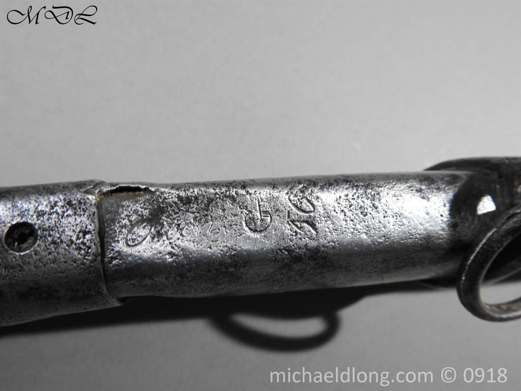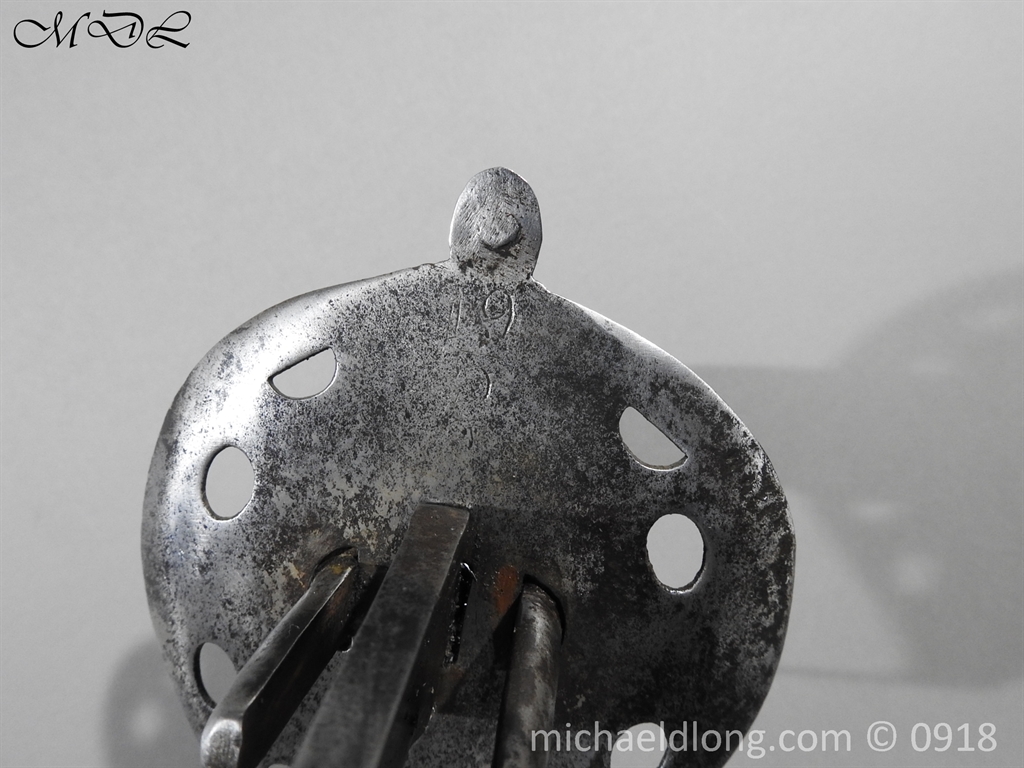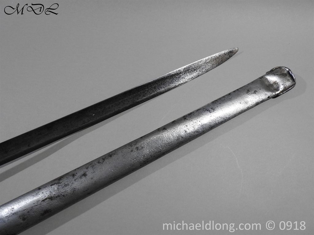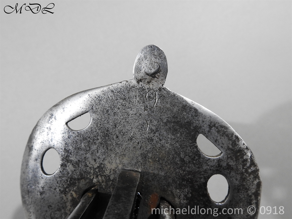 Regulation pattern 1796 heavy cavalry trooper disc hilt sword with langets and full guard. The leather bound grip show signs of age wear however solid with a small mount of leather missing near the hilt. Straight single edge blade with spear point, the guard is engraved with G56 which is matching to the scabbard but very faded, Osbourn also marked on the scabbard. Please note the sword has been clean but is in solid condition and original. Overall length 100cm the blade 85cm. Please Swords of the British Army by Brian Robson revised edition page 19 for reference.