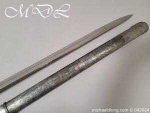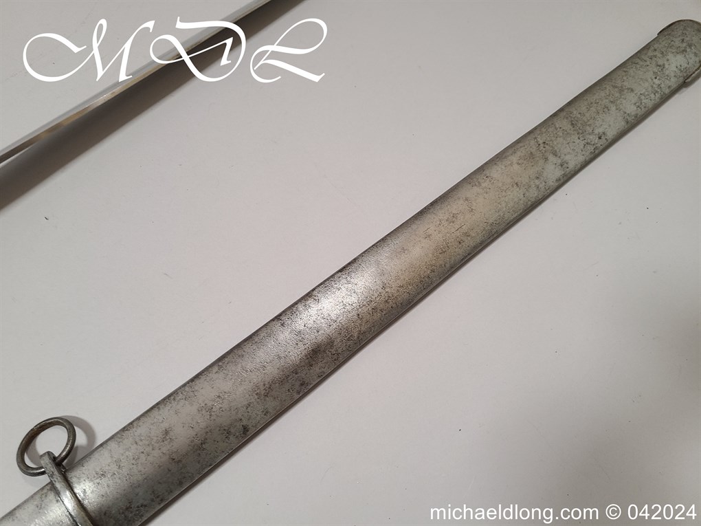 British 1796 Heavy Cavalry Trooper Sword by Woolley, the regulation hilt with the disk inner edge being removed, ribbed wooden grip covered with leather and complete with langets. The blade single edged in excellent condition with spear point and the spine maker marked Woolley, complete with steel matching scabbard with two loose rings. For further information please see Robson Swords of the British Army revised edition plate 16 Overall length 101cm blade 88cm
