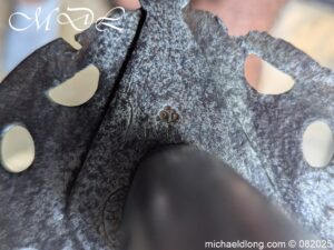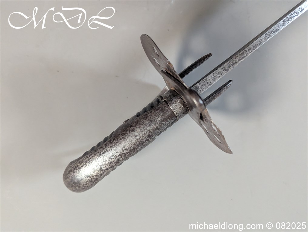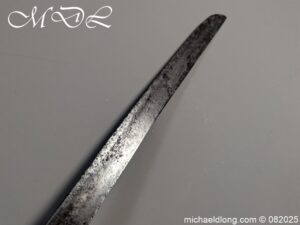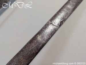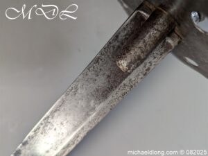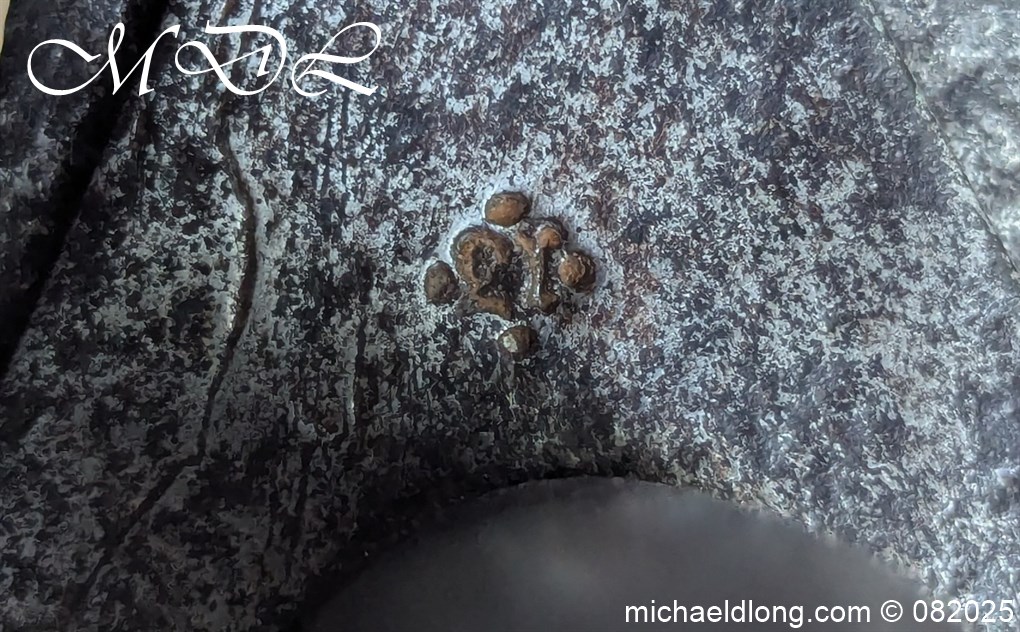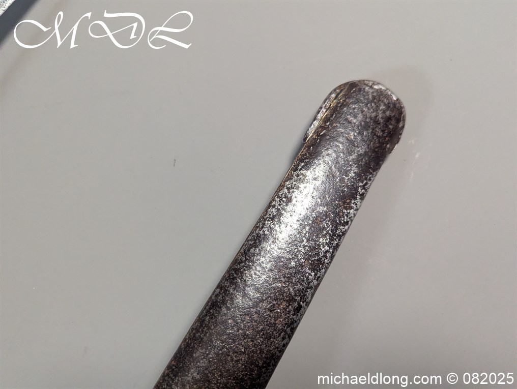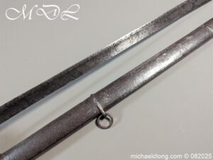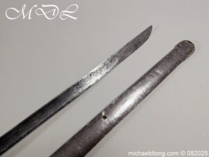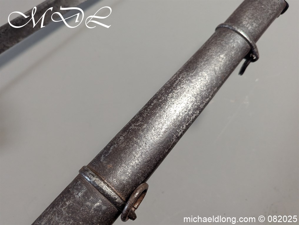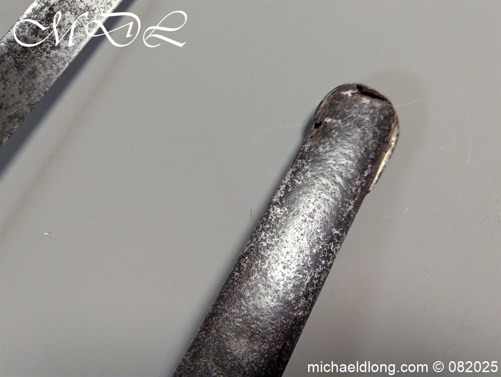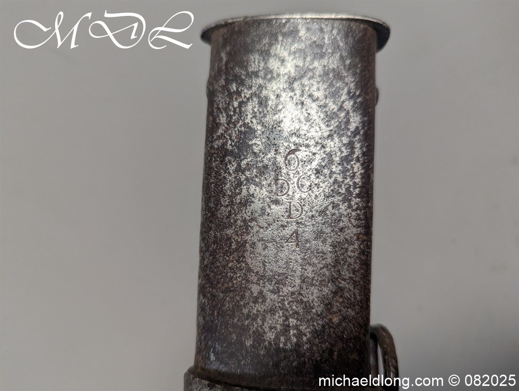 British 1796 Heavy Cavalry Troopers Sword regulation sword with J J Runkel blade and original hatchet point and langets. Leather bound grip and disk guard which is stamped please see image. The scabbard which does show age wear is engraved with 6 over DG – 6th Dragoon Guards the Carabiners and D over 4 possibly meaning D troop and is complete with two loose rings. This a a totally untouched sword with signs of age wear overall length 40.5 inch the blade 35 inch