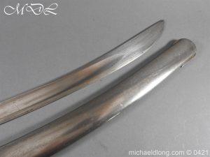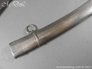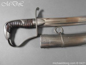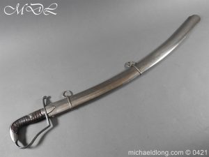British 1796 Light Cavalry Officer’s Sword by Gill steel hilt with unusual faceted elongated pommel. Two ears on back strap with shield shaped langets and leather bound grip bound with wire. Curved flat back single edged blade with hatchet point and engraved with Thomas Gills Warrented Never to Fail. Complete with matching steel scabbard with 2 loose rings