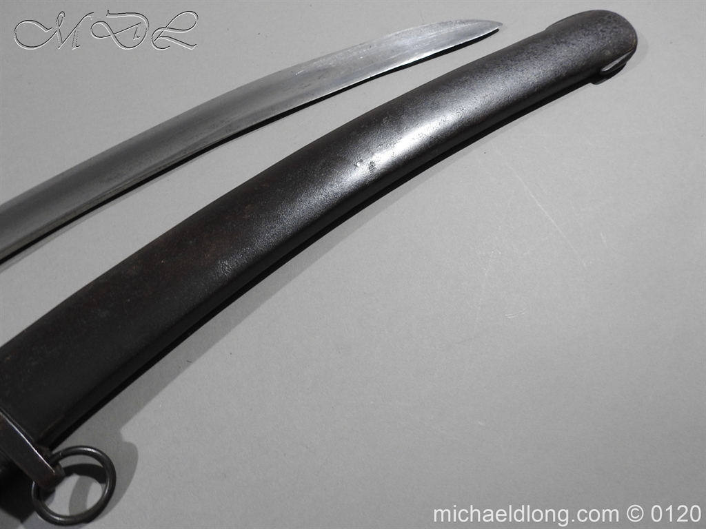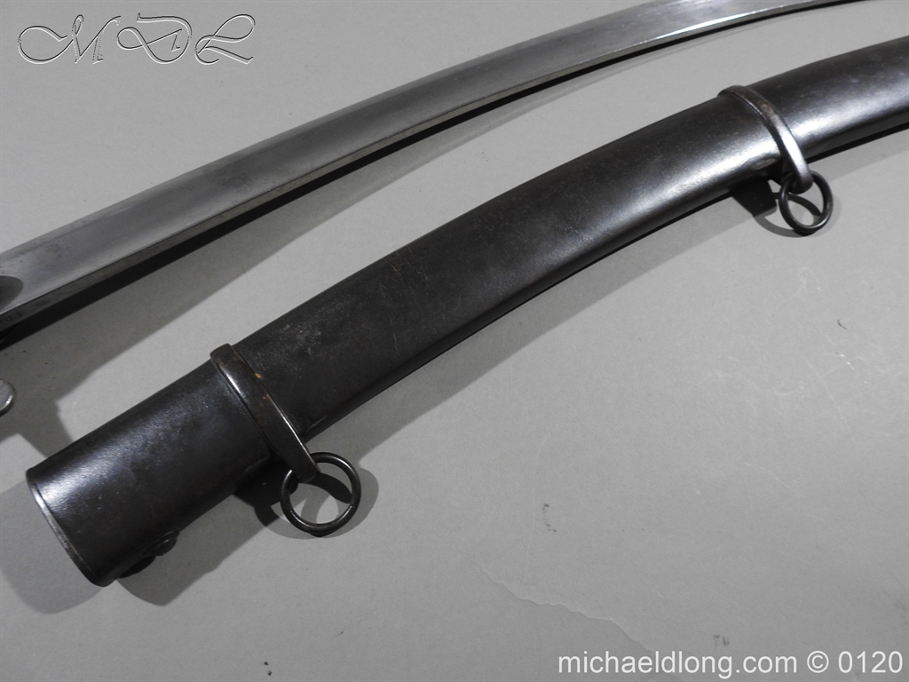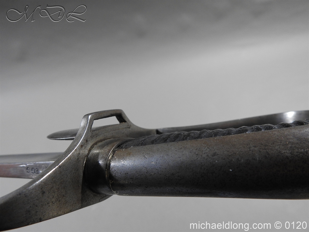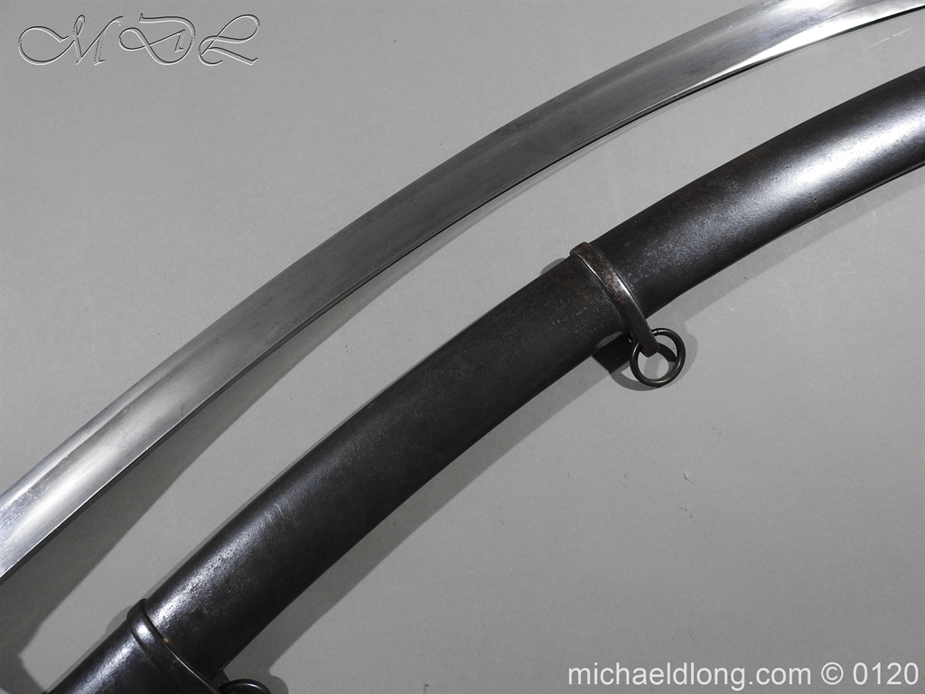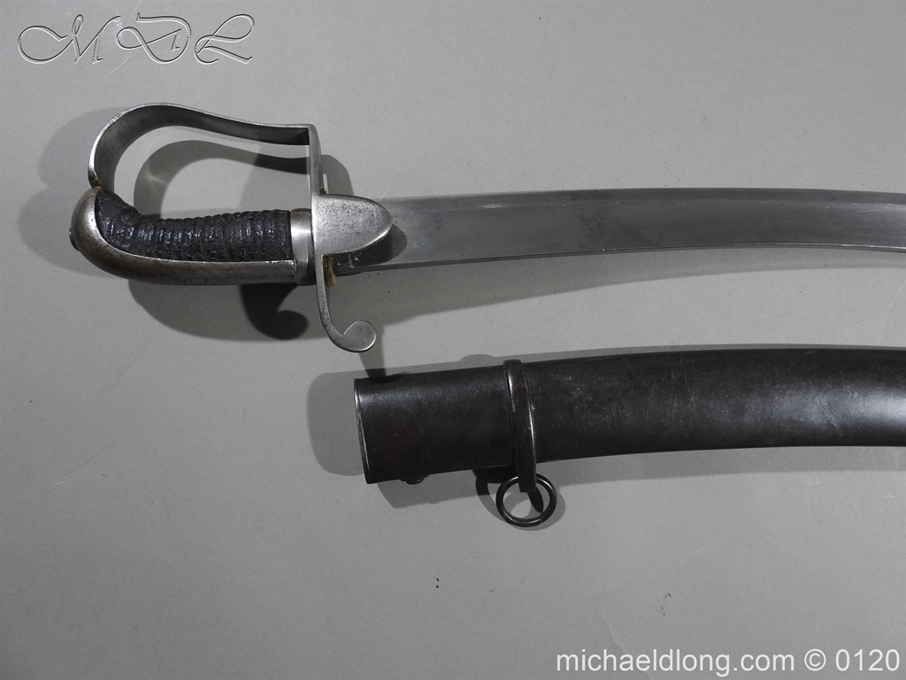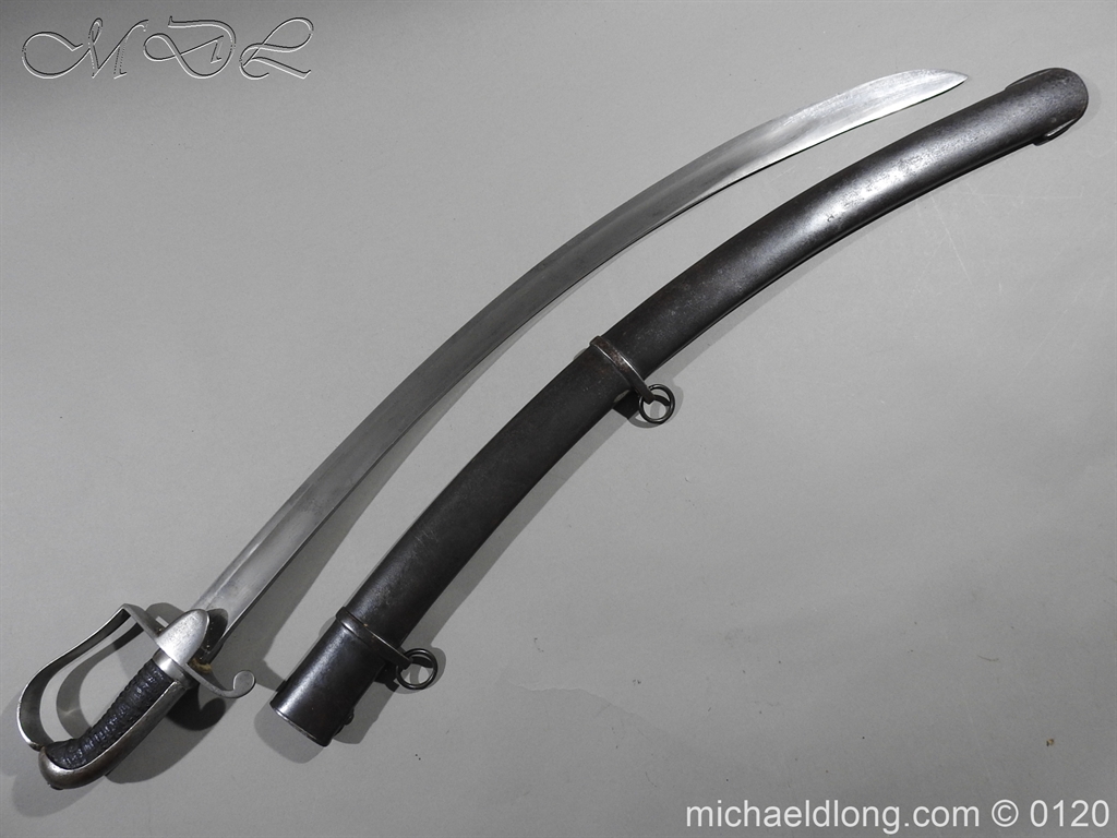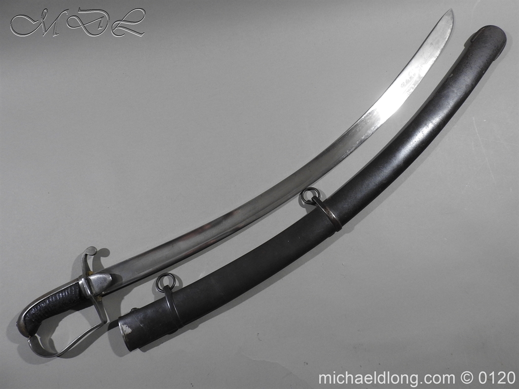 British 1796 Light Cavalry Sword by Egg regulation style steel hilt with leather bound grip however with an addition side slot please see images. The curved blade is clean and bright with the spin maker marked EGG. It is complete with steel scabbard with two loose rings again maker marked EGG over all length 95cm blade 82cm