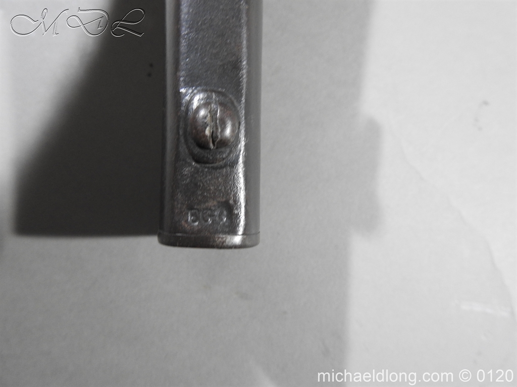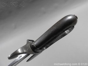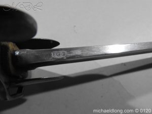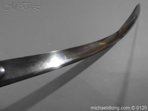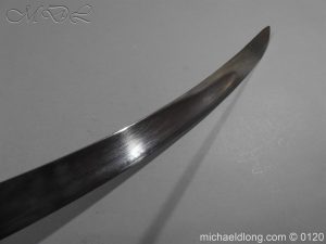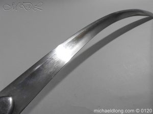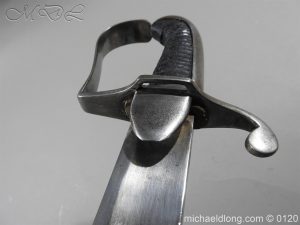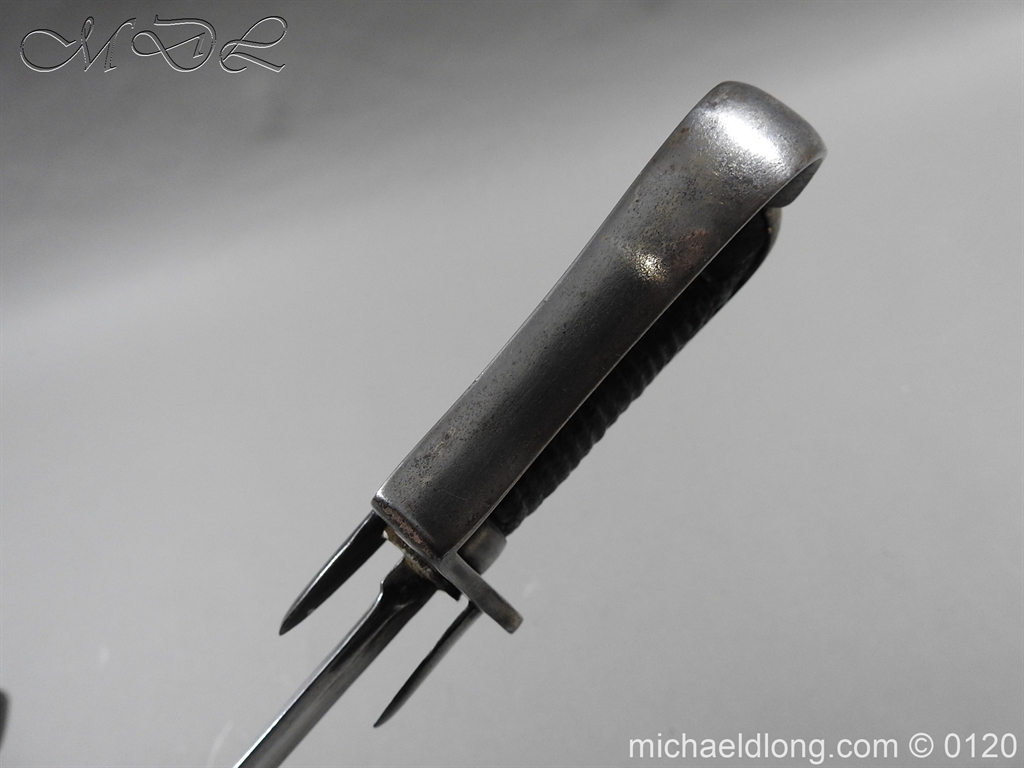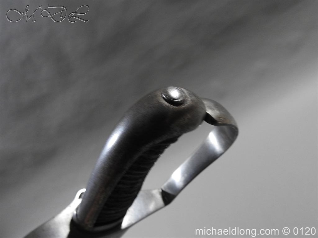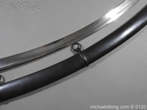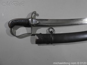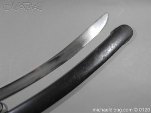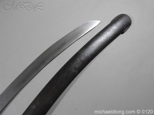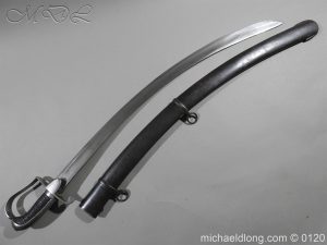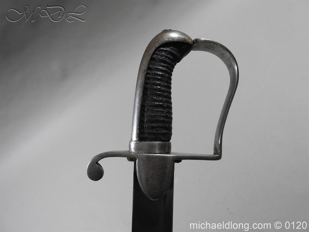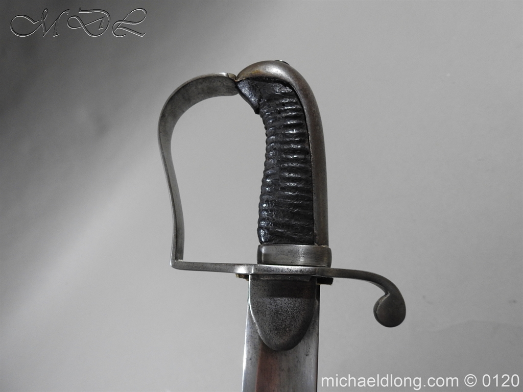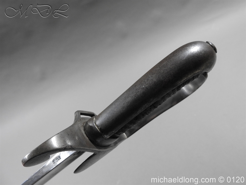 British 1796 Light Cavalry Sword by Egg regulation style steel hilt with leather bound grip however with an addition side slot please see images. The curved blade is clean and bright with the spin maker marked EGG. It is complete with steel scabbard with two loose rings again maker marked EGG over all length 95cm blade 82cm