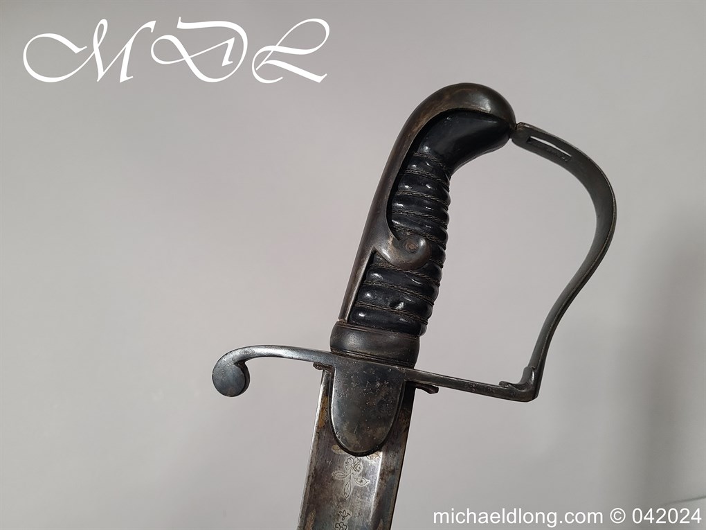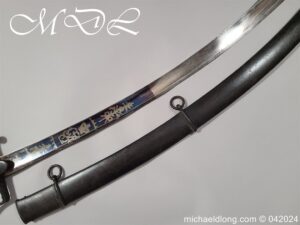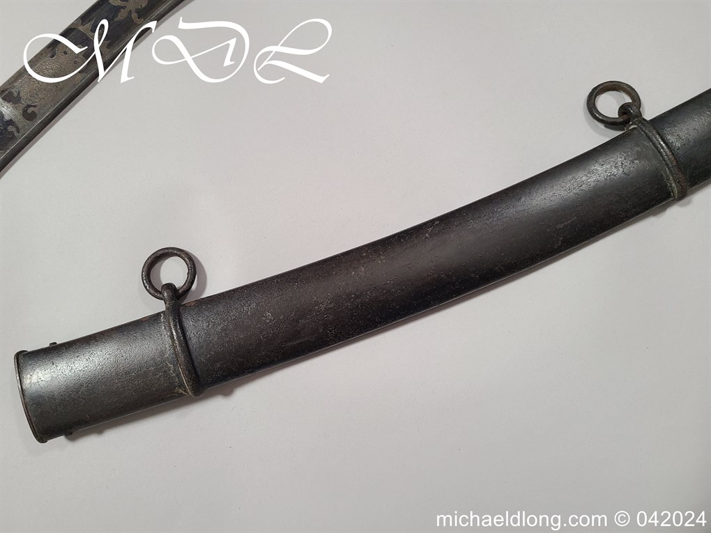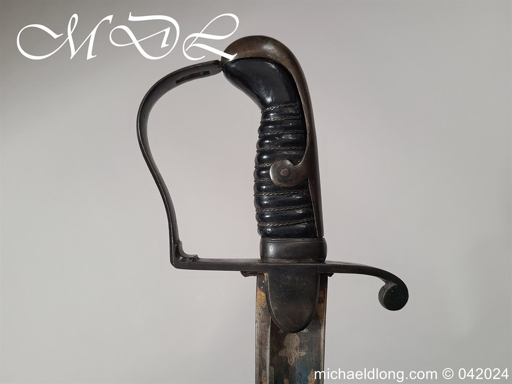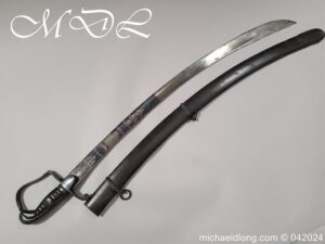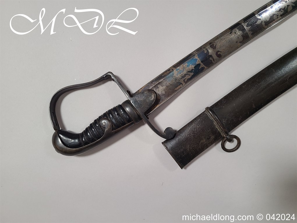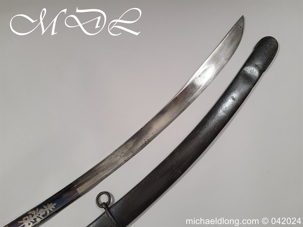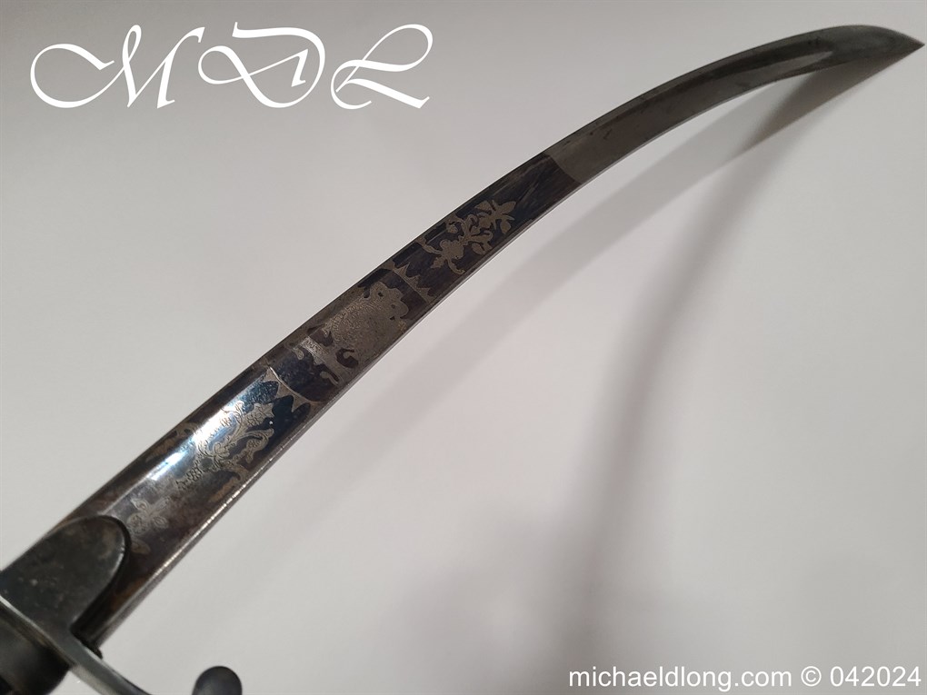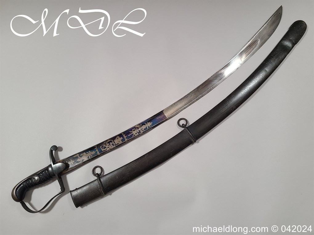 British 1796 Light Cavalry Sword by RUNKEL Solingen. Blue and gilt officers sword in very good condition with steel regulation hilt with leather grip secured by silver twisted wire. Regulation curved blade with blue and gilt decoration including G R and crown plus Royal Coat of Arms and floral panels, maker marked on the spine J J RUNKEL Solingen and complete with steel scabbard with two loose rings. Over all length 96cm the blade 83cm