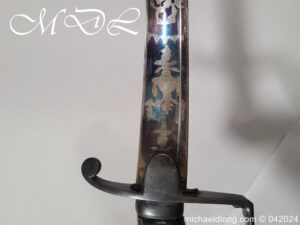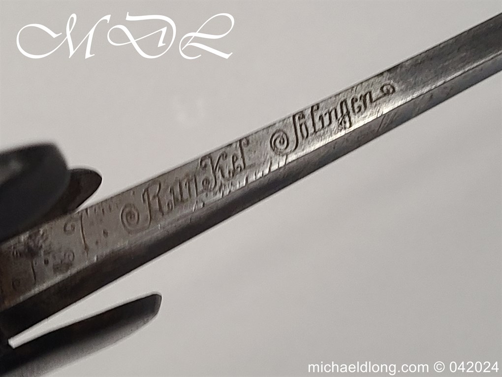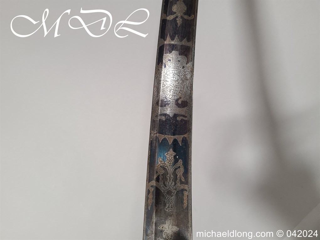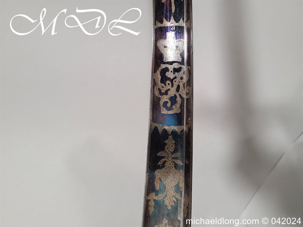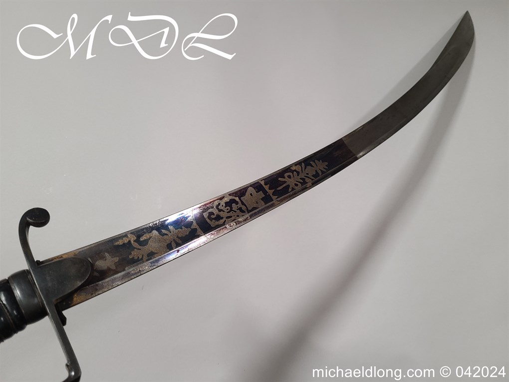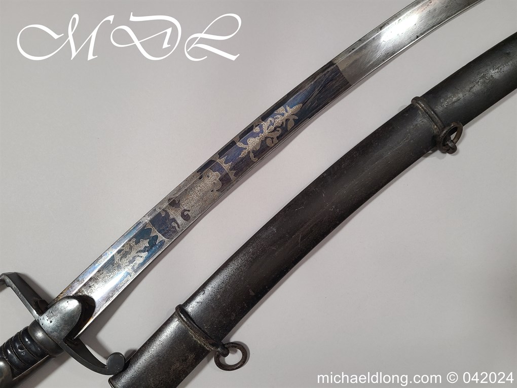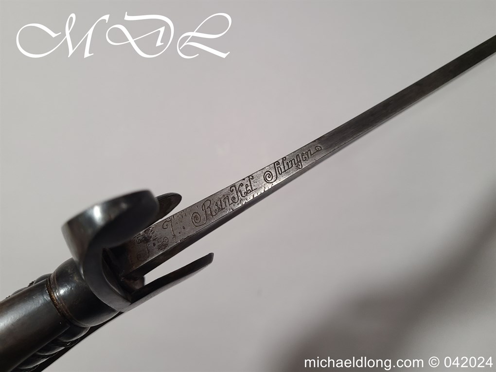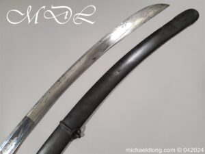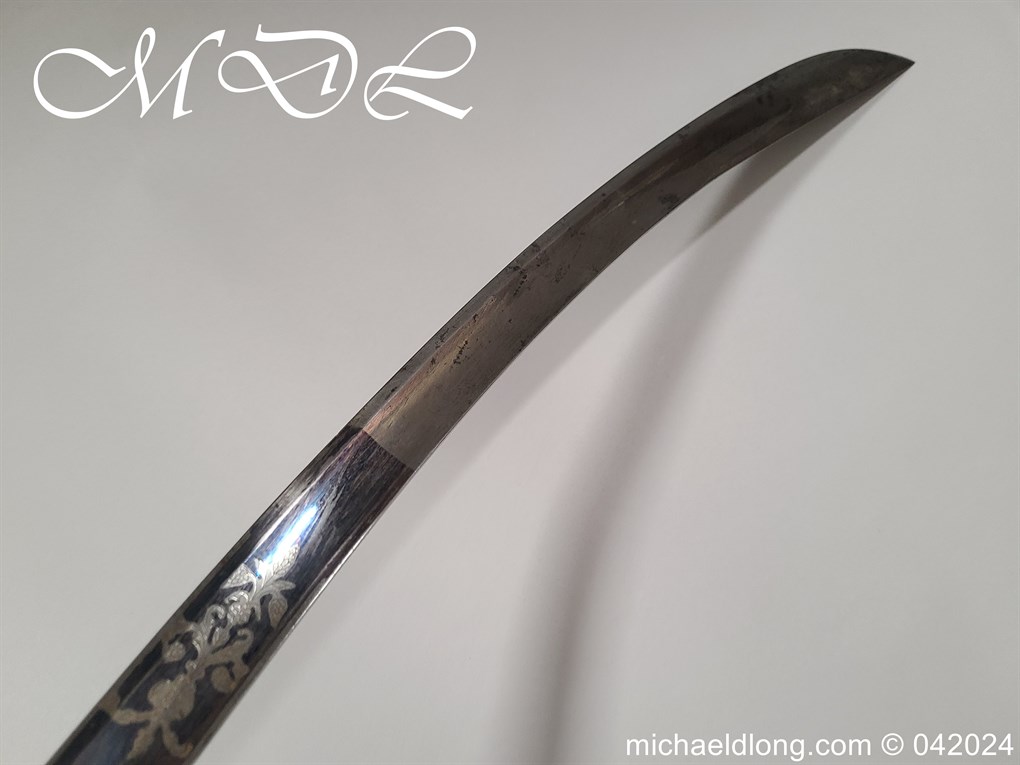 British 1796 Light Cavalry Sword by RUNKEL Solingen. Blue and gilt officers sword in very good condition with steel regulation hilt with leather grip secured by silver twisted wire. Regulation curved blade with blue and gilt decoration including G R and crown plus Royal Coat of Arms and floral panels, maker marked on the spine J J RUNKEL Solingen and complete with steel scabbard with two loose rings. Over all length 96cm the blade 83cm