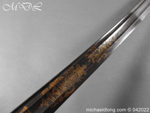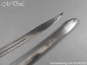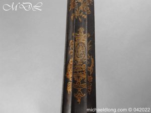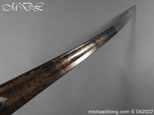 British 1796 light cavalry officer’s sword by Osbourn and Gunby, regulation hilt with leather grip and shield shaped langets. The blade blue and gilt with trophies of arms crown over GR and WARRented. Mounted hussar, royal crest roses and thistles with OSBOURN & GUNBY sword Cutters to His Majesty, the Board of Ordnance and the Honourable East India Company. Complete with steel scabbard with small shoe to match the spear point overall length 96cm blade 84cm an extremely rare and unusual 1796 light cavalry sword